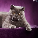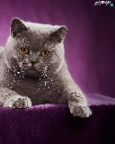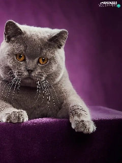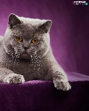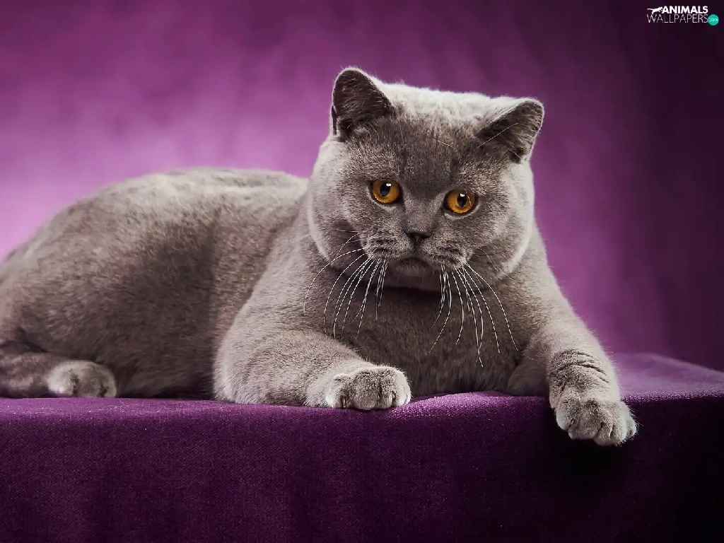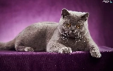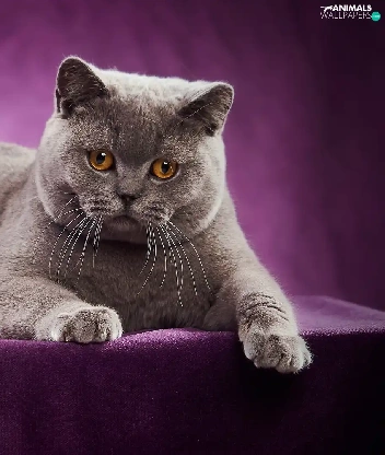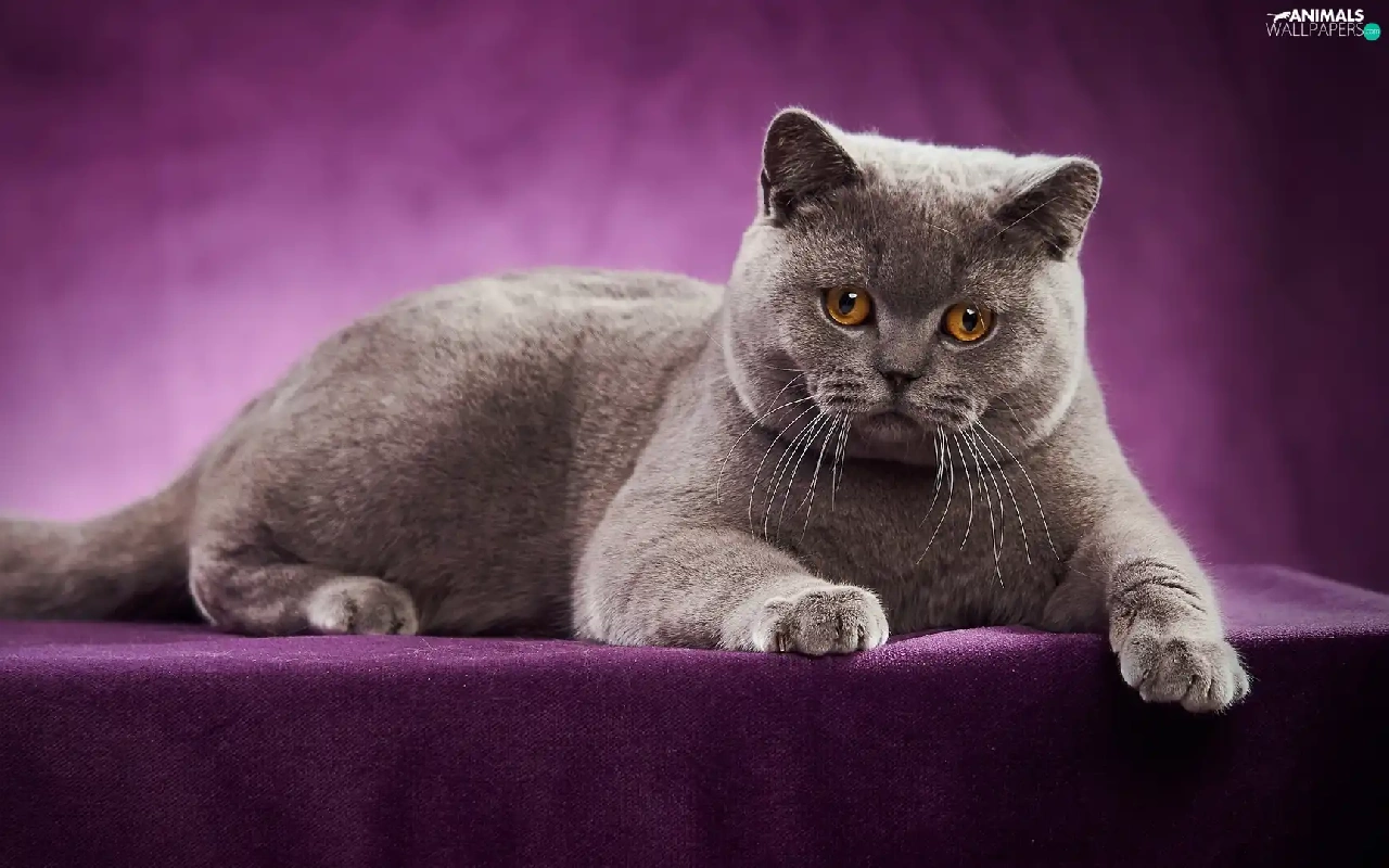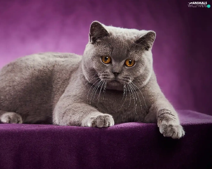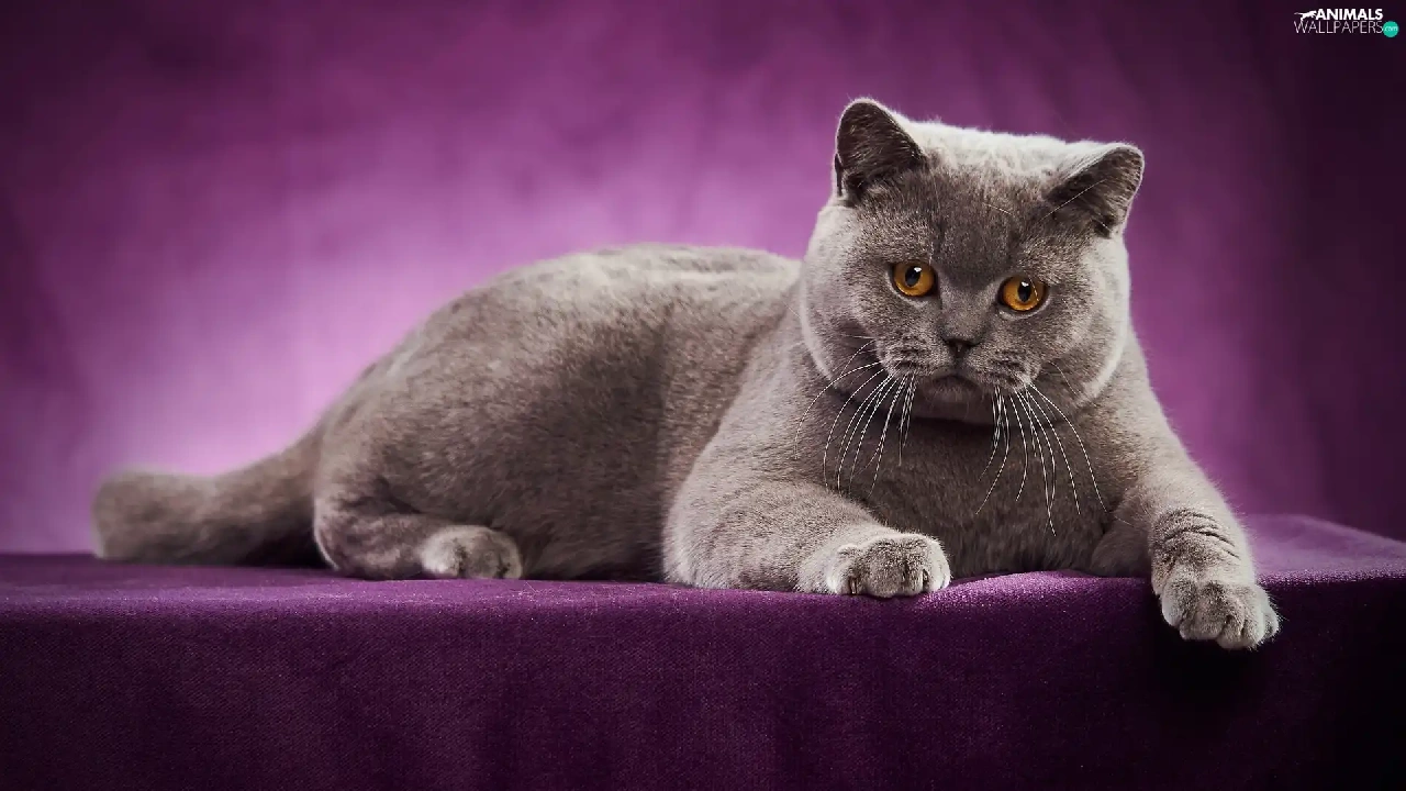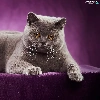 purple background, lying, British Shorthair Cat