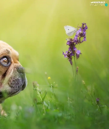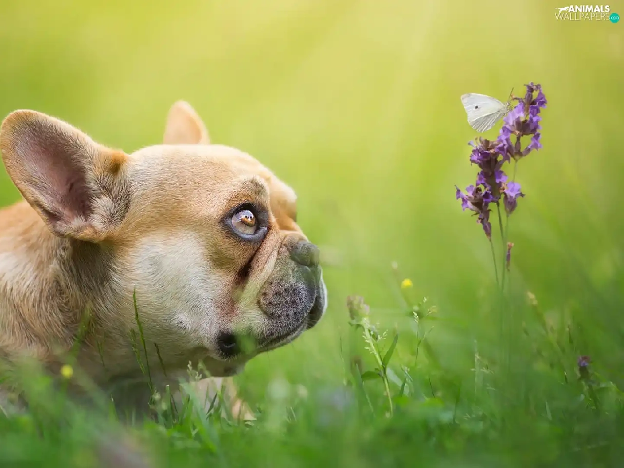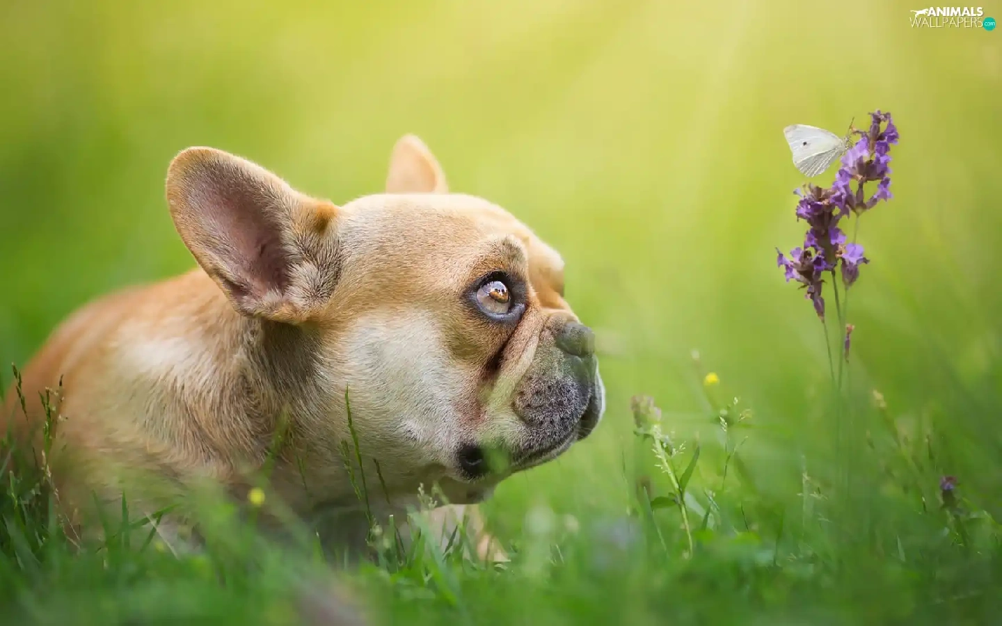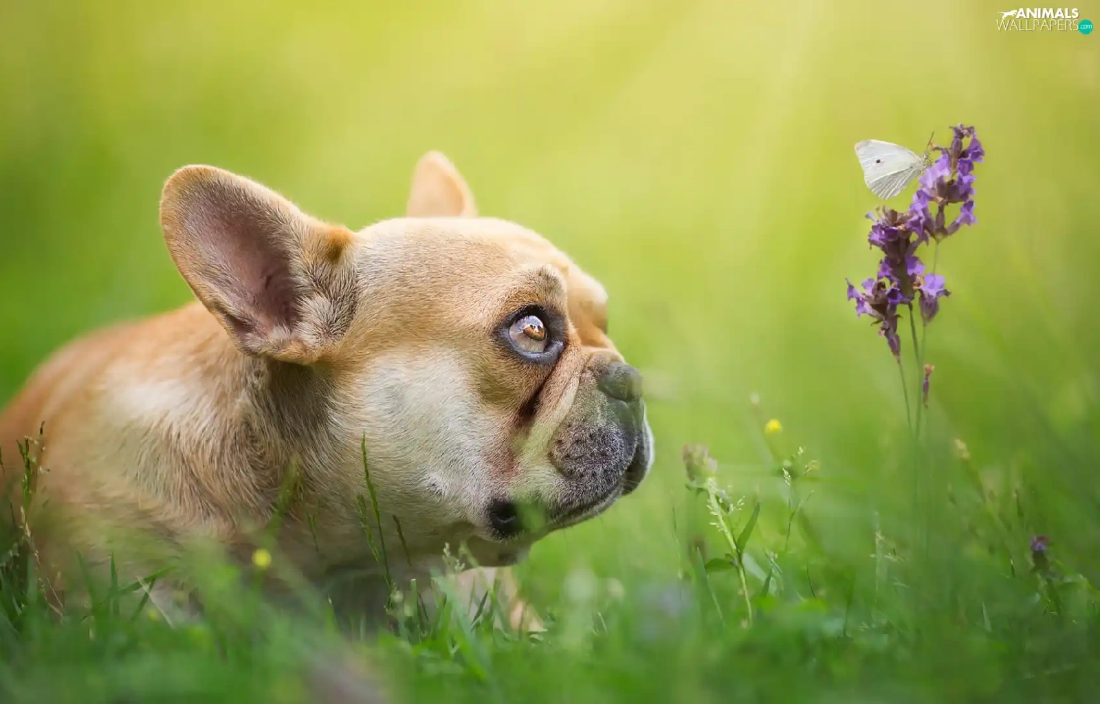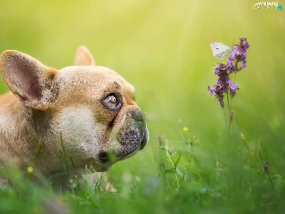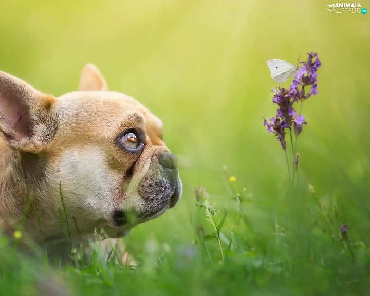 Colourfull Flowers, butterfly, Brown, Puppy, French Bulldog