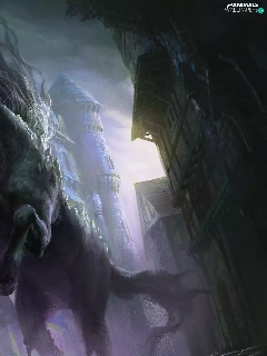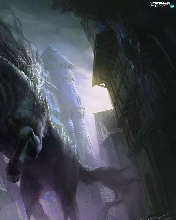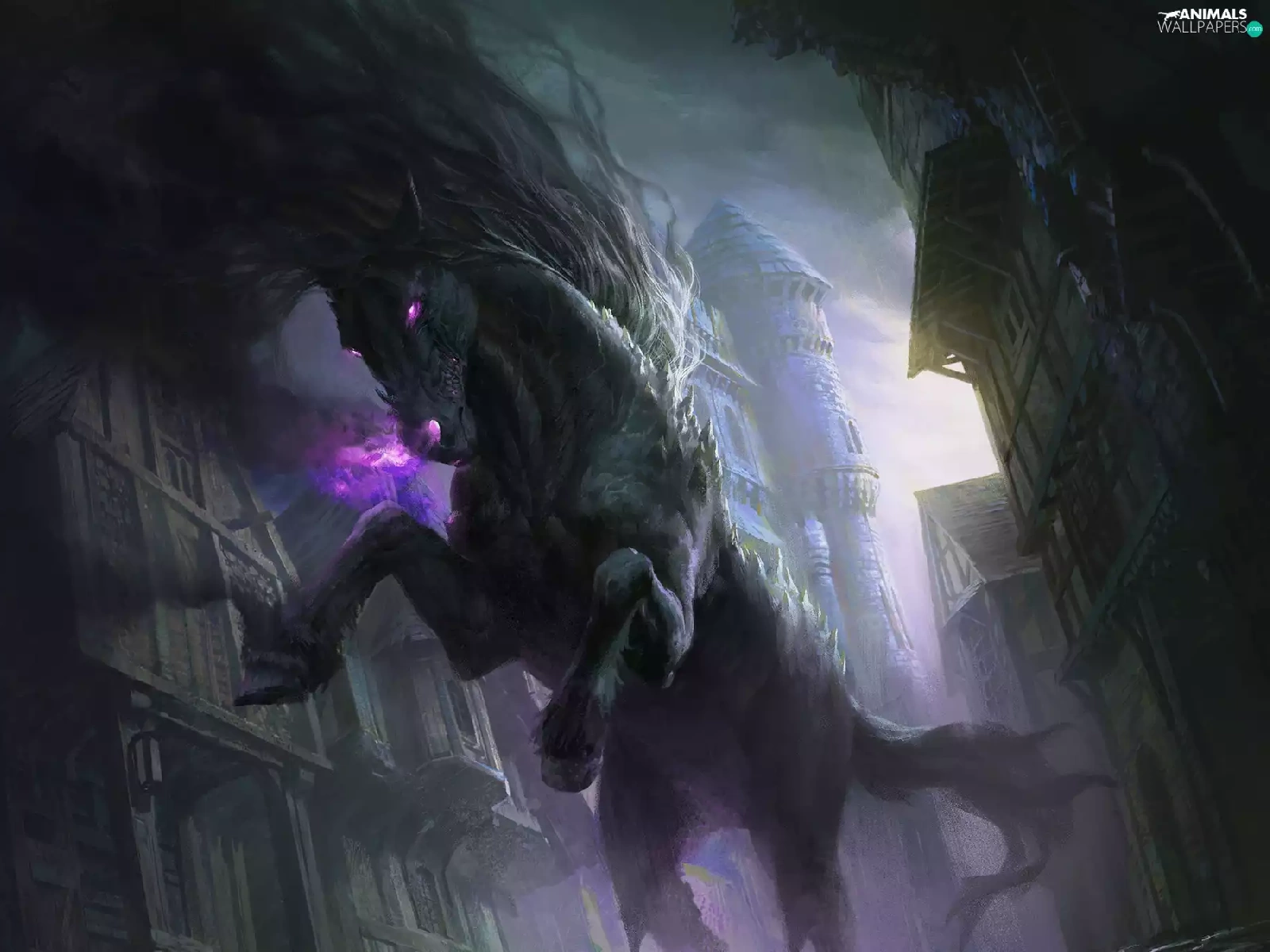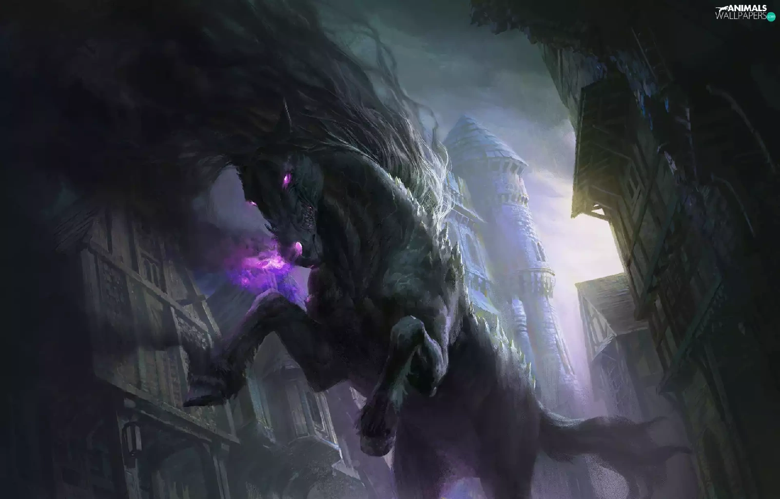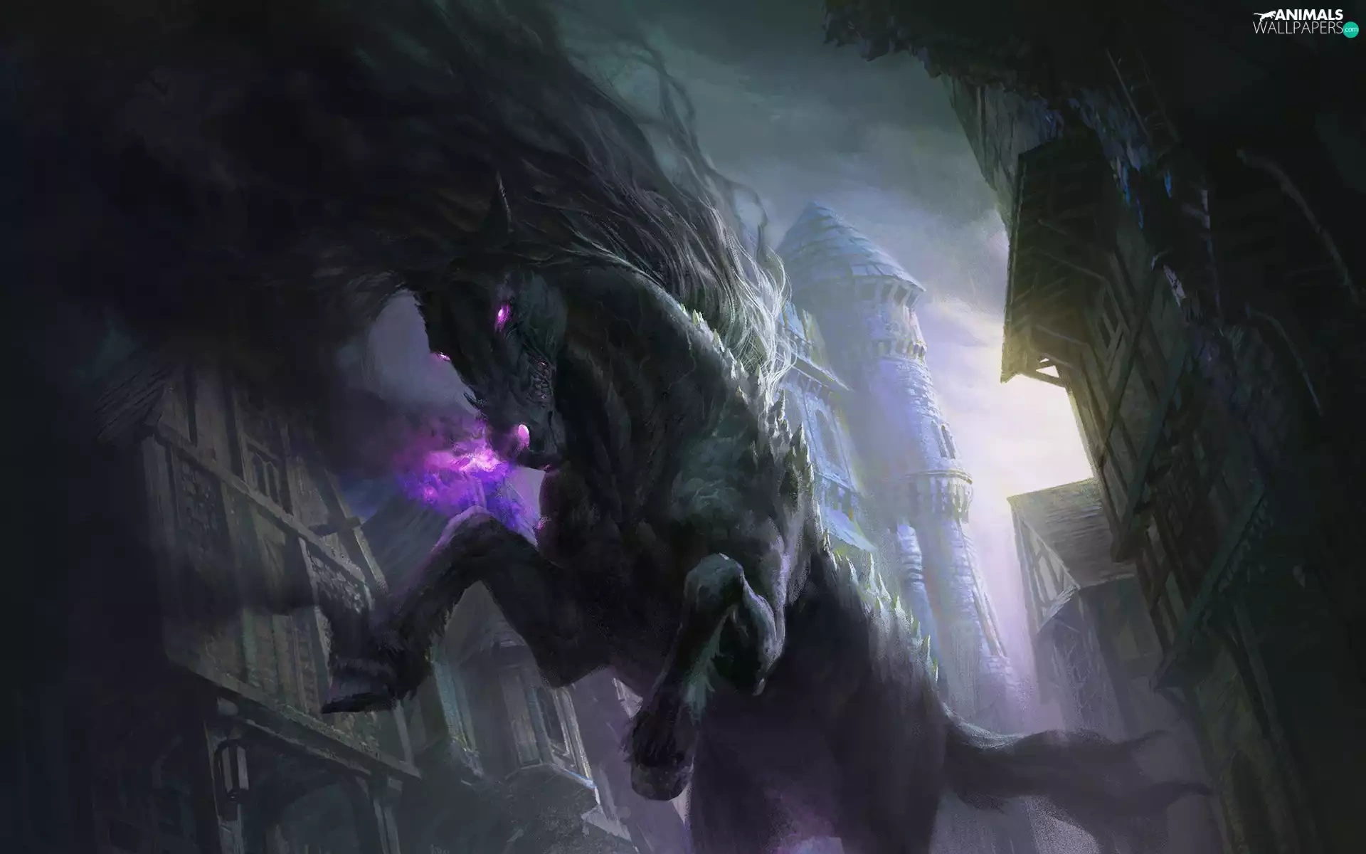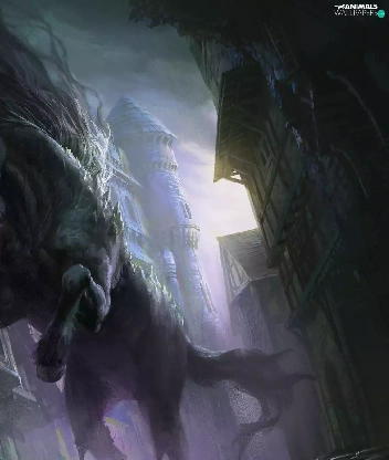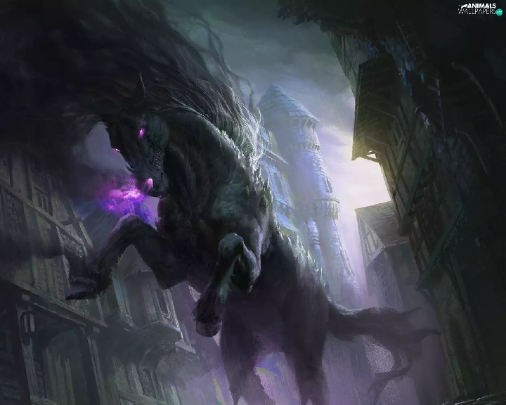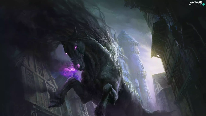 Eyes, buildings, Horse, glowing, fantasy