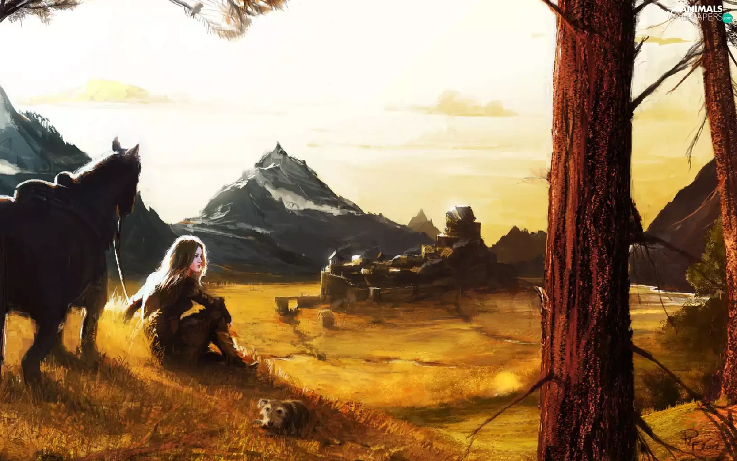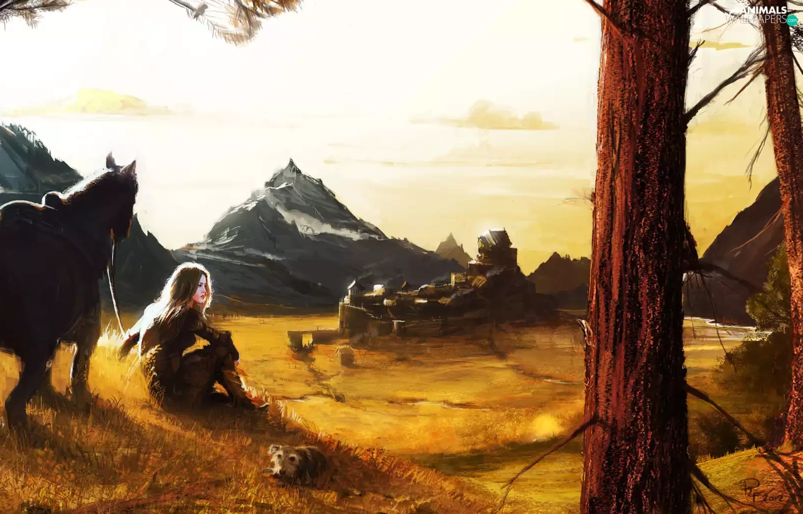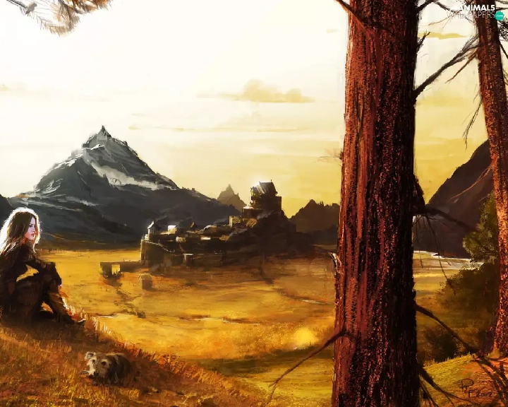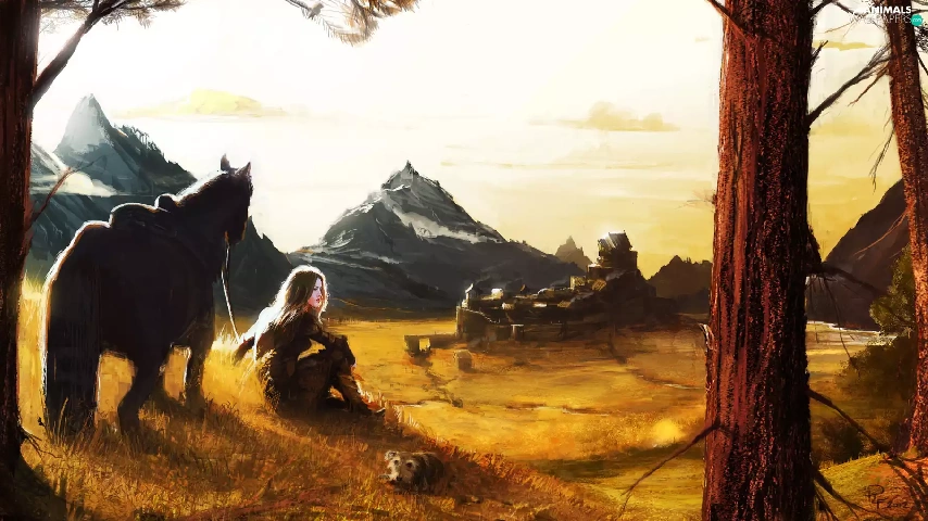 Horse, buildings, Mountains, girl, picture