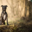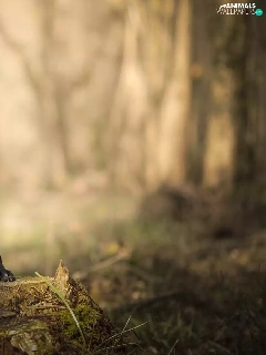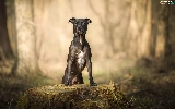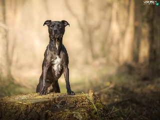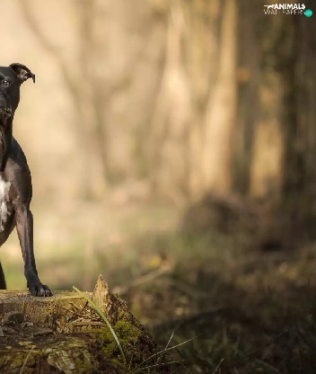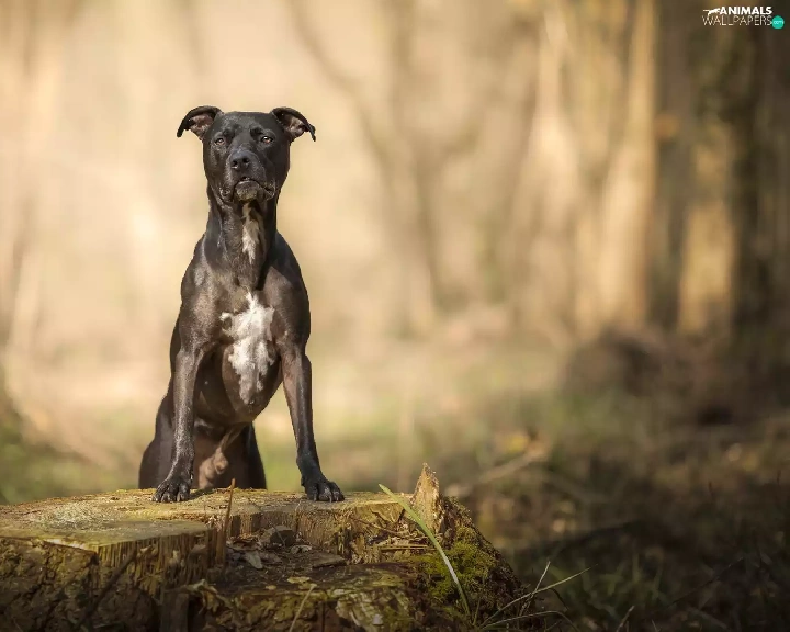trees, viewes, Pit Bull Terrier, trunk, dog
