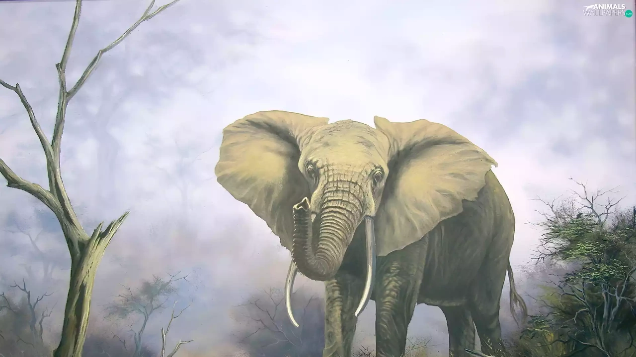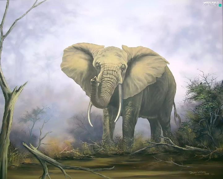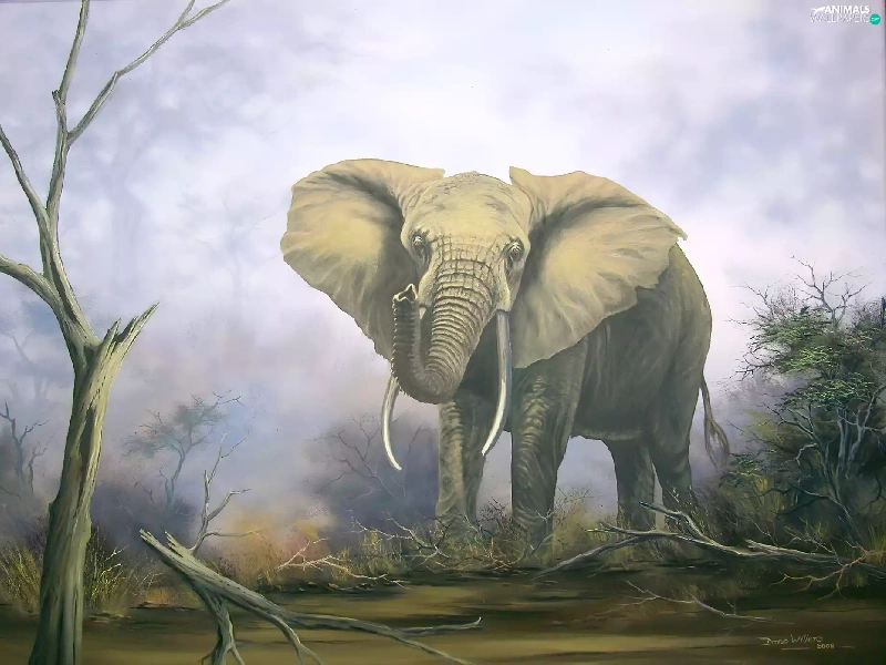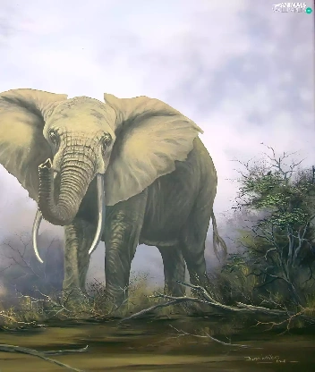 viewes, Bushes, dry, trees, Elephant