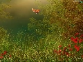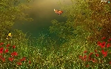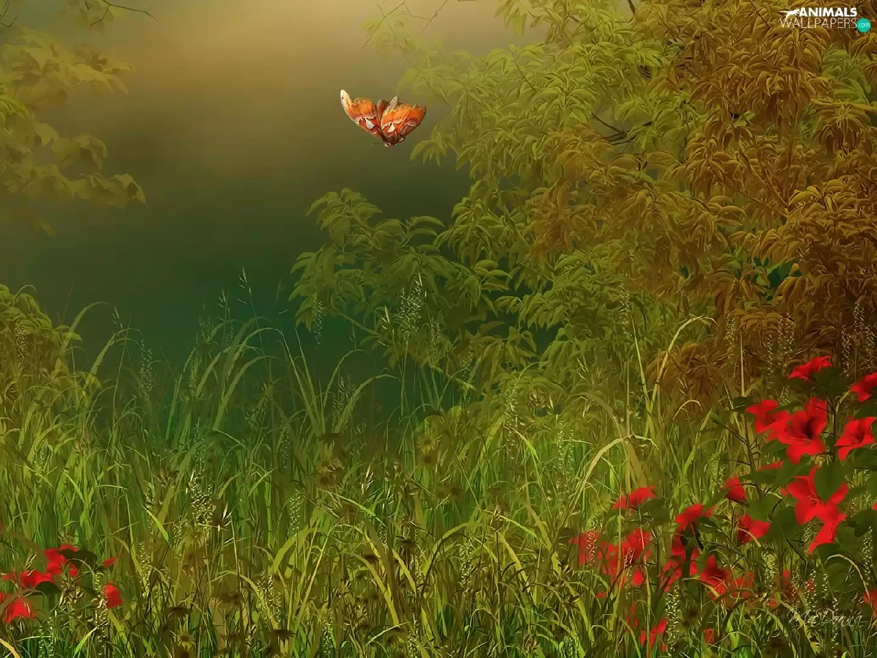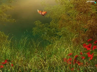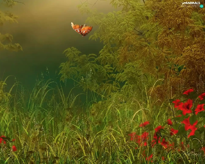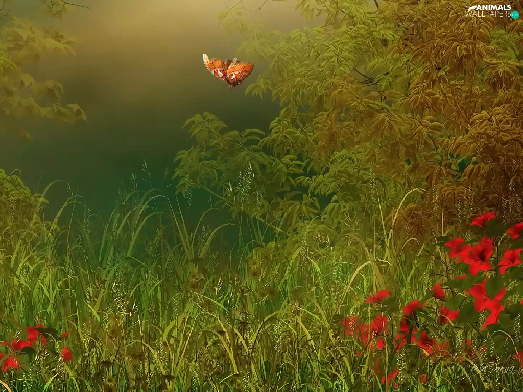 graphics, lilies, grass, butterflies