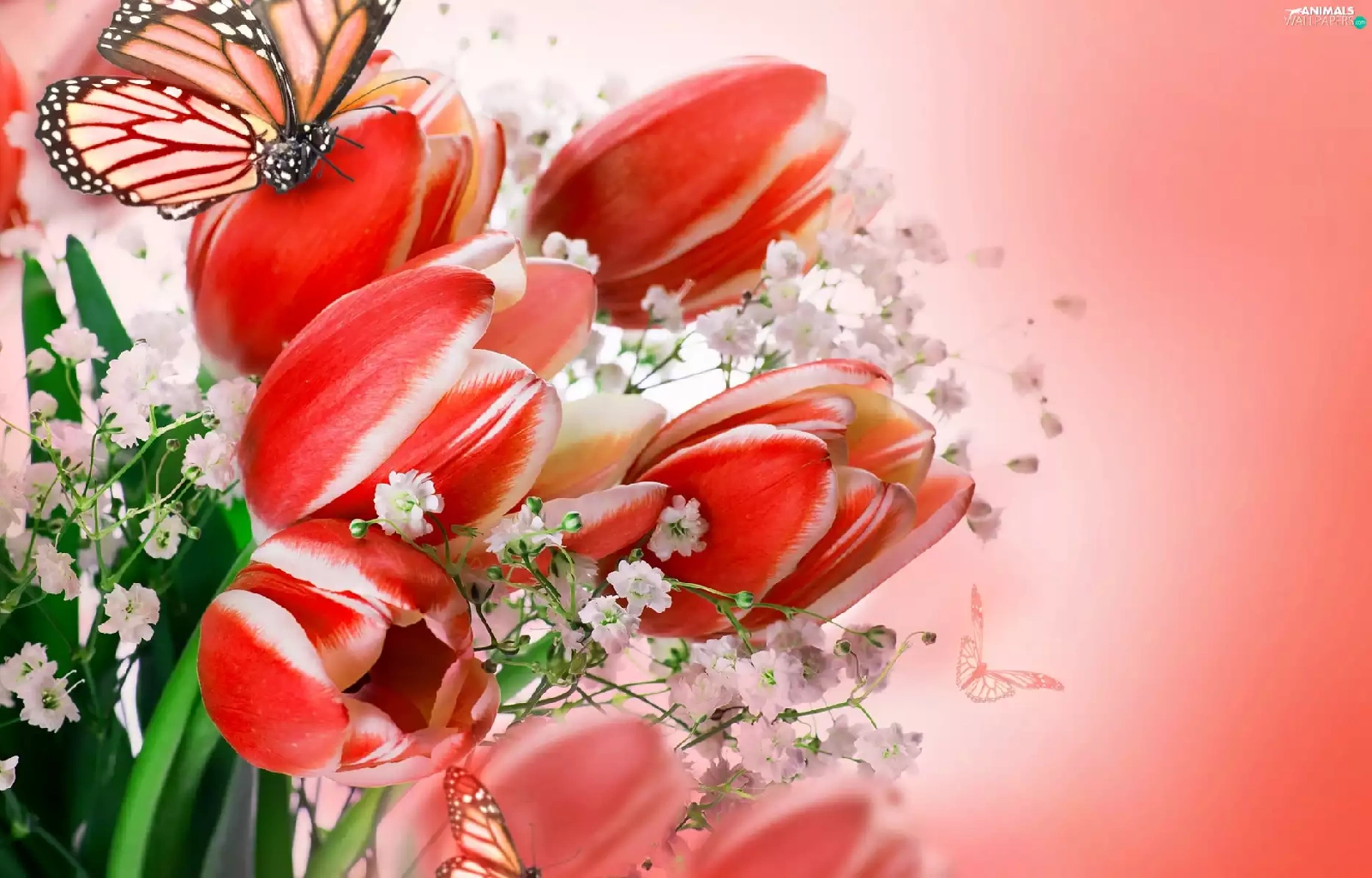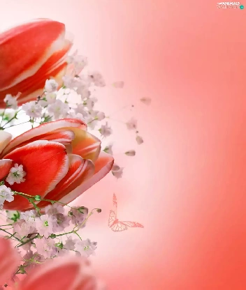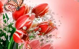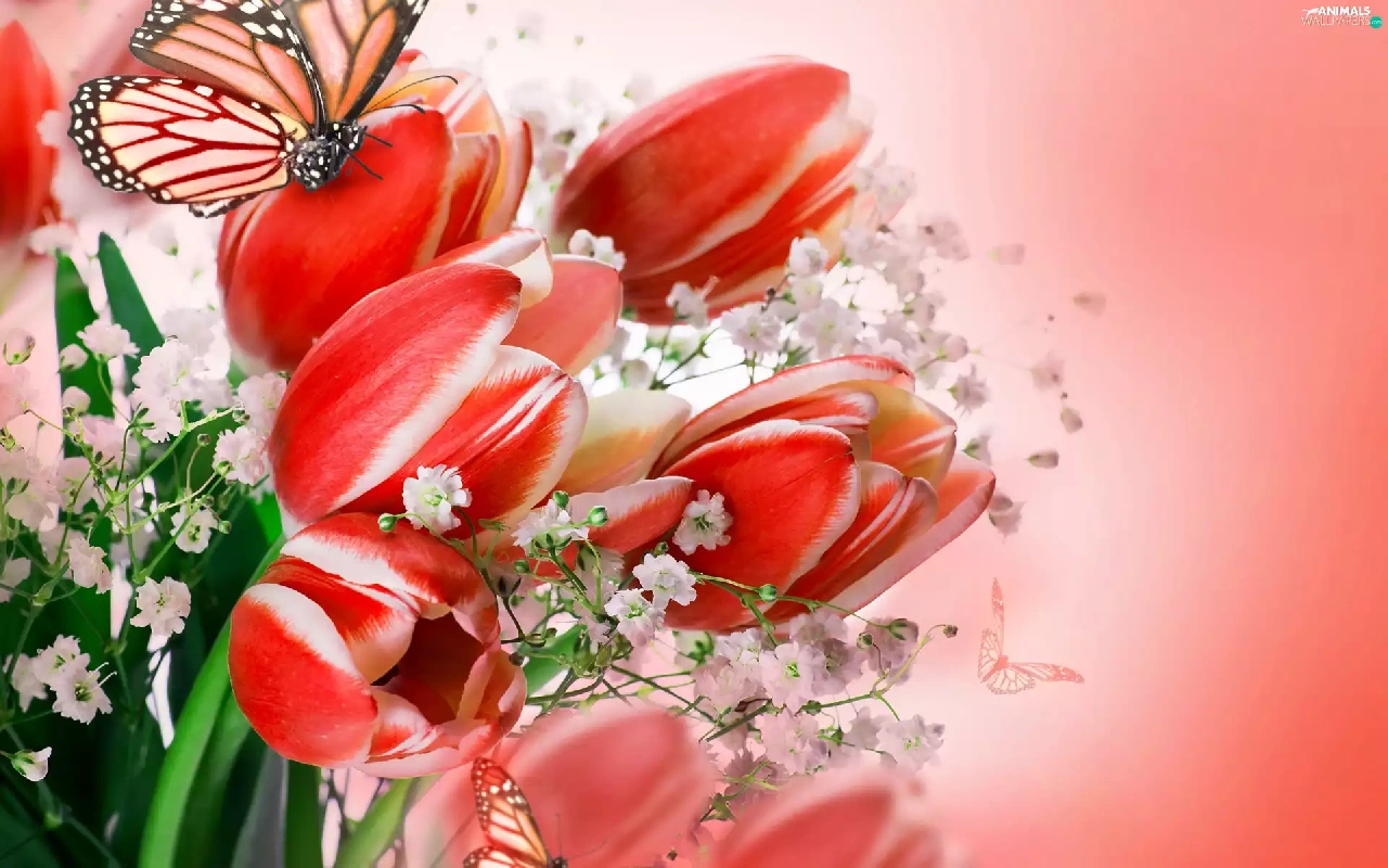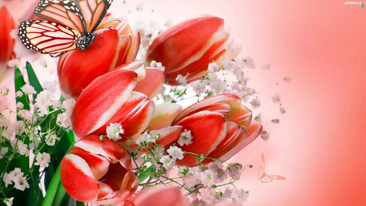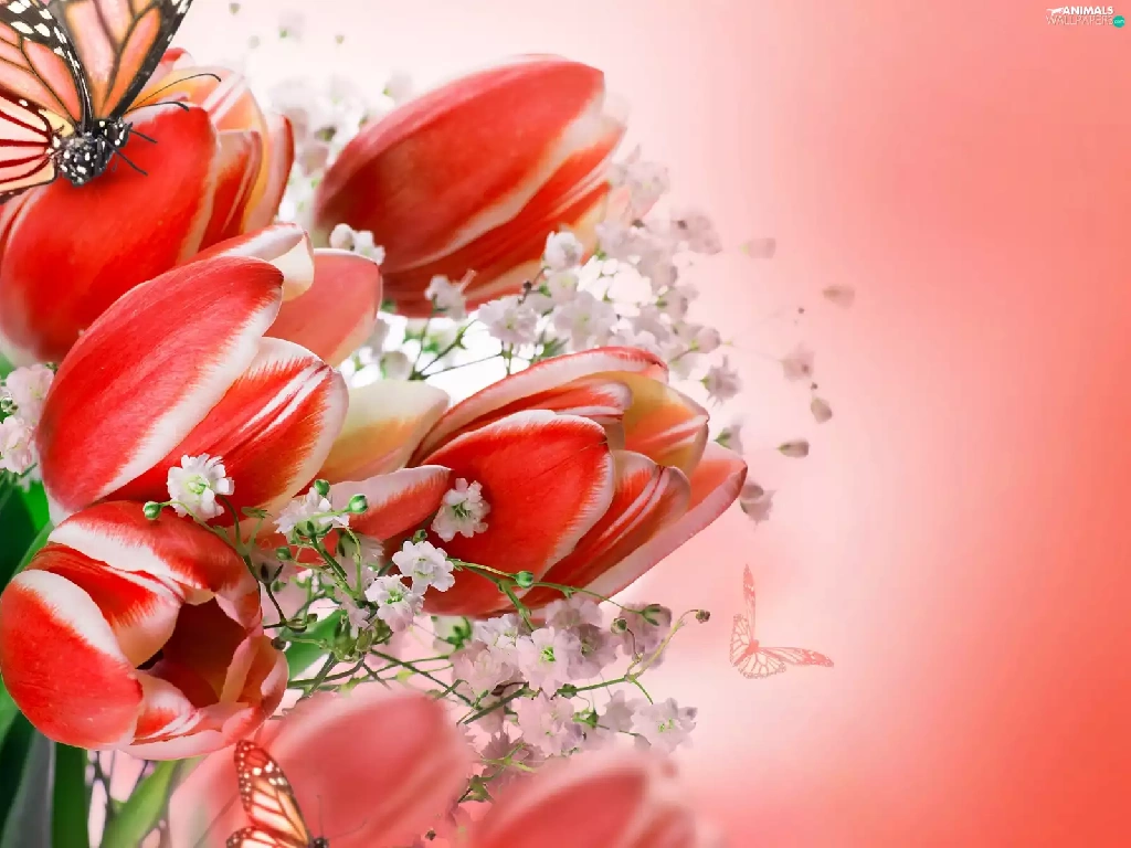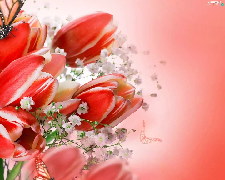 butterflies, bouquet, tulips