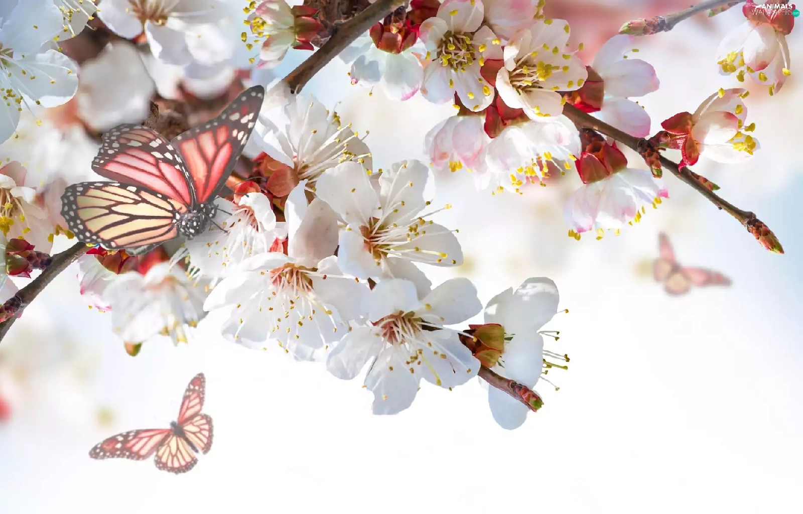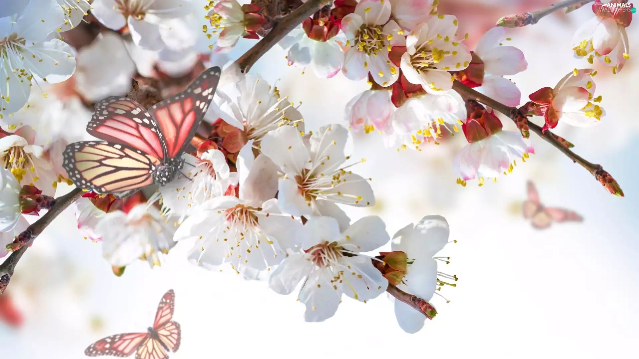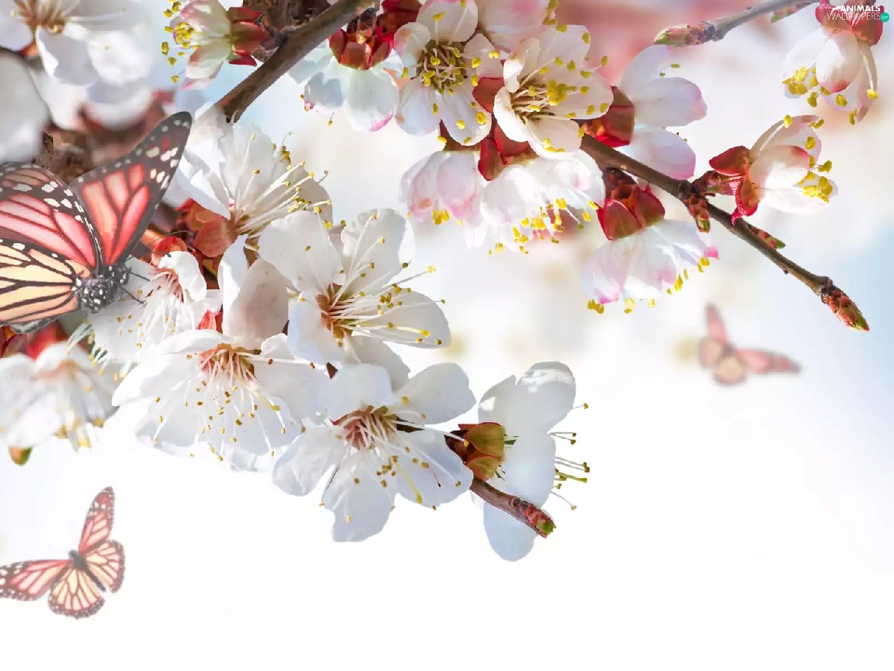 Bloom, trees, Flowers, butterflies, Twigs, viewes