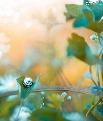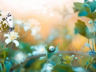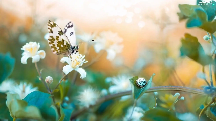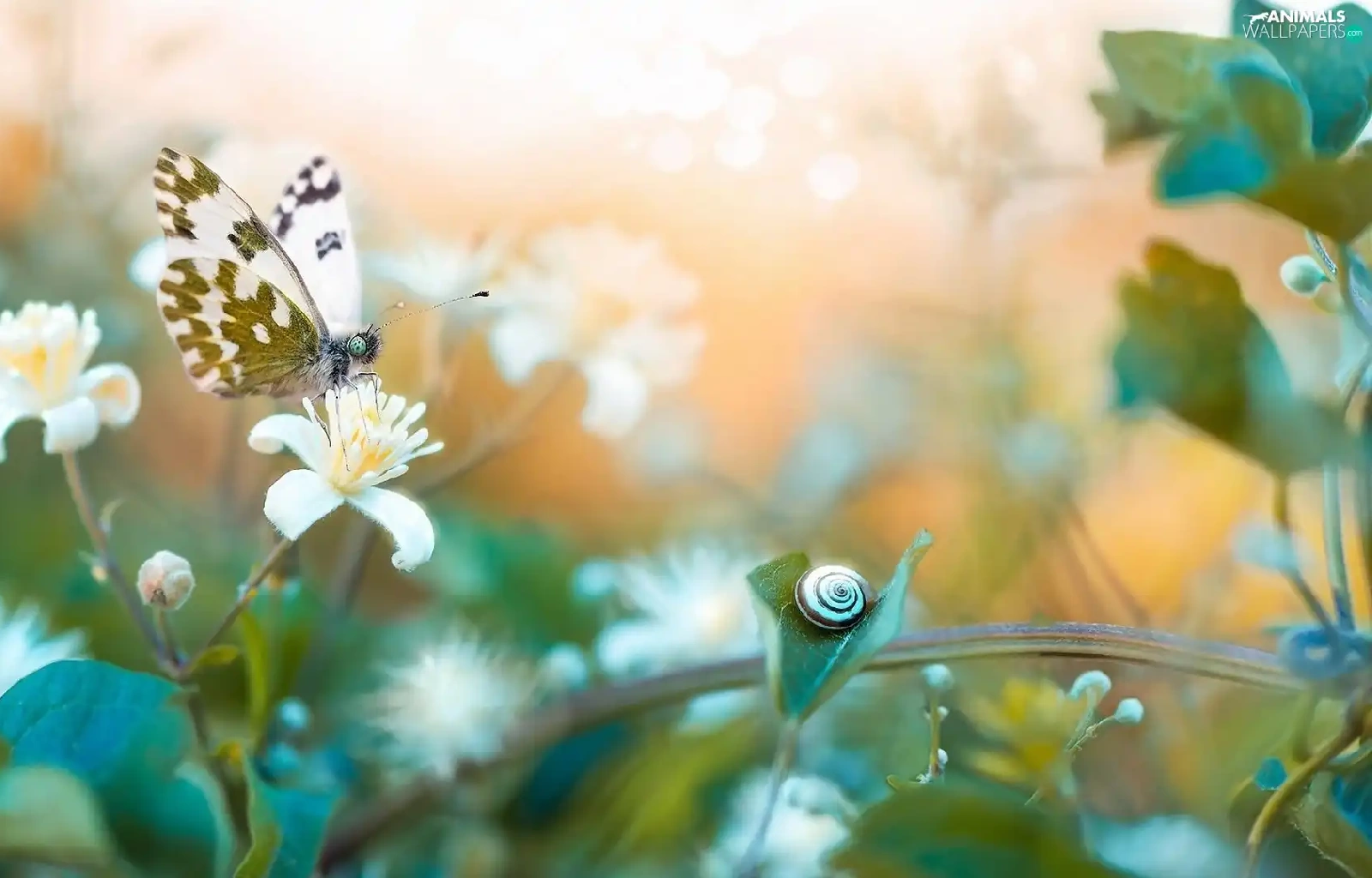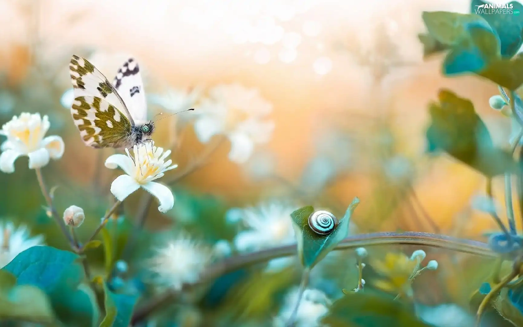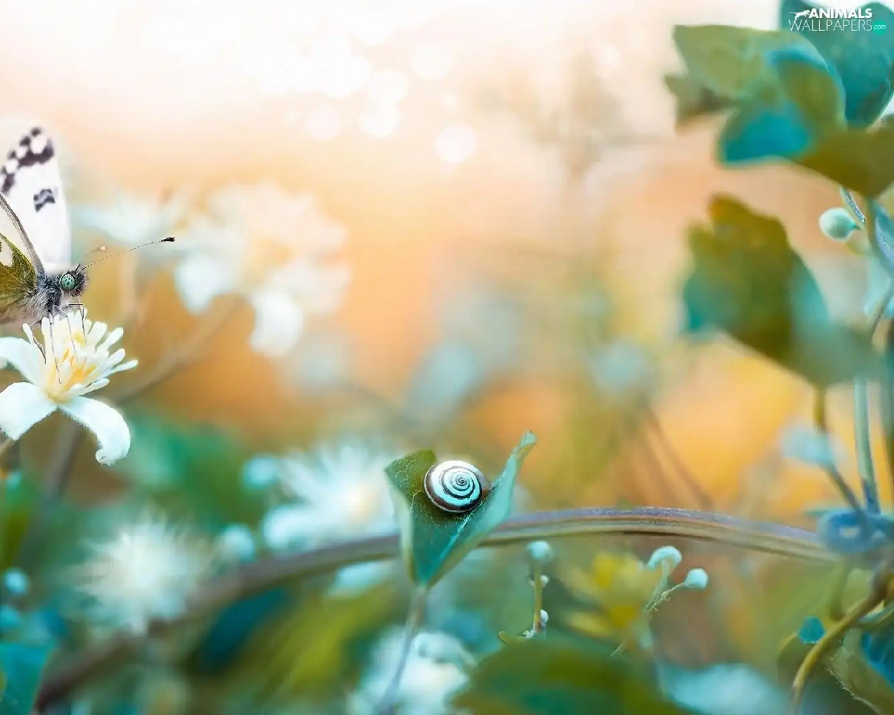 snail, blurry background, butterfly, Bielinek Rukiewnik, Flowers