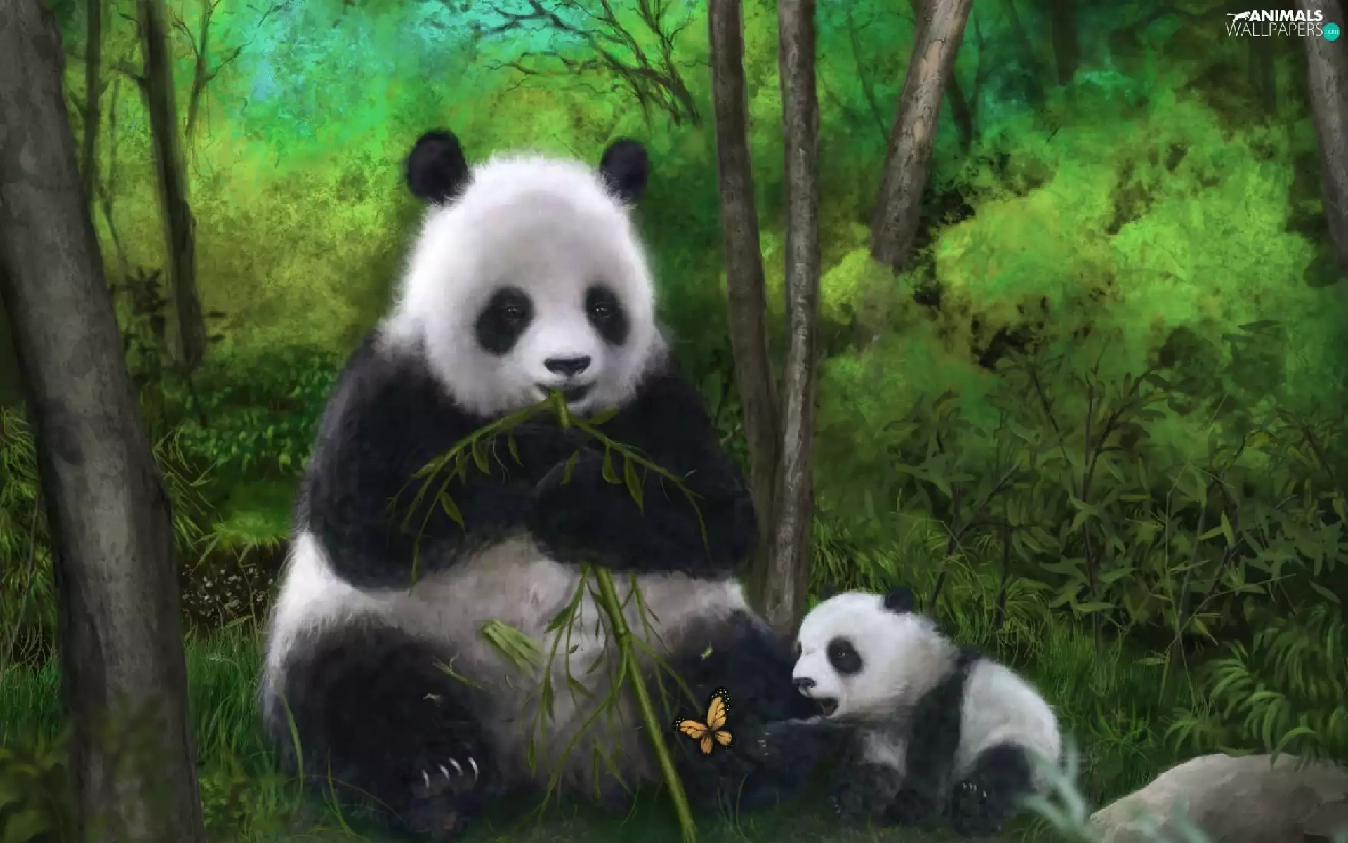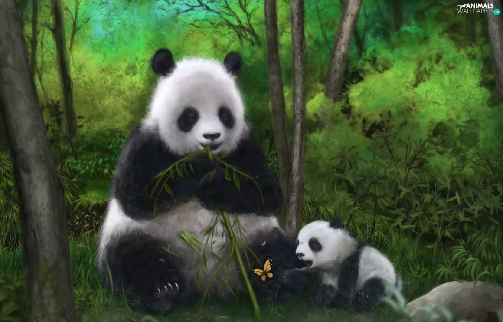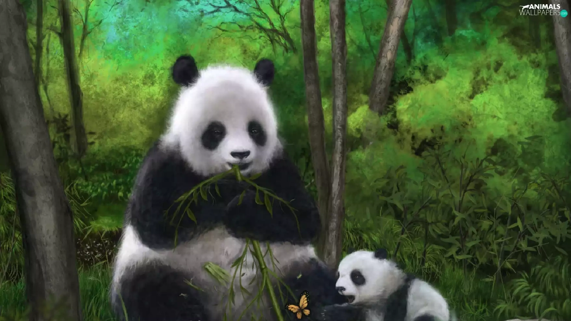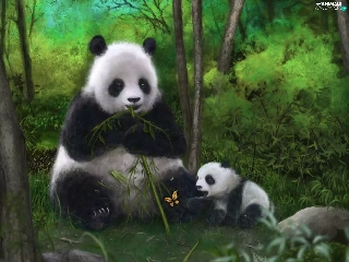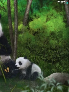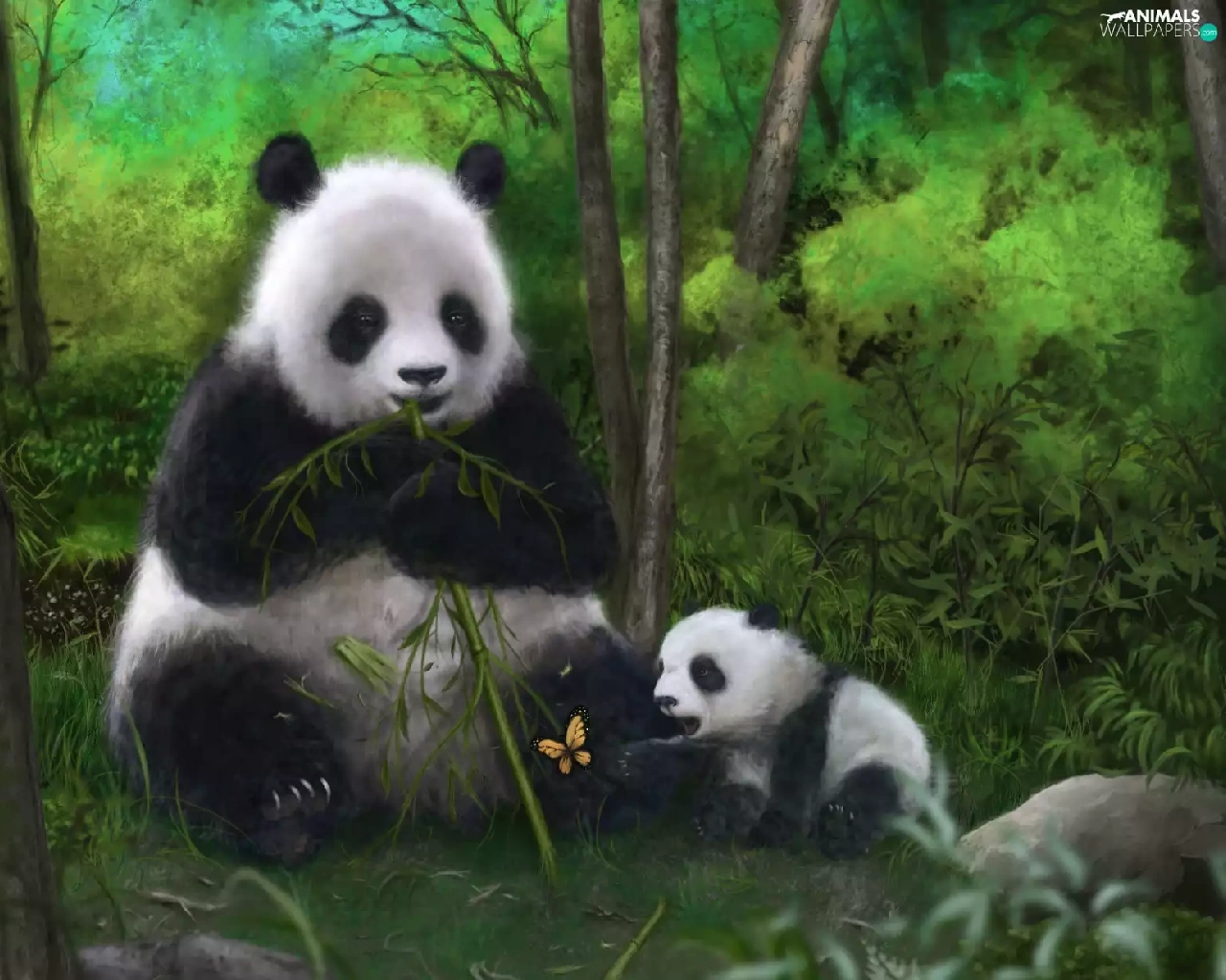 butterfly, pandas, bamboo