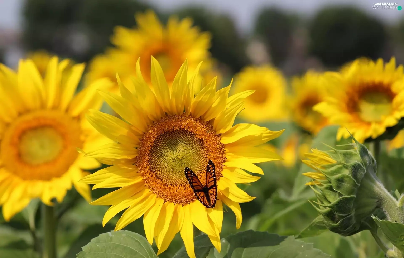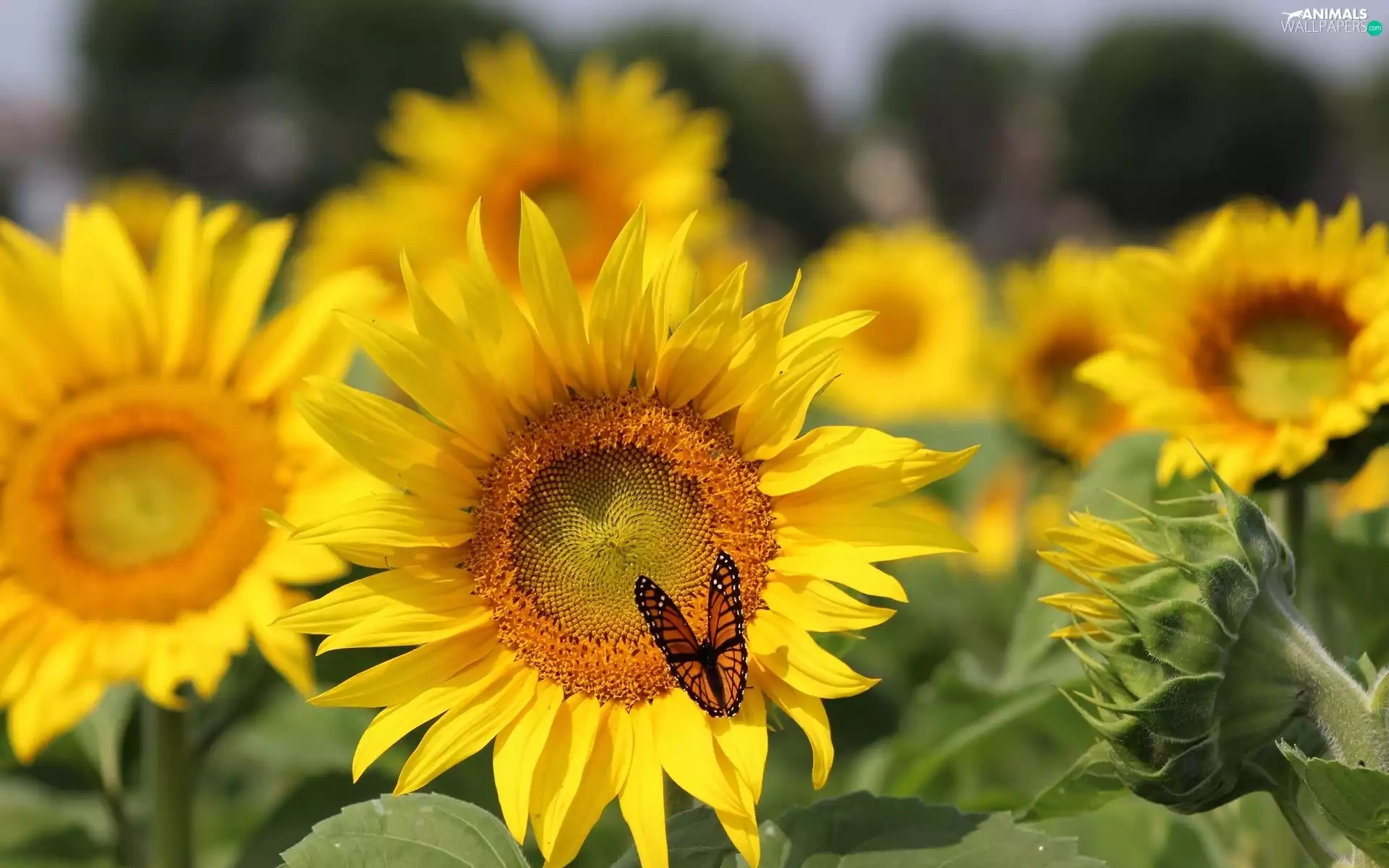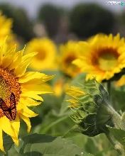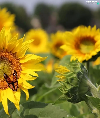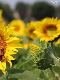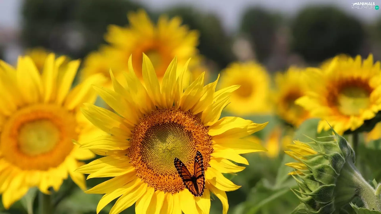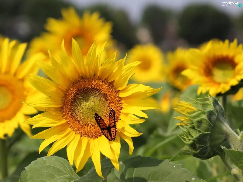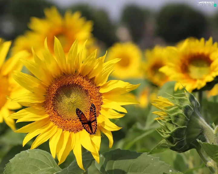 butterfly, Flowers, sunflowers