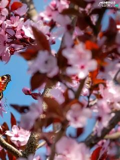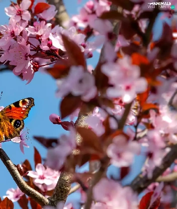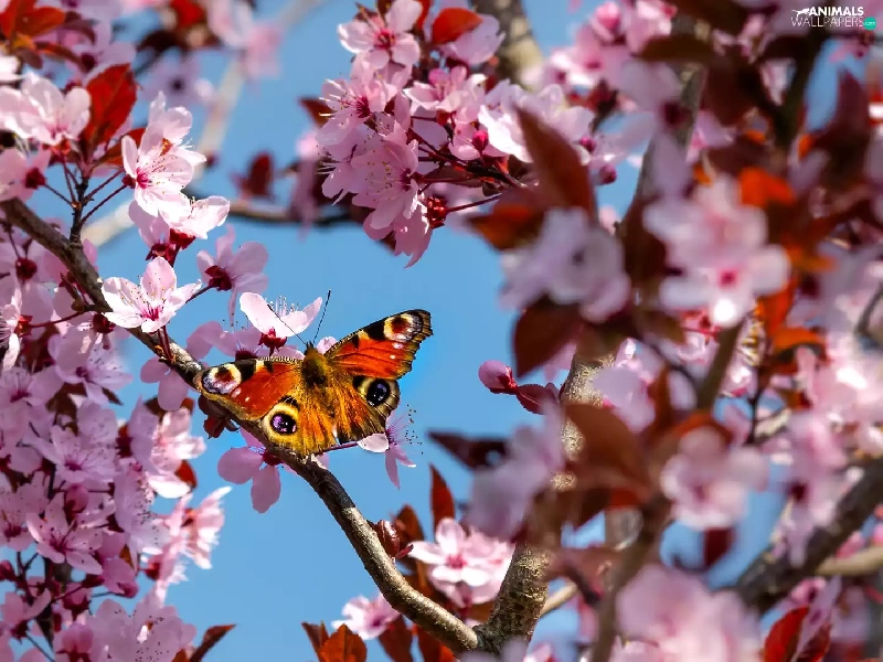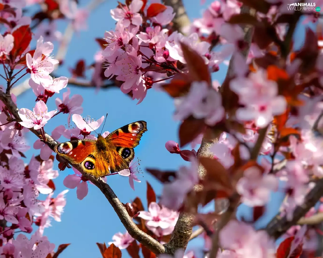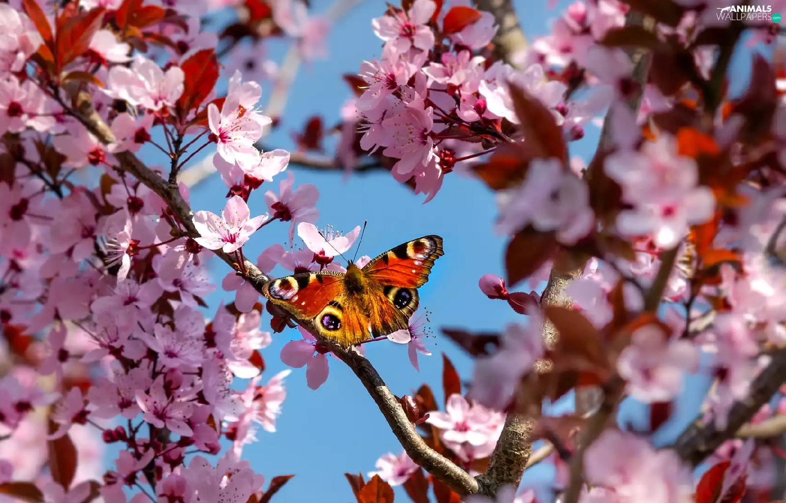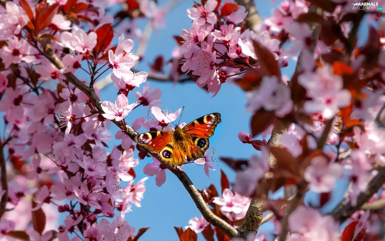 Blossoming, Fruit Tree, butterfly, Peacock, cherry, Twigs