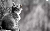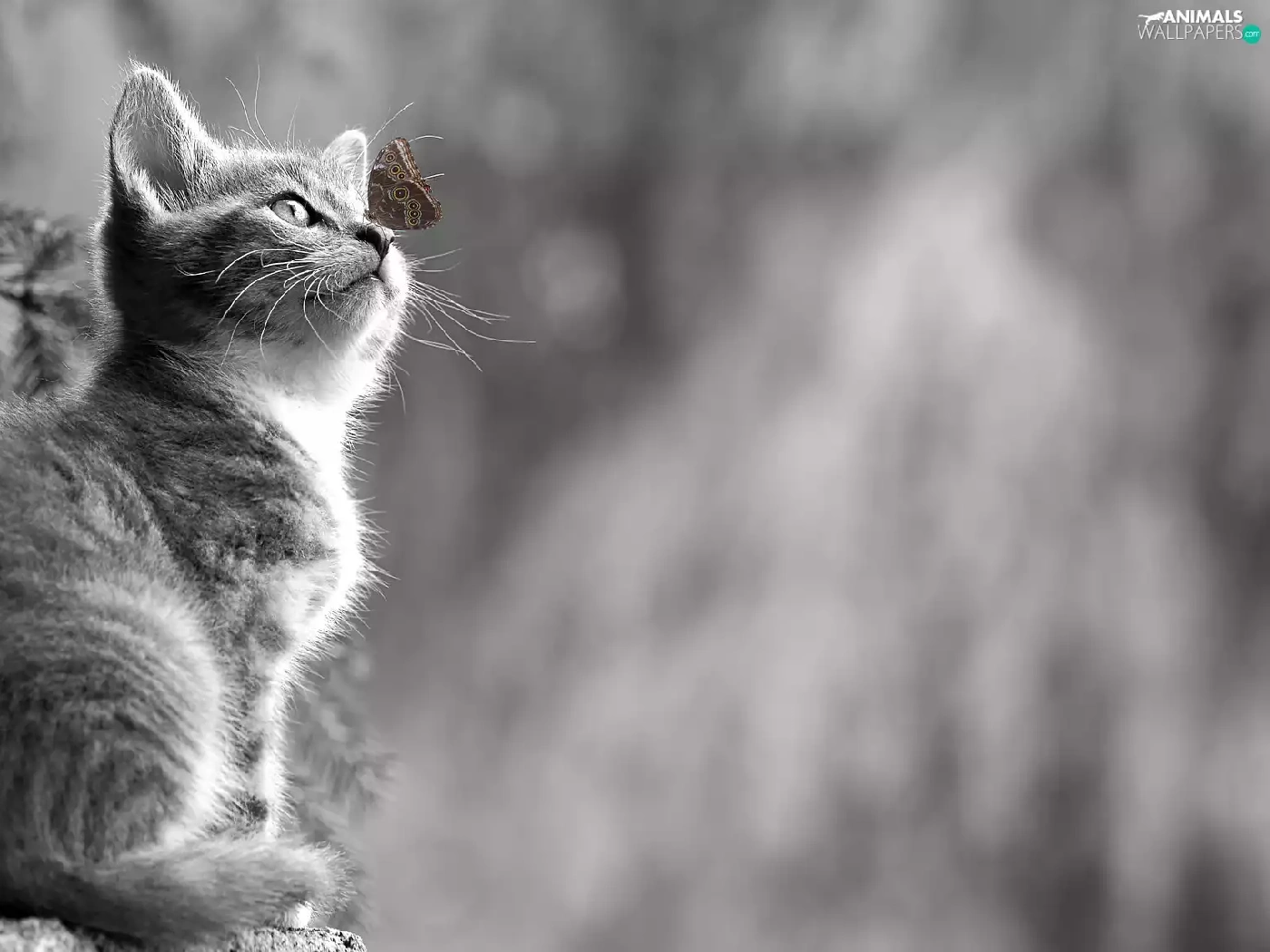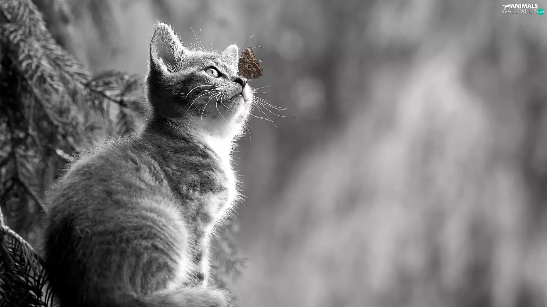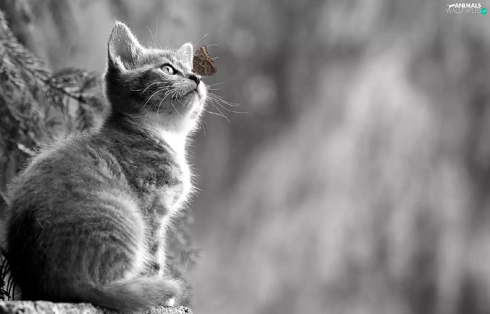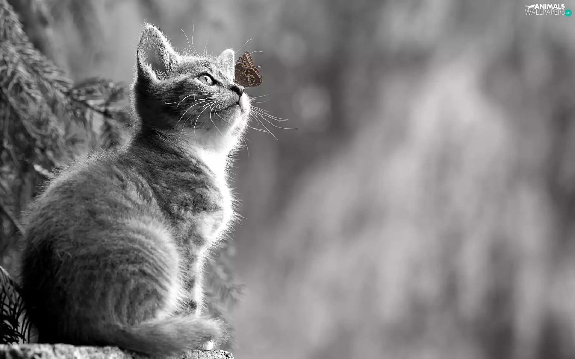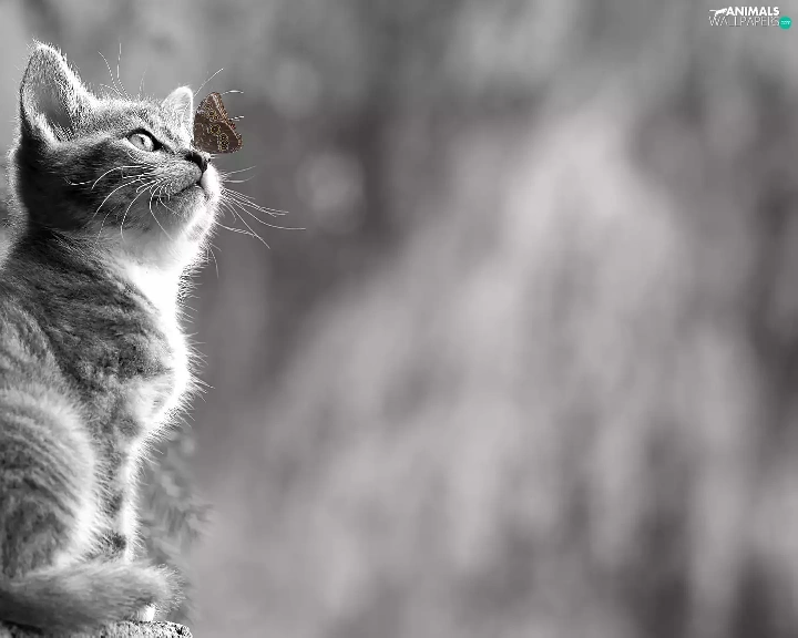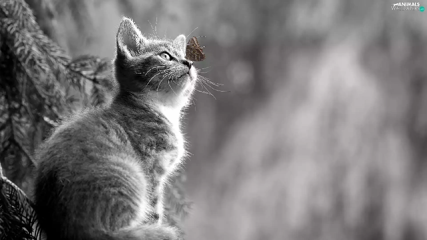 Black and white, butterfly, blurry background, kitten