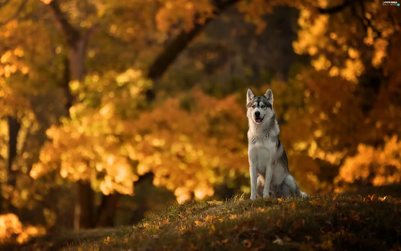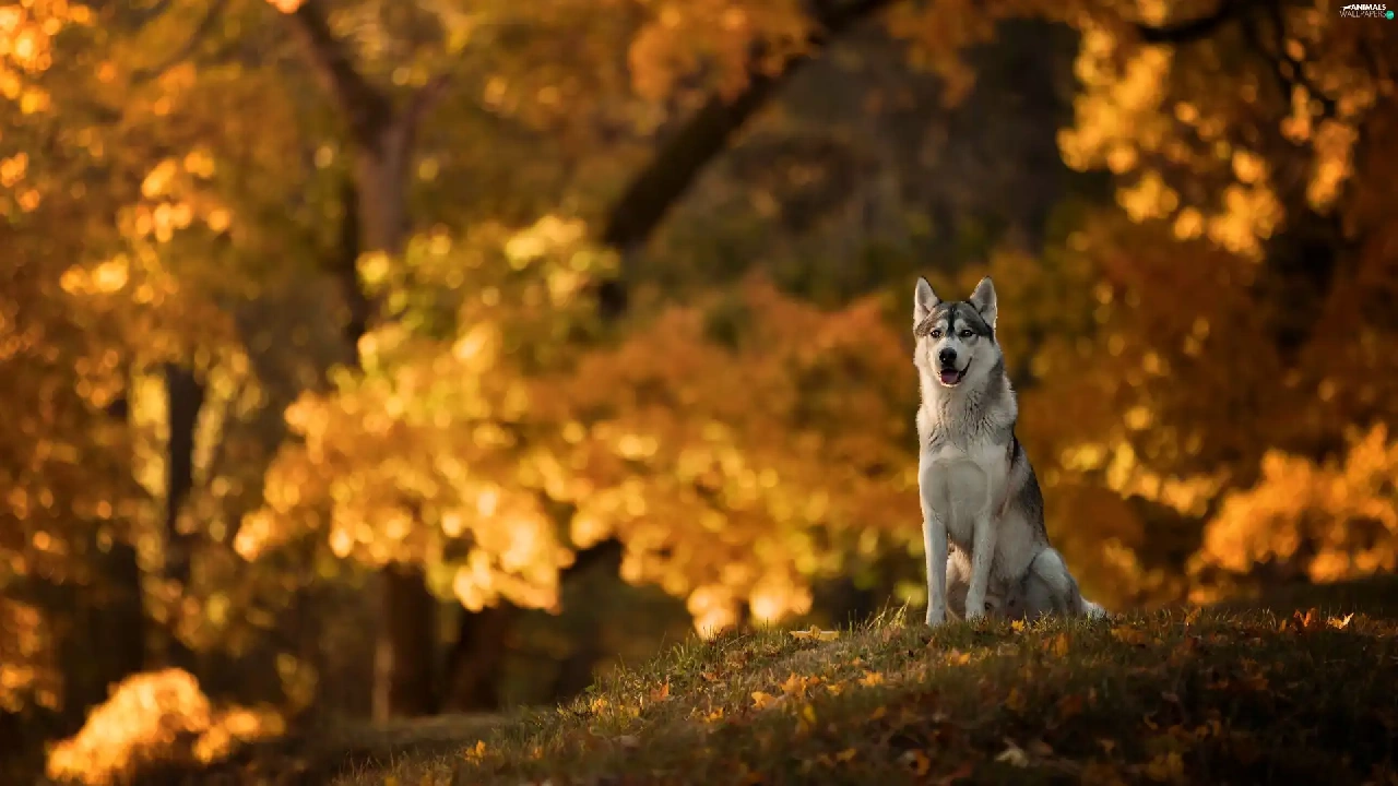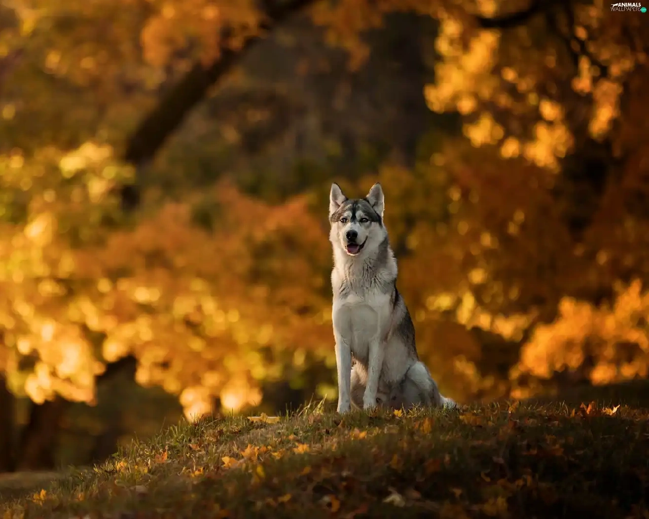 dog, car in the meadow, Park, Siberian Husky