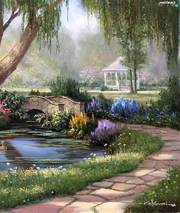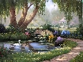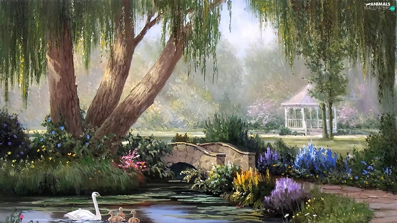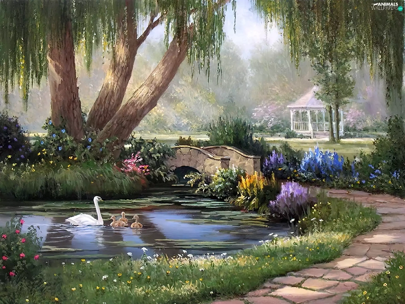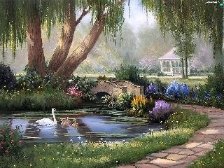 Pond - car, view, painting, Swan