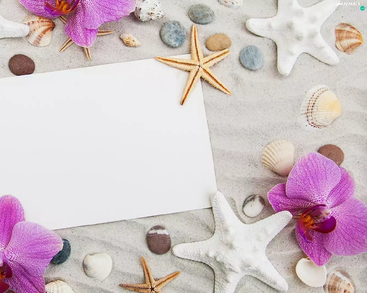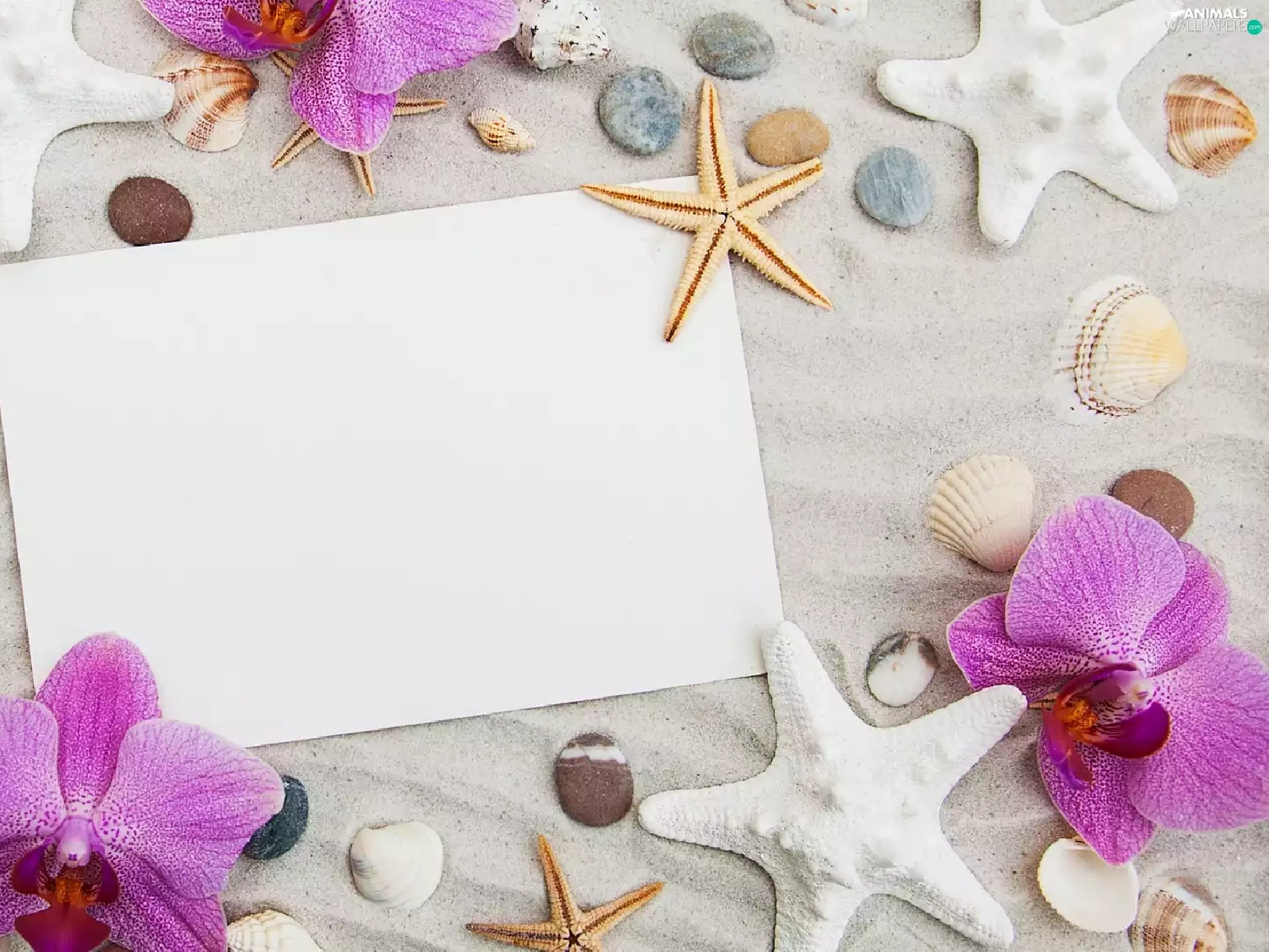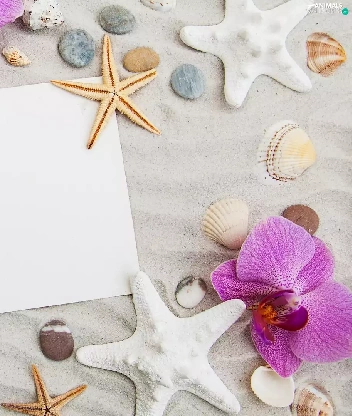 orchid, Shells, composition, starfish, Sand, orchids, Flowers, card