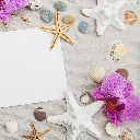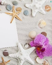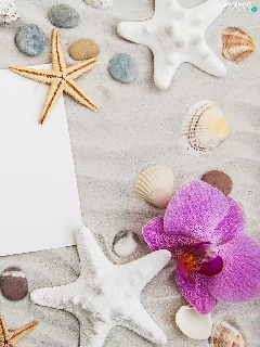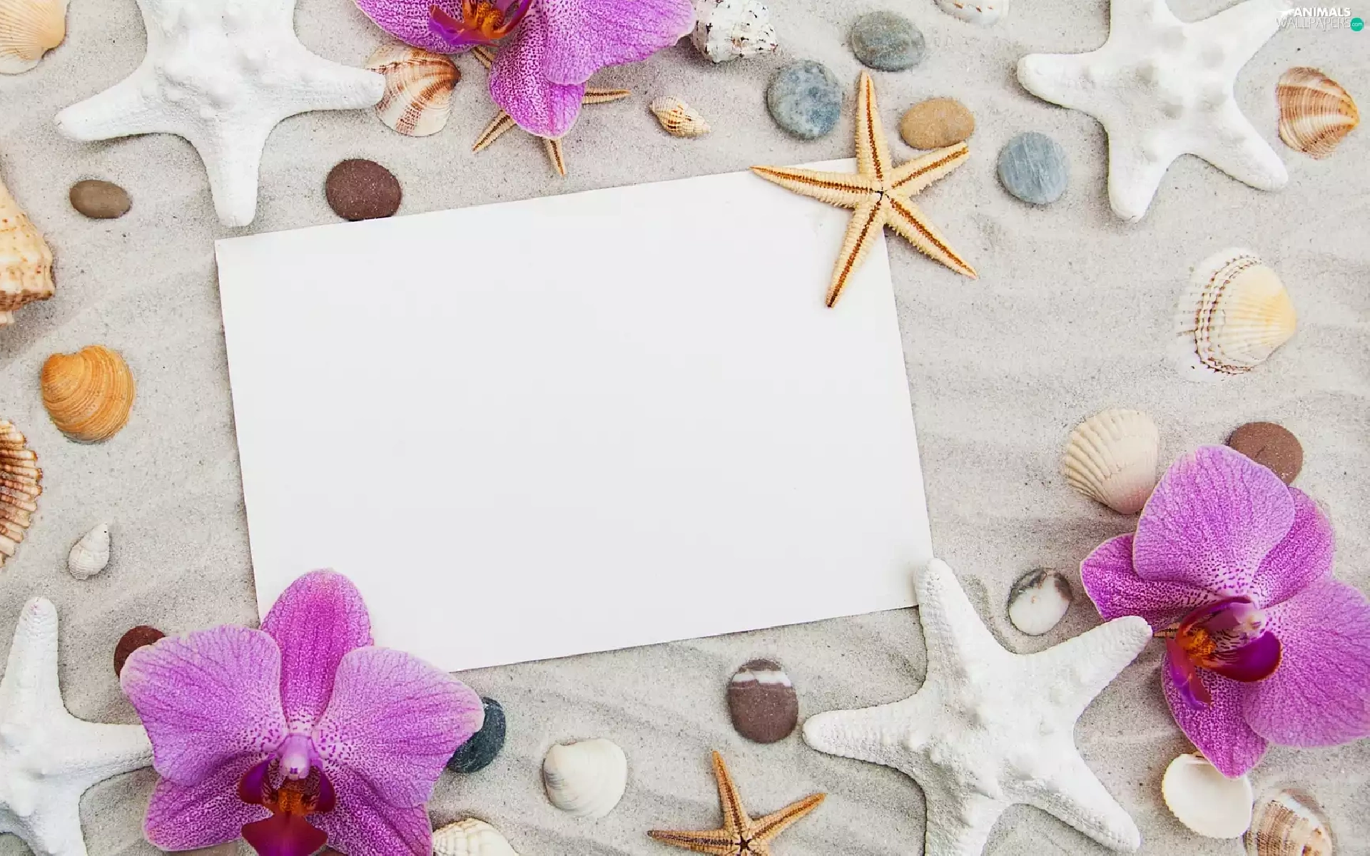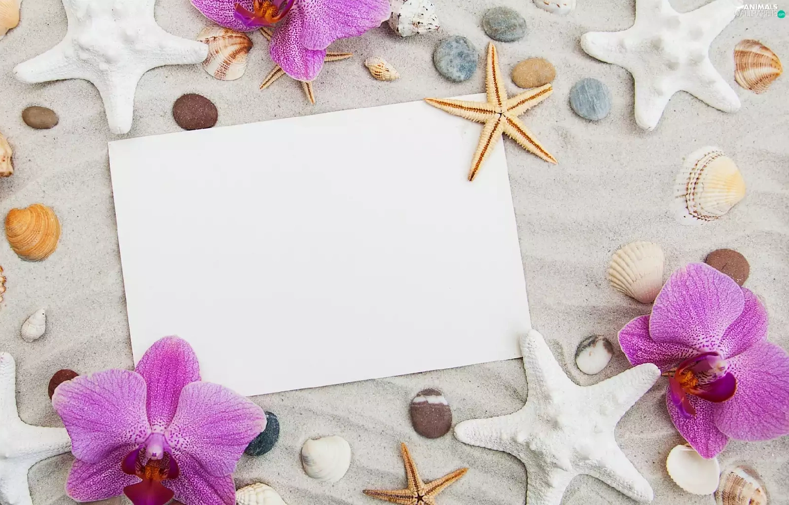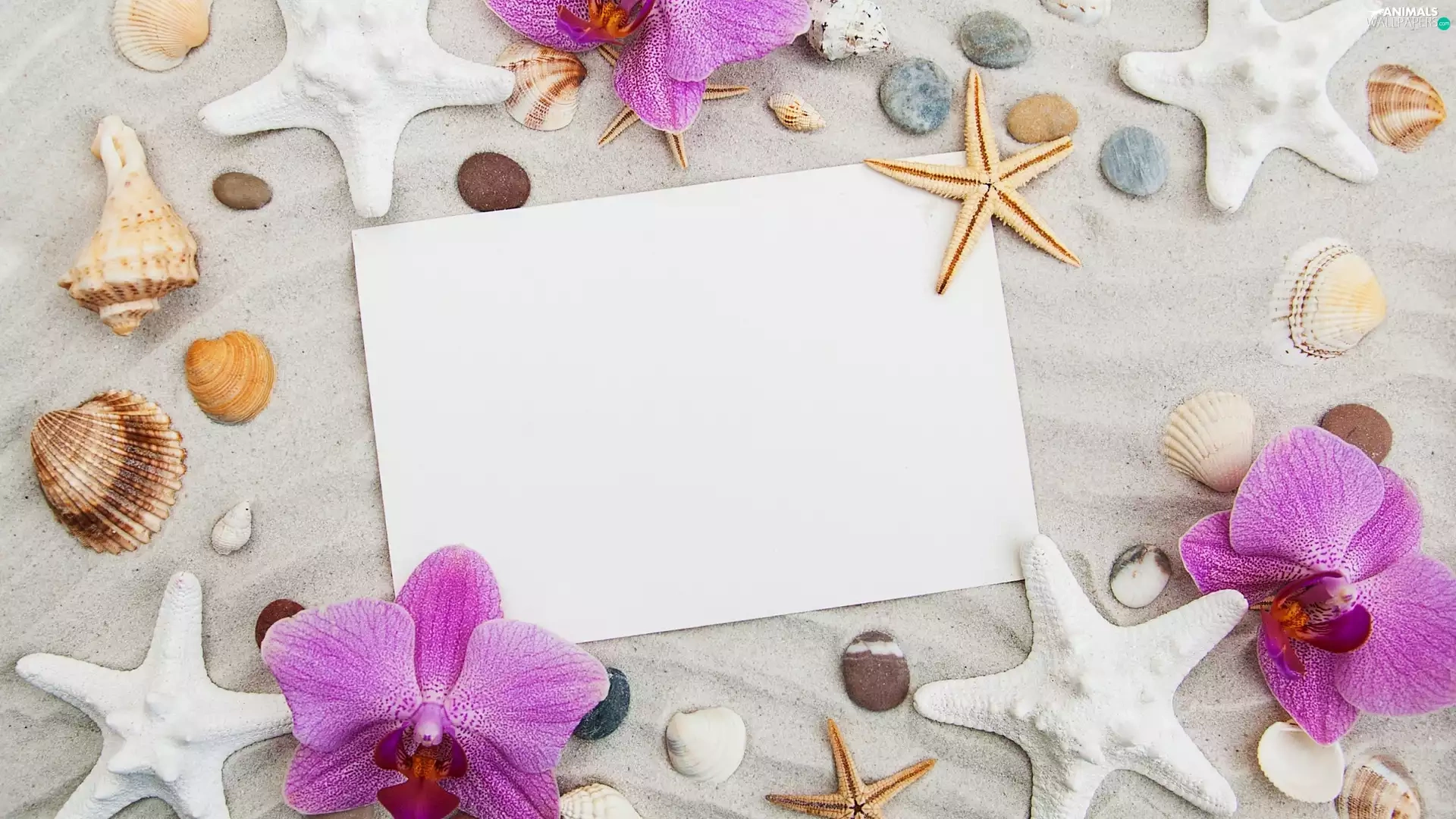 orchid, Shells, composition, starfish, Sand, orchids, Flowers, card