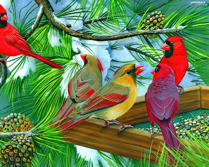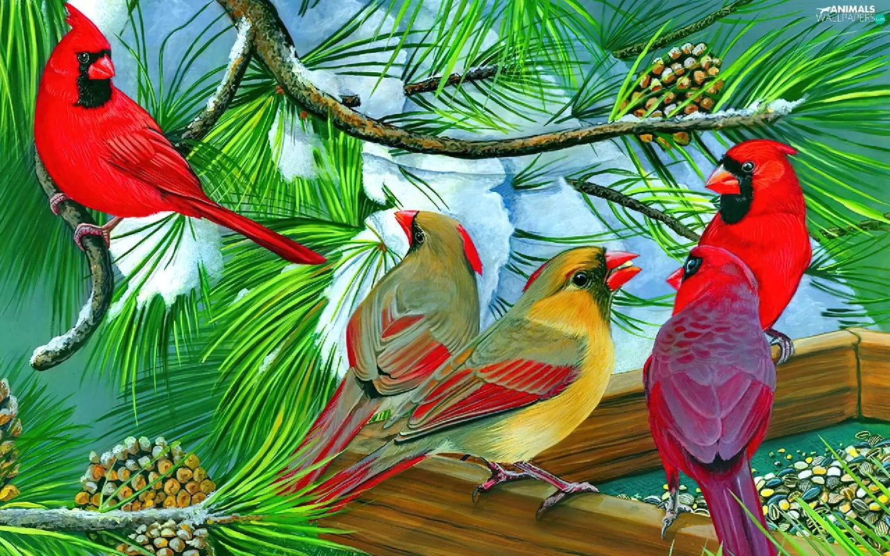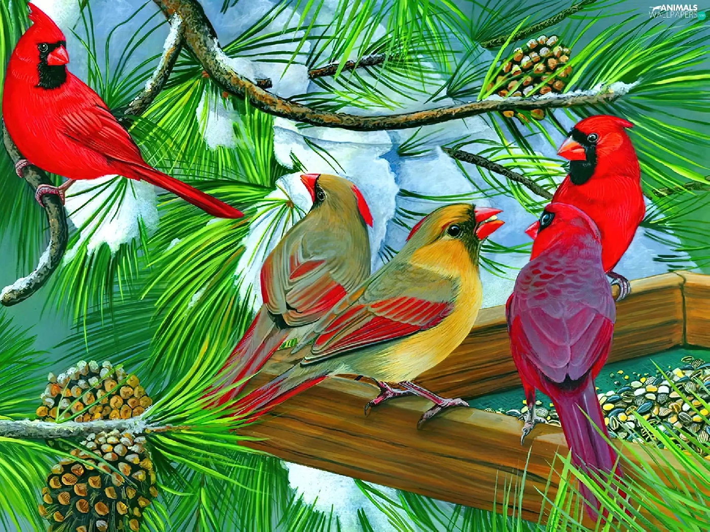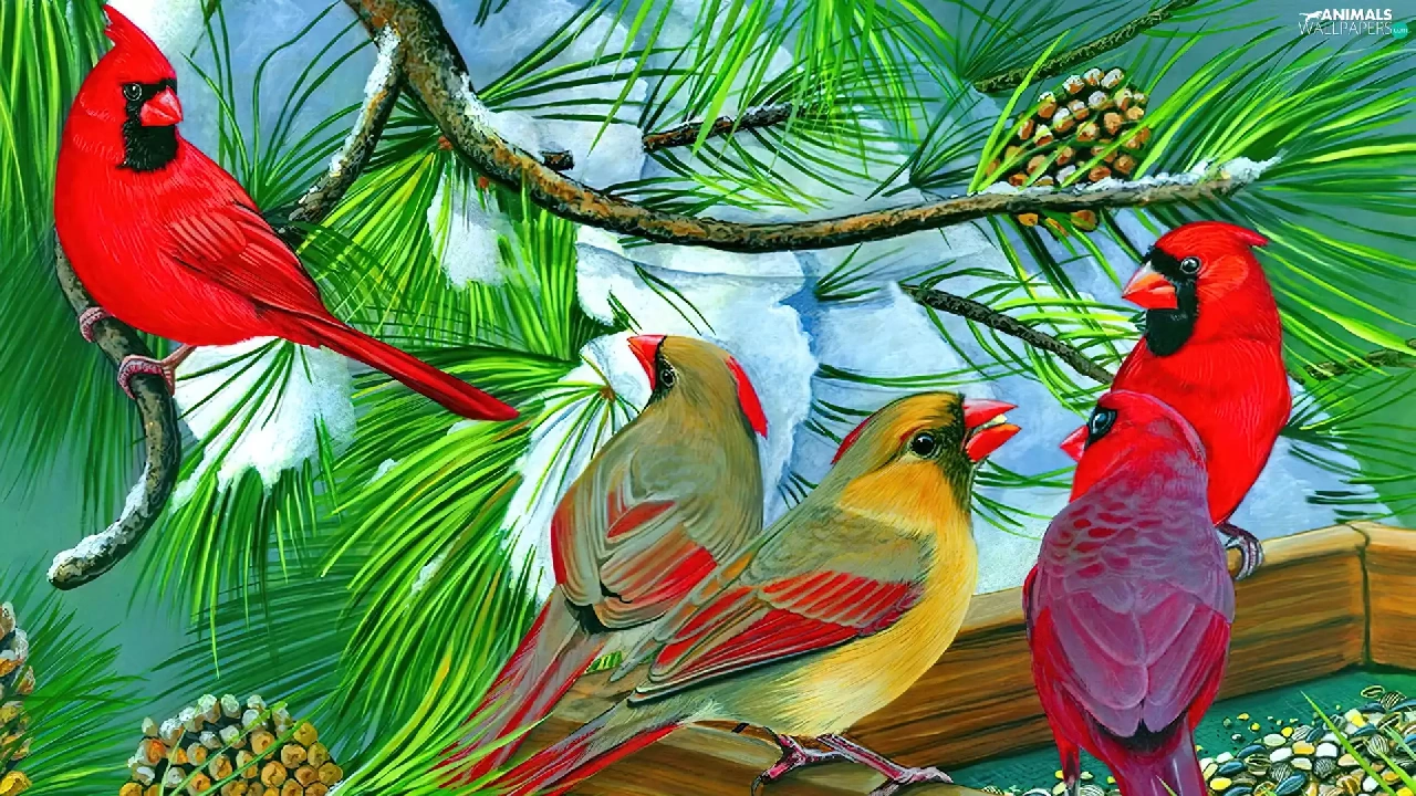birds, conifer, Bird, Cardinals