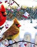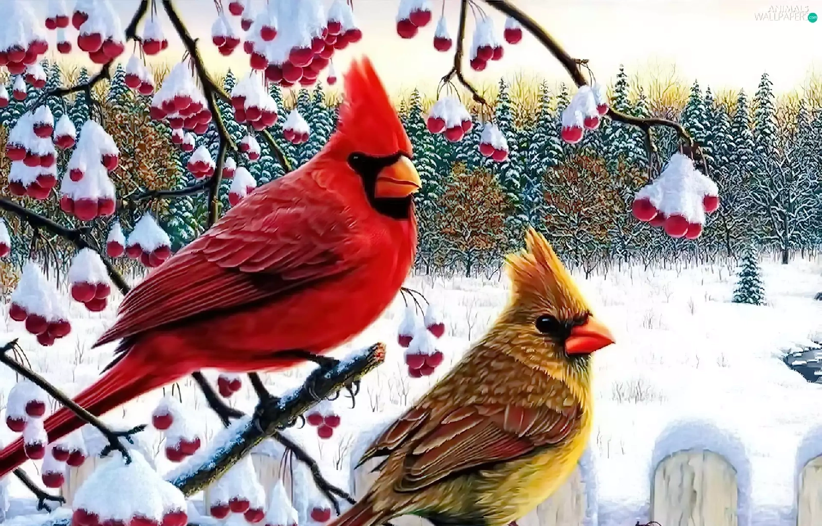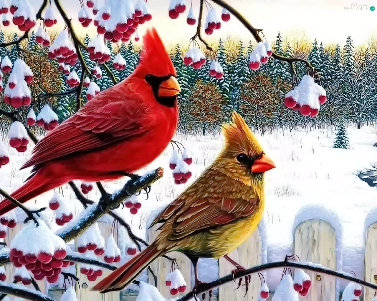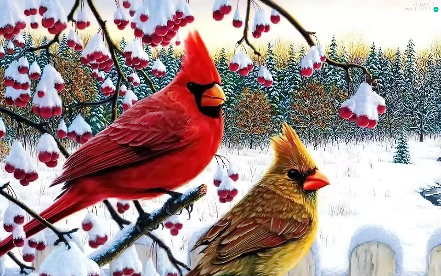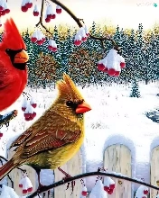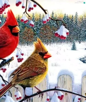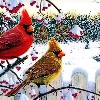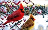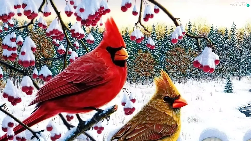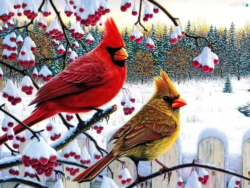 birds, Twigs, winter, Cardinals