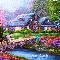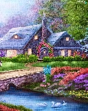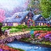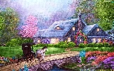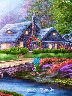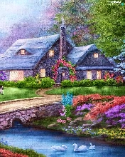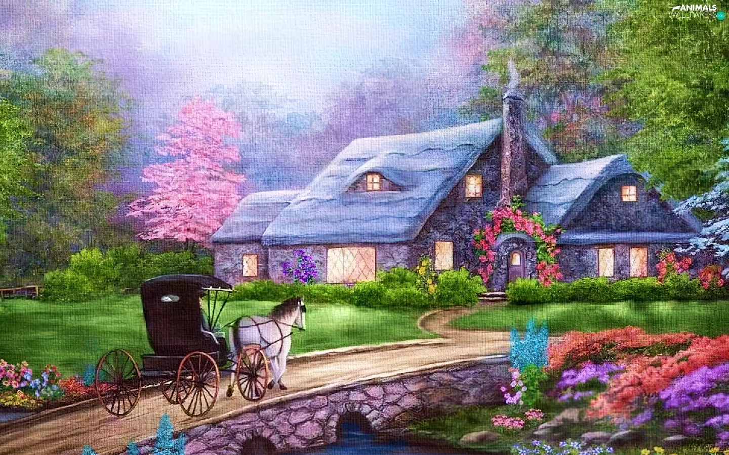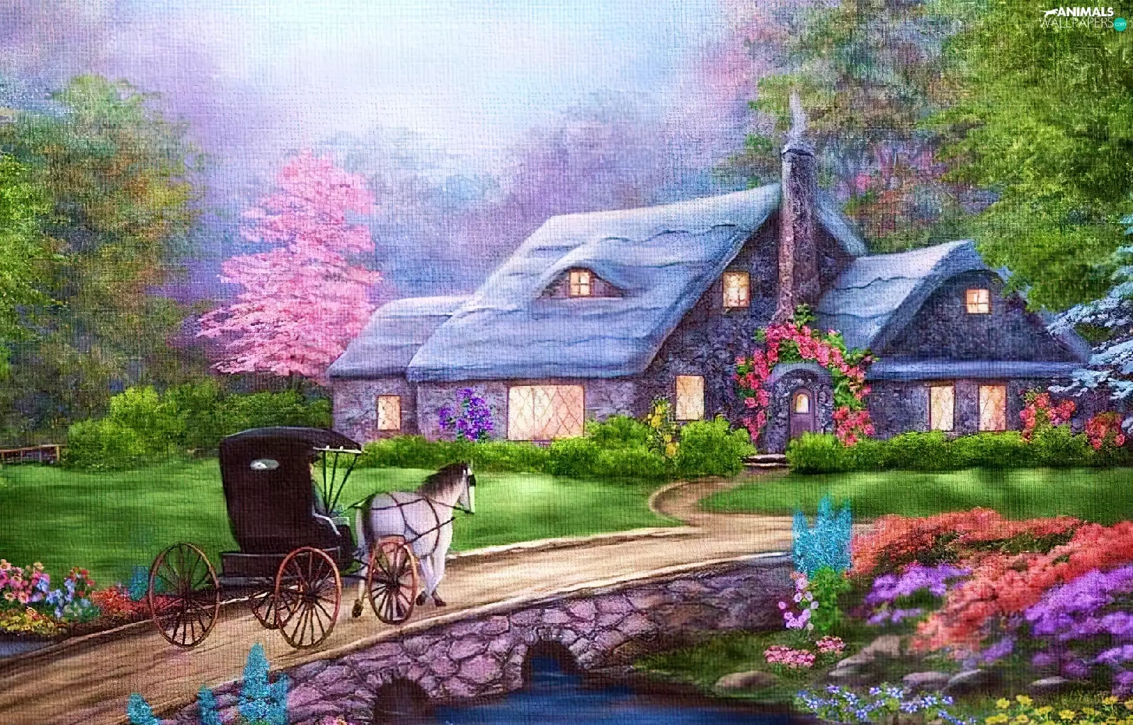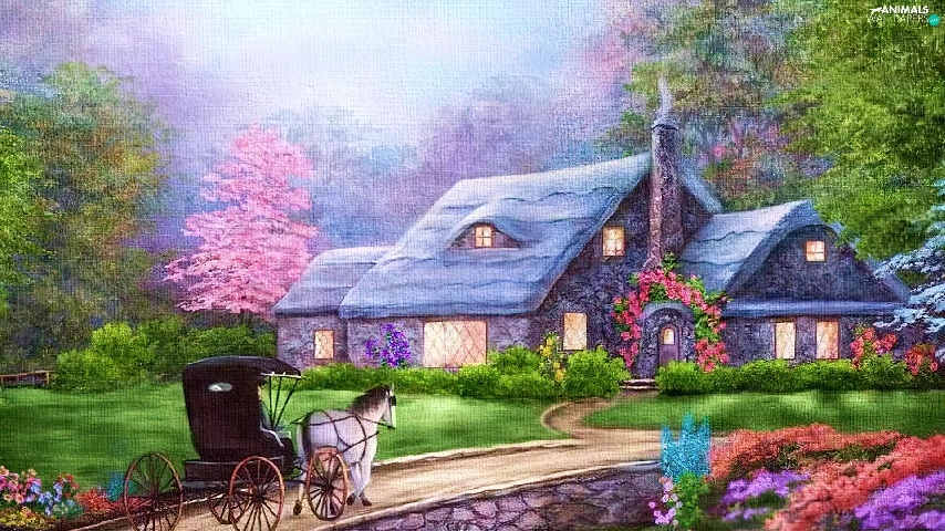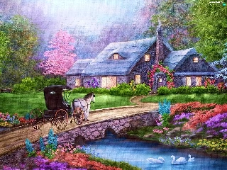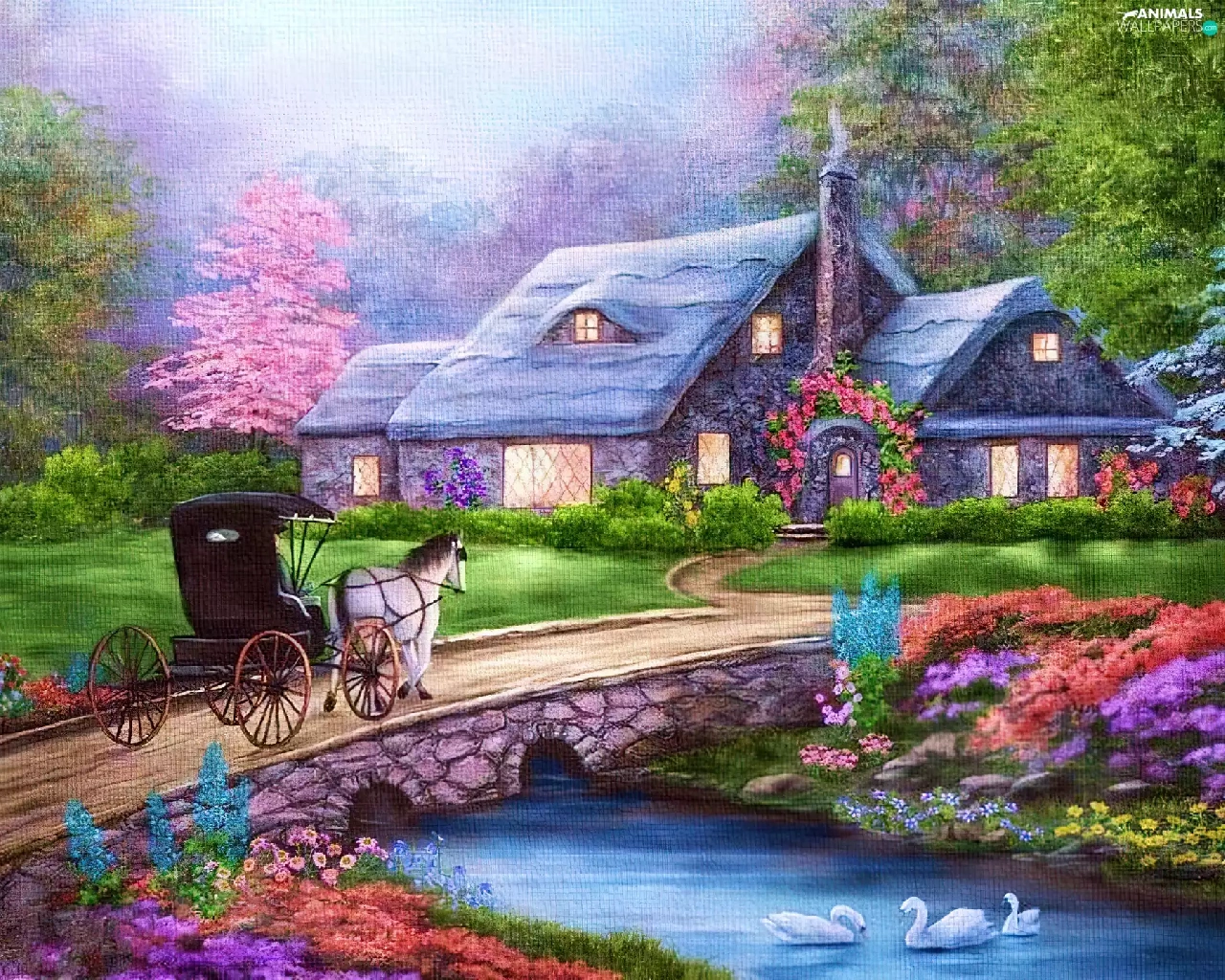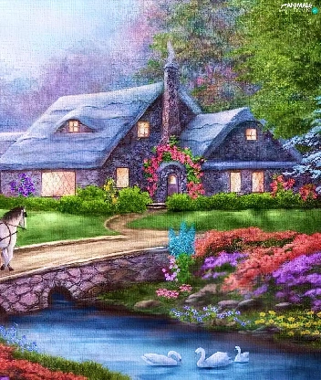 River, house, Swan, carriage, Flowers, bridge