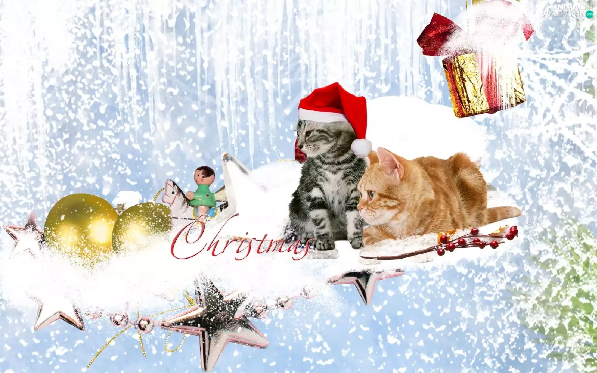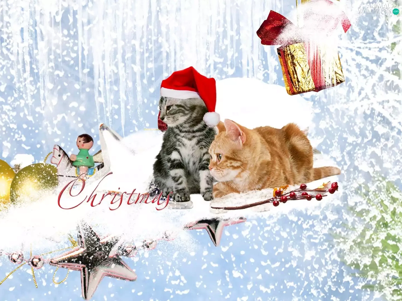 Two cars, baubles, christmas, puss