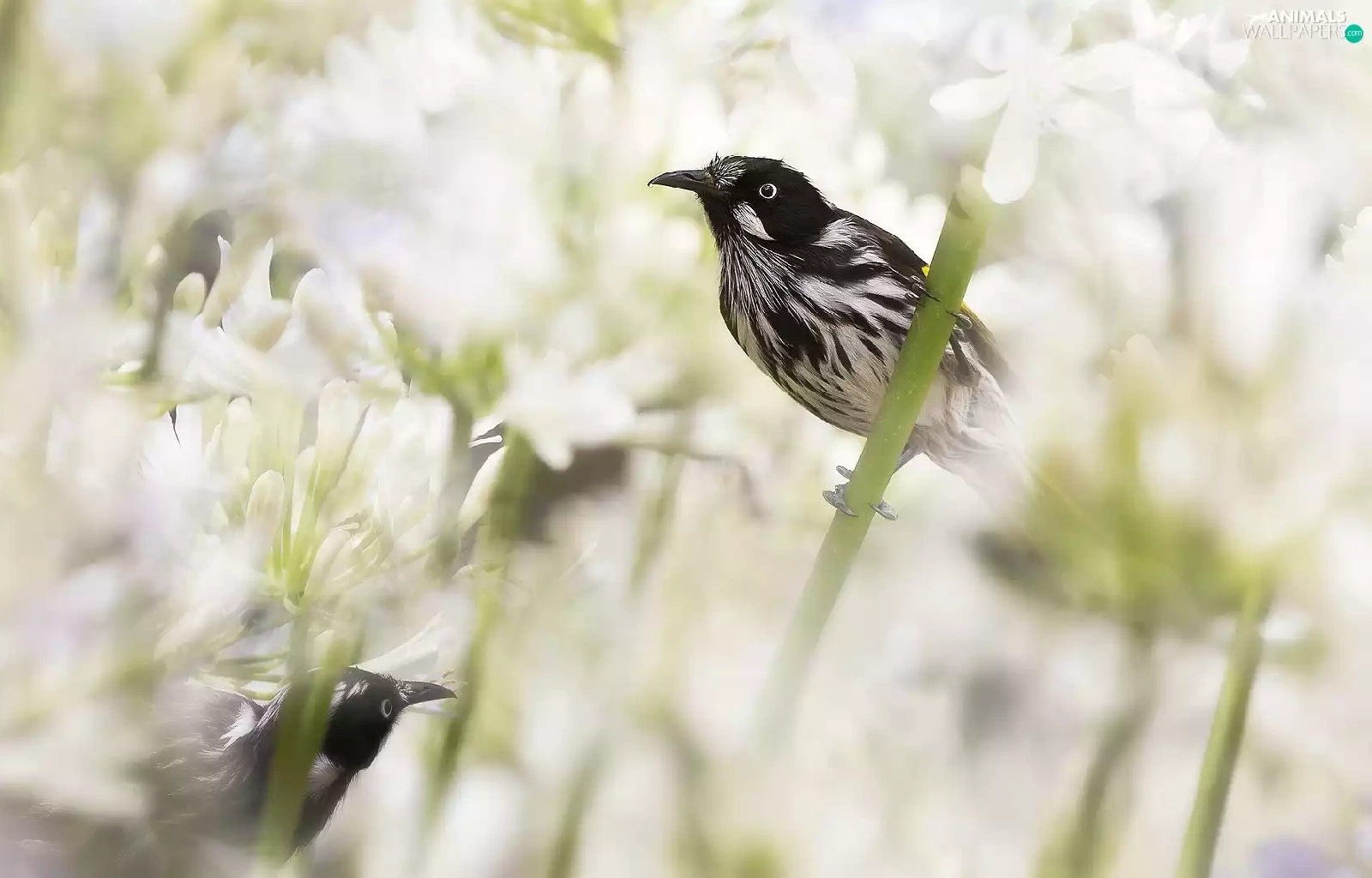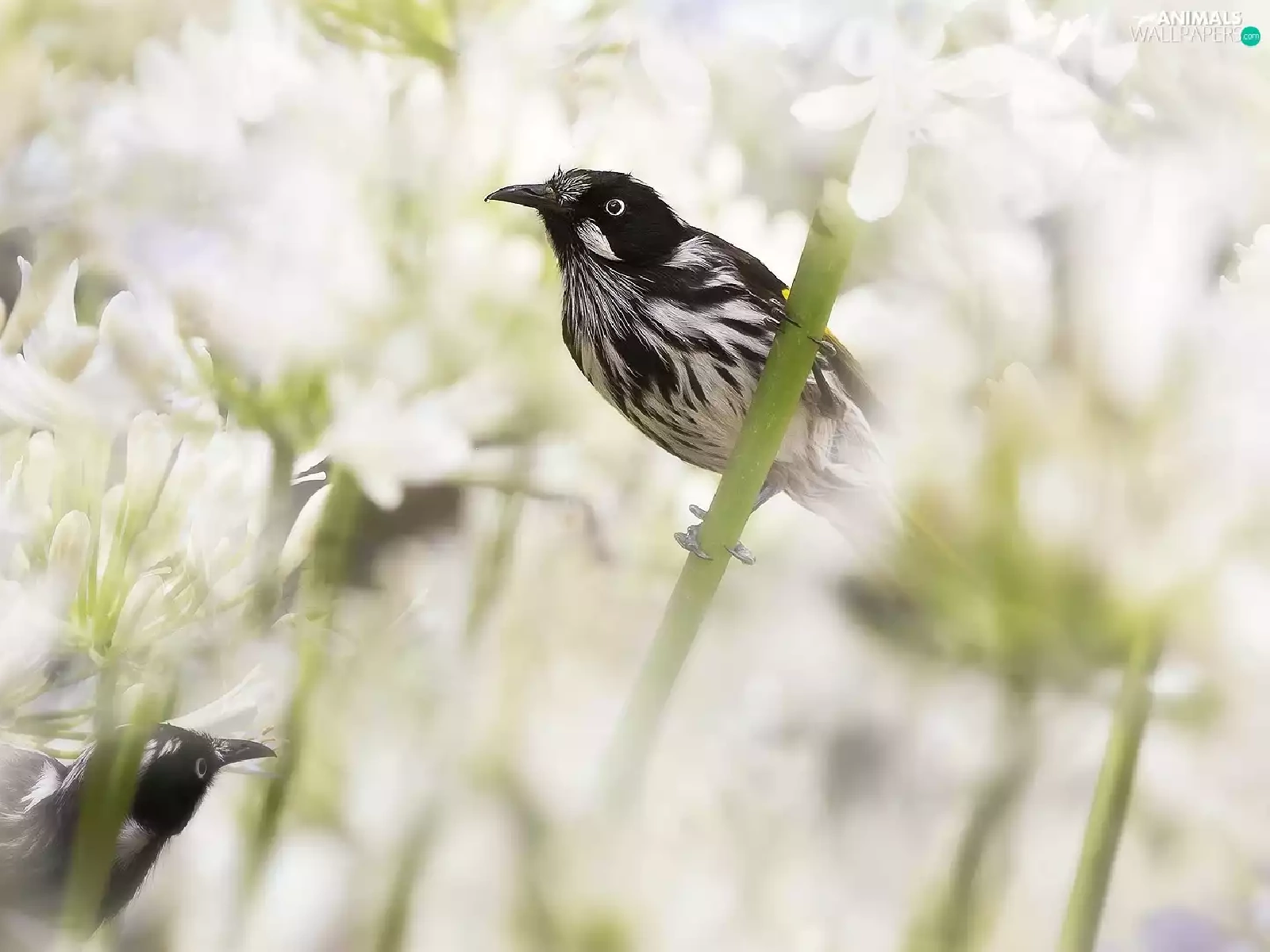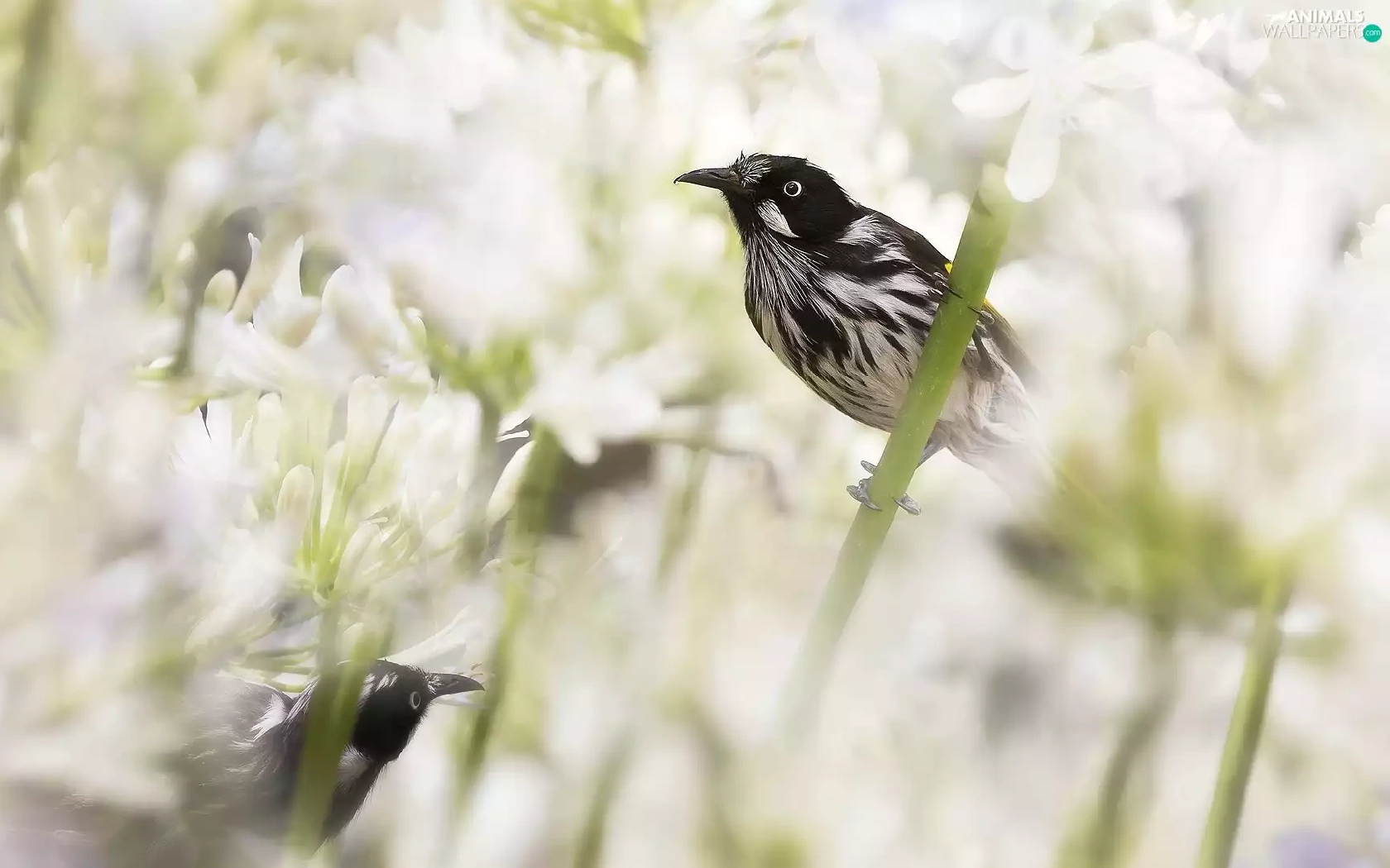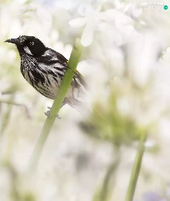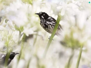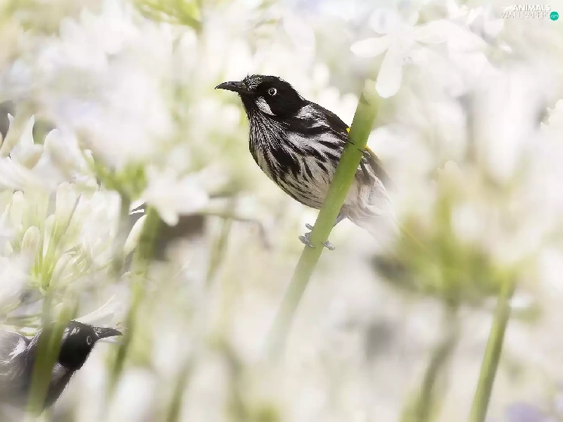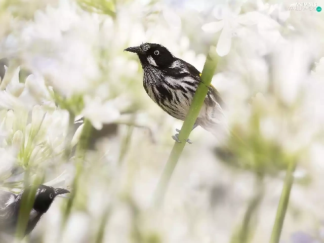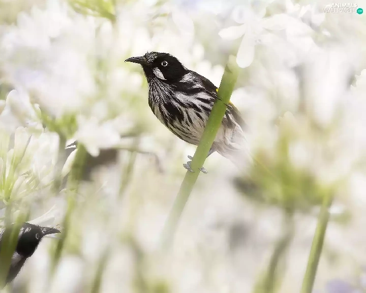 Flowers, Agapanthus, birds, New Holland honeyeater, Two cars
