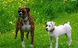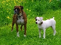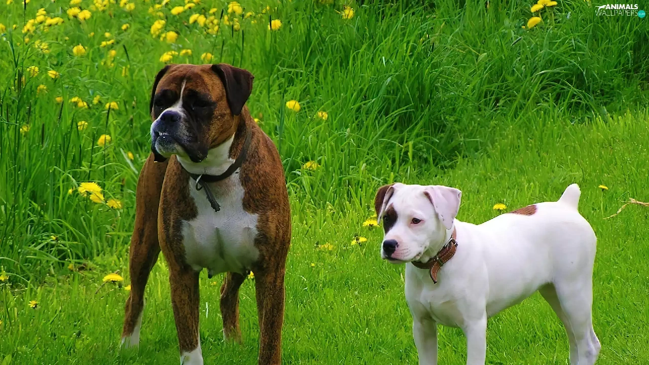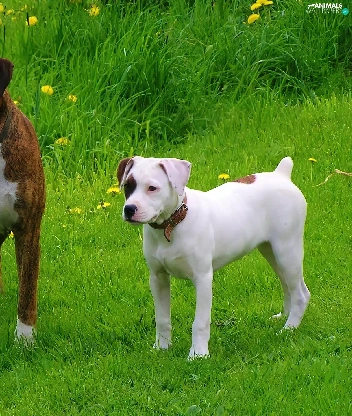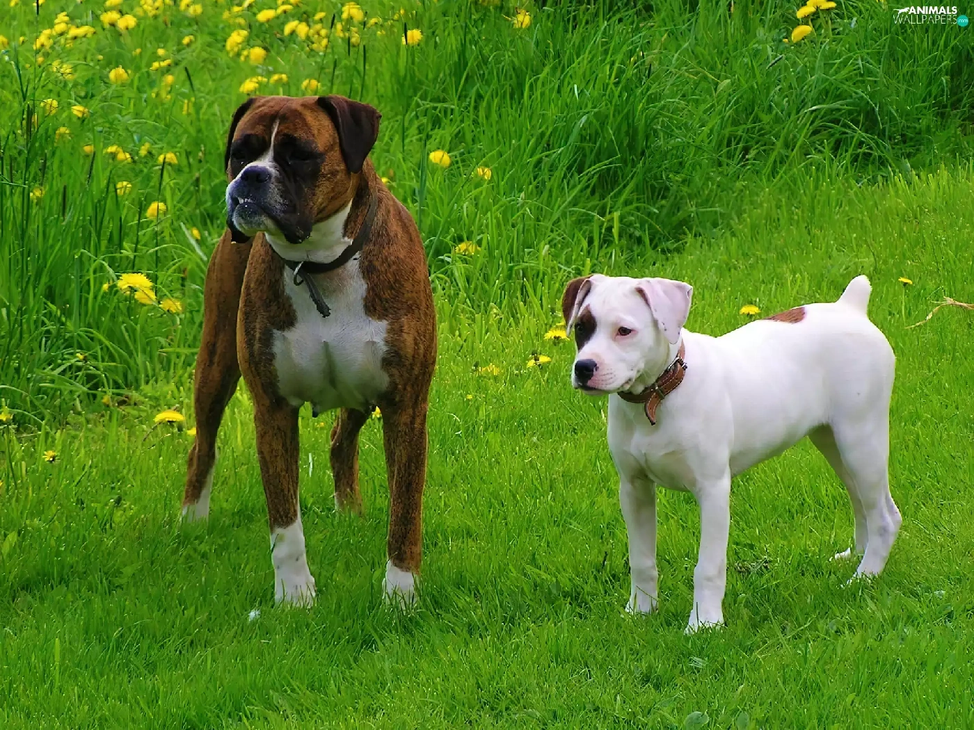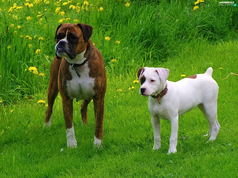 Two cars, boxer, Amstaff, Dogs