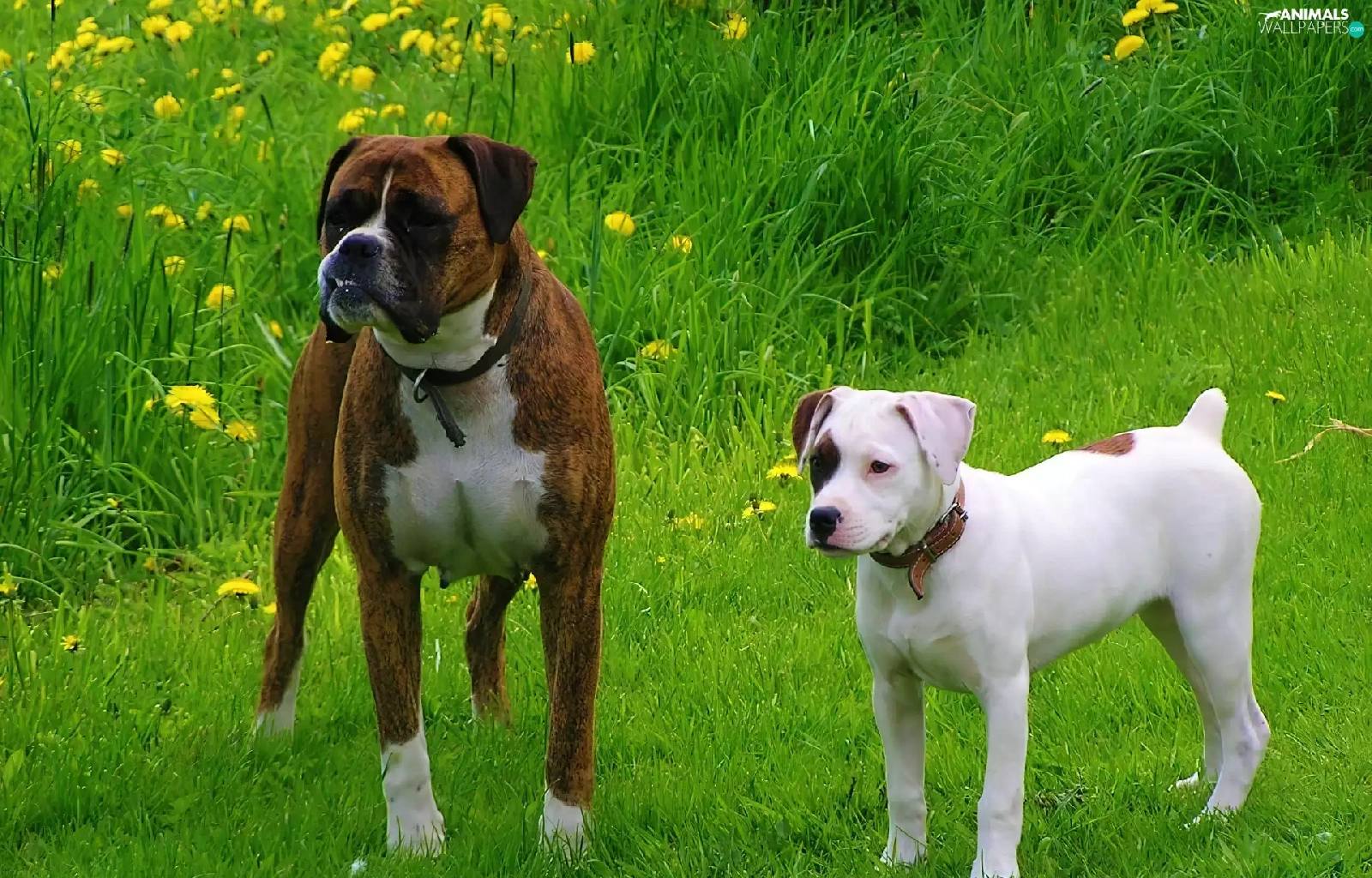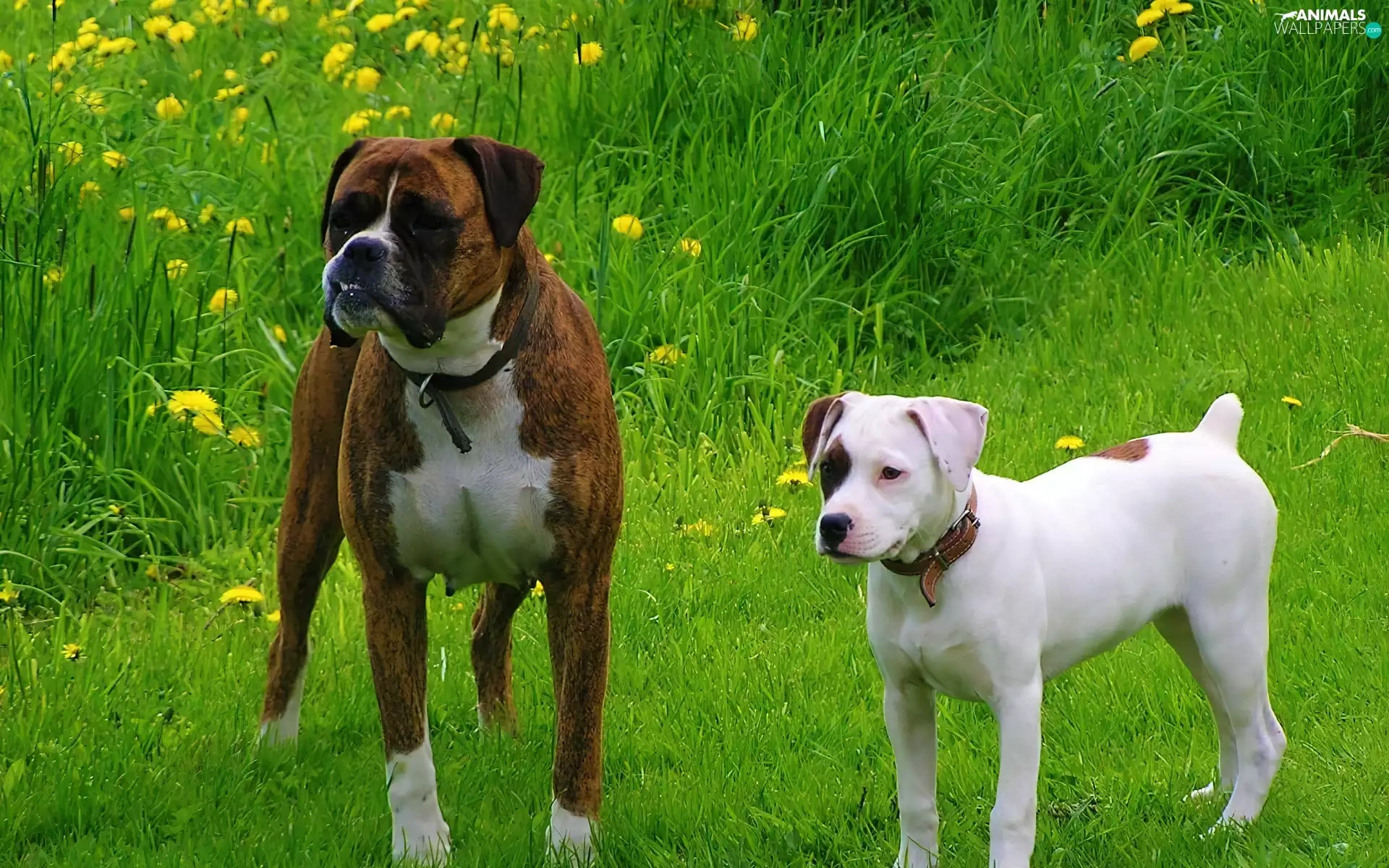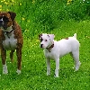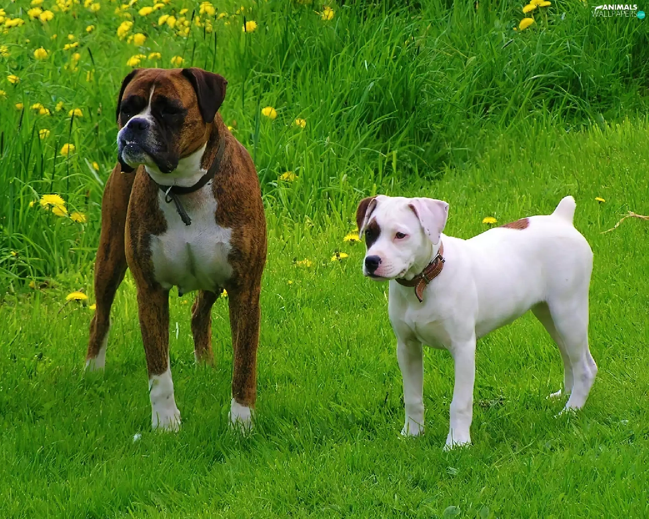 Two cars, boxer, Amstaff, Dogs