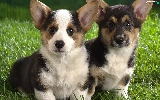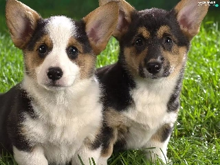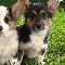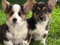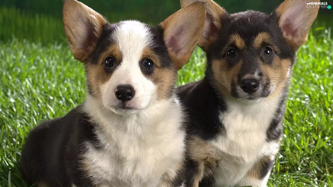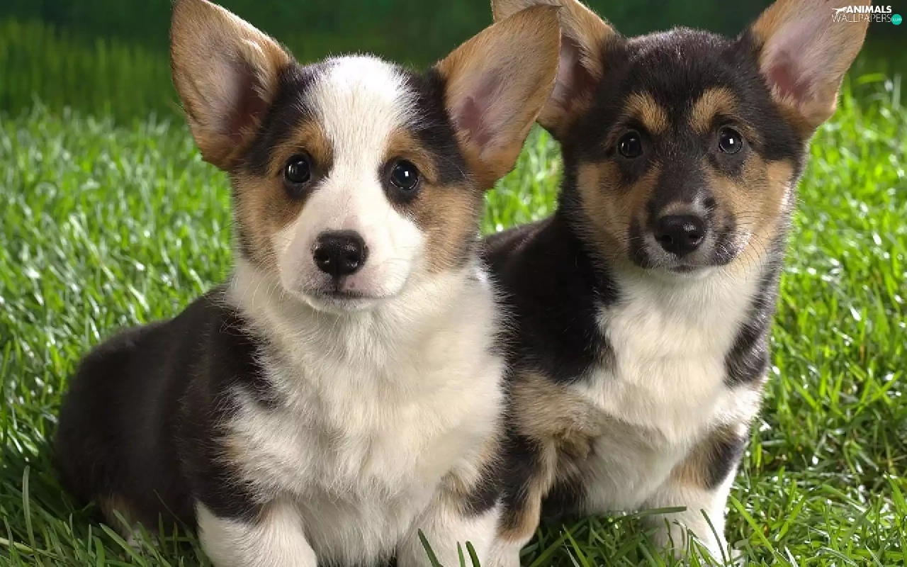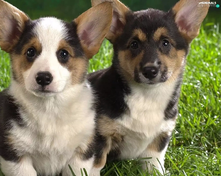 Two cars, Corgi, grass, puppies