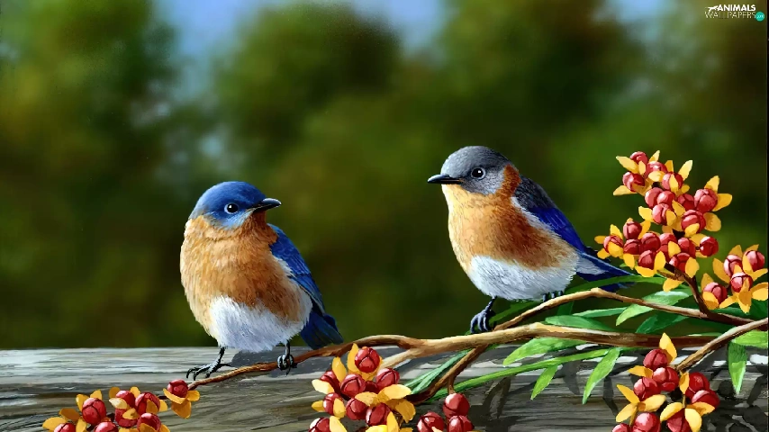 Two cars, Flowers, painting, birds