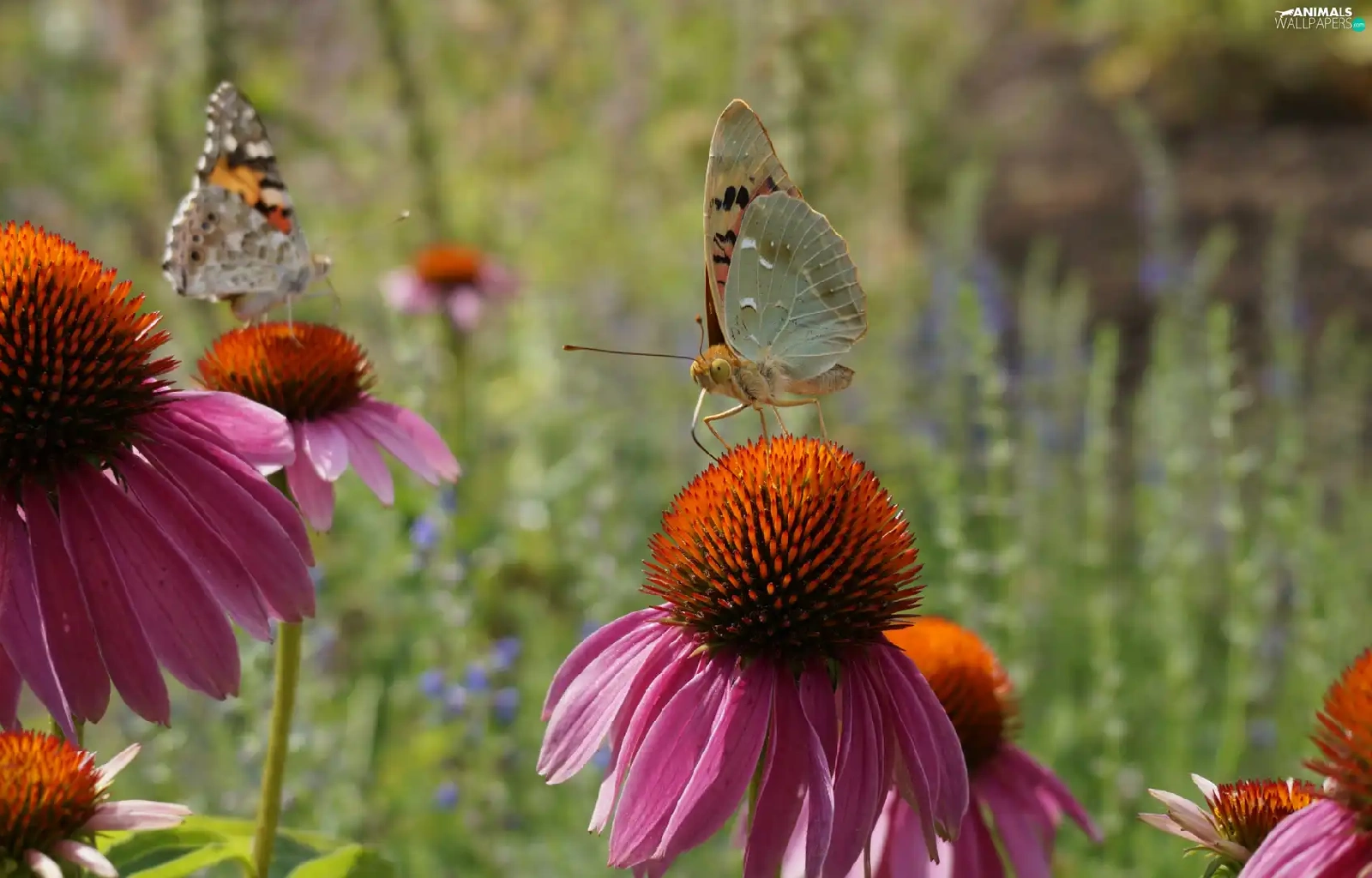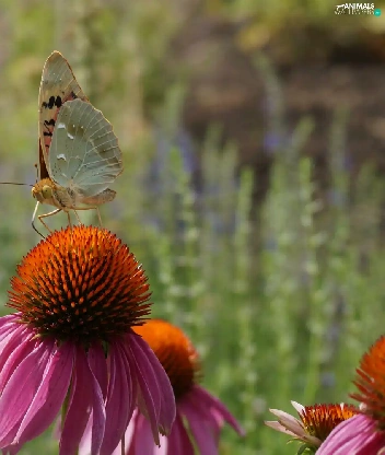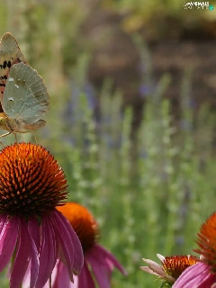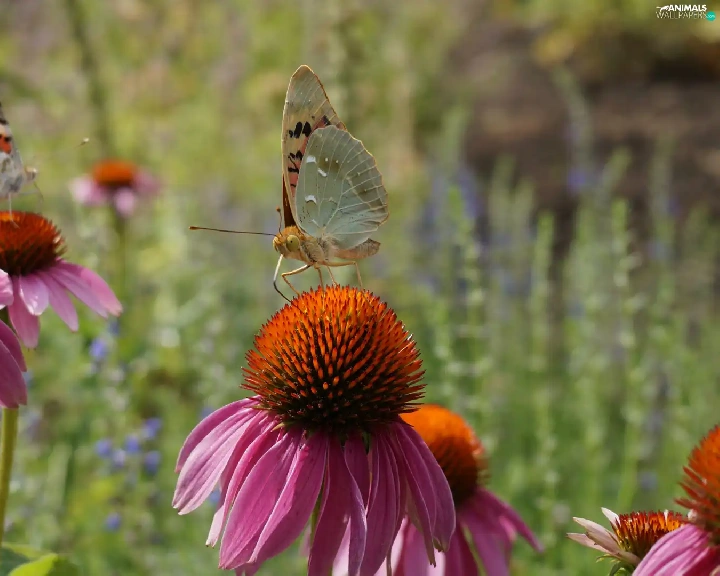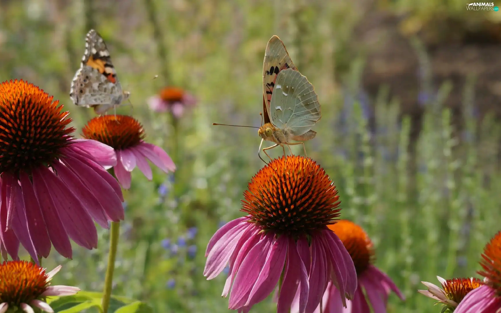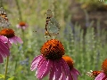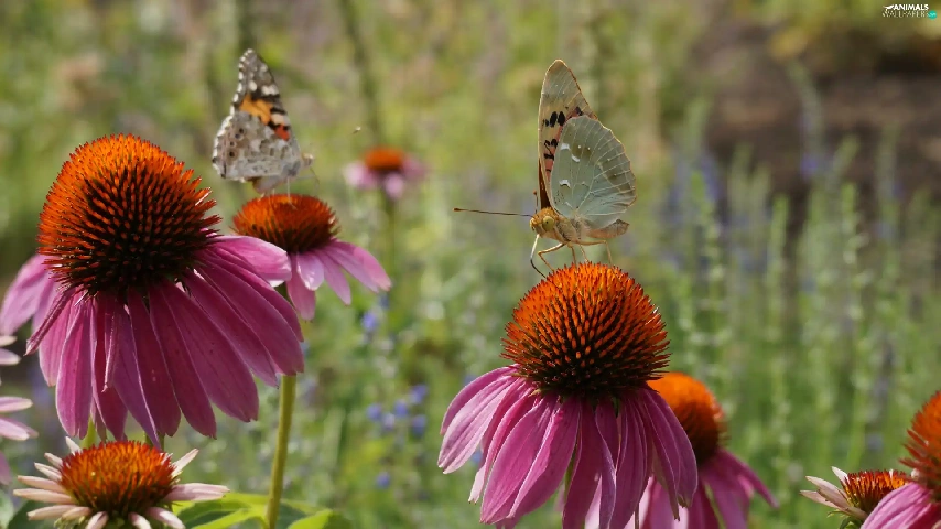 Two cars, Flowers, echinacea, butterflies