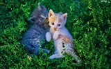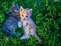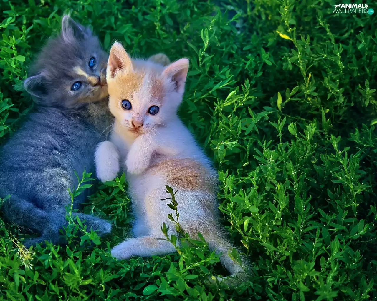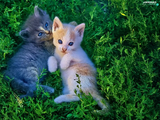 little doggies, grass, Gray, ginger, cats, Two cars