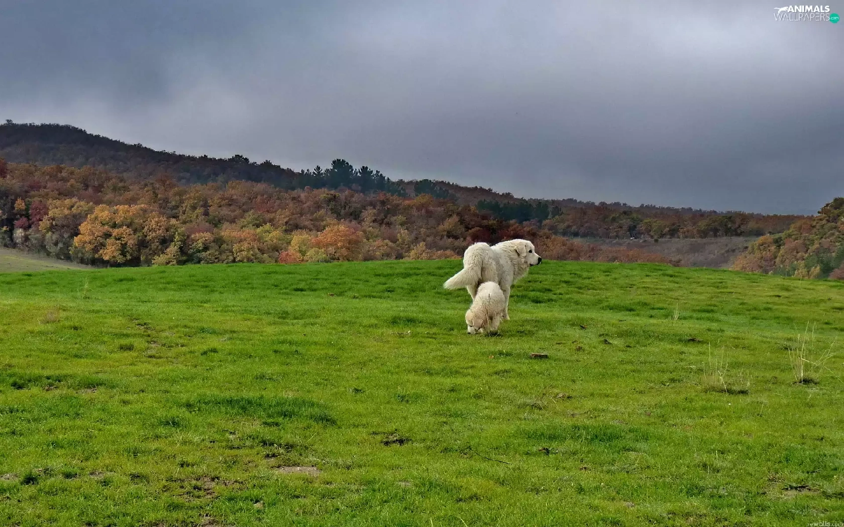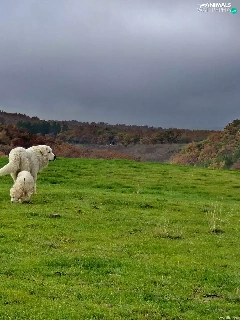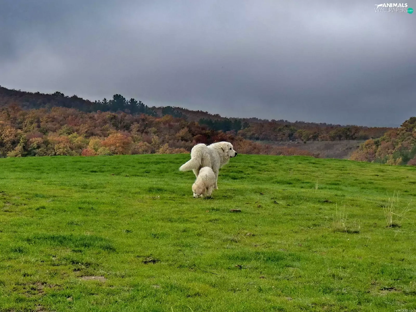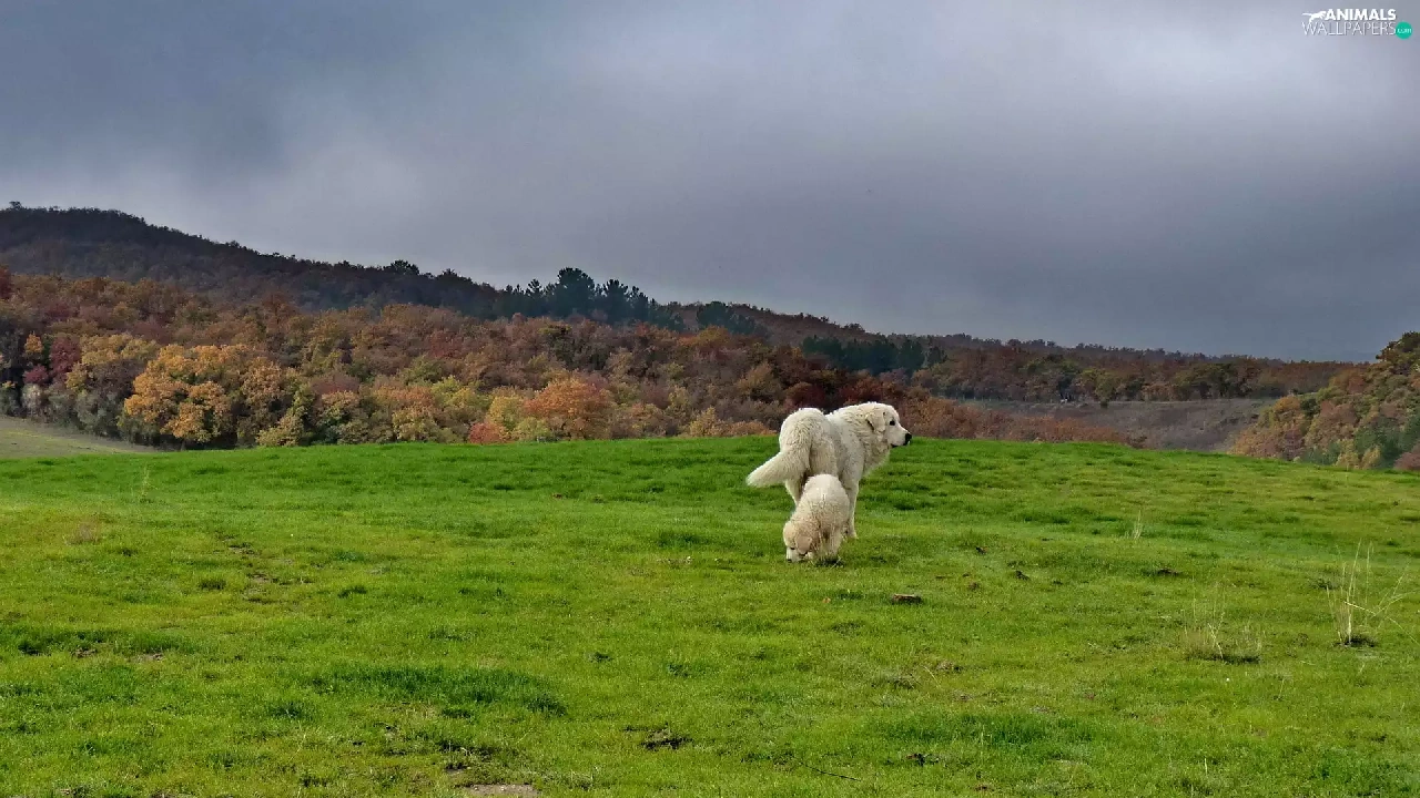 Two cars, grass, Sky, puppies