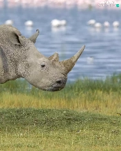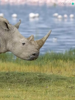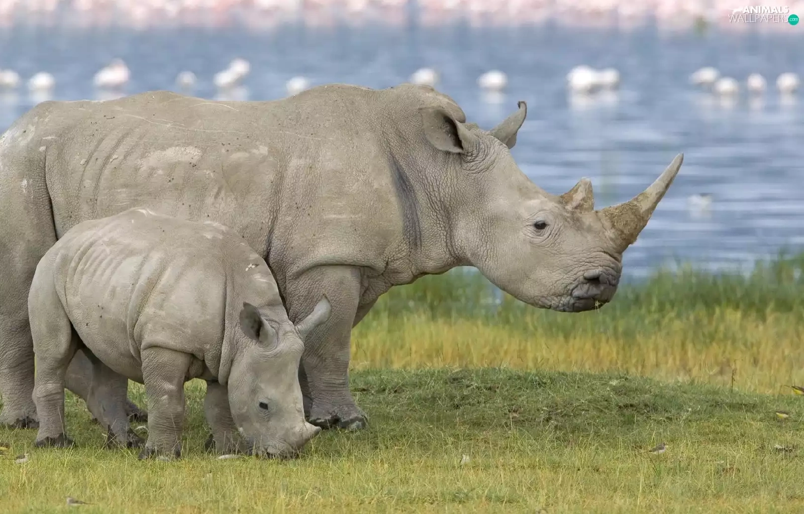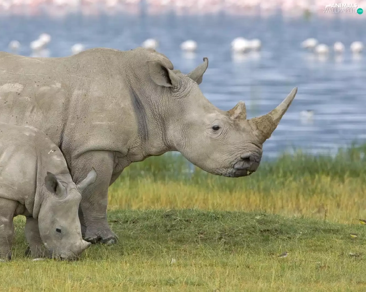 Two cars, grass, water, Rhinos