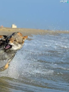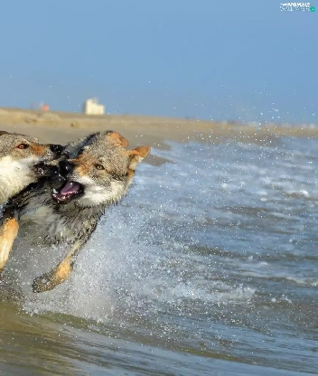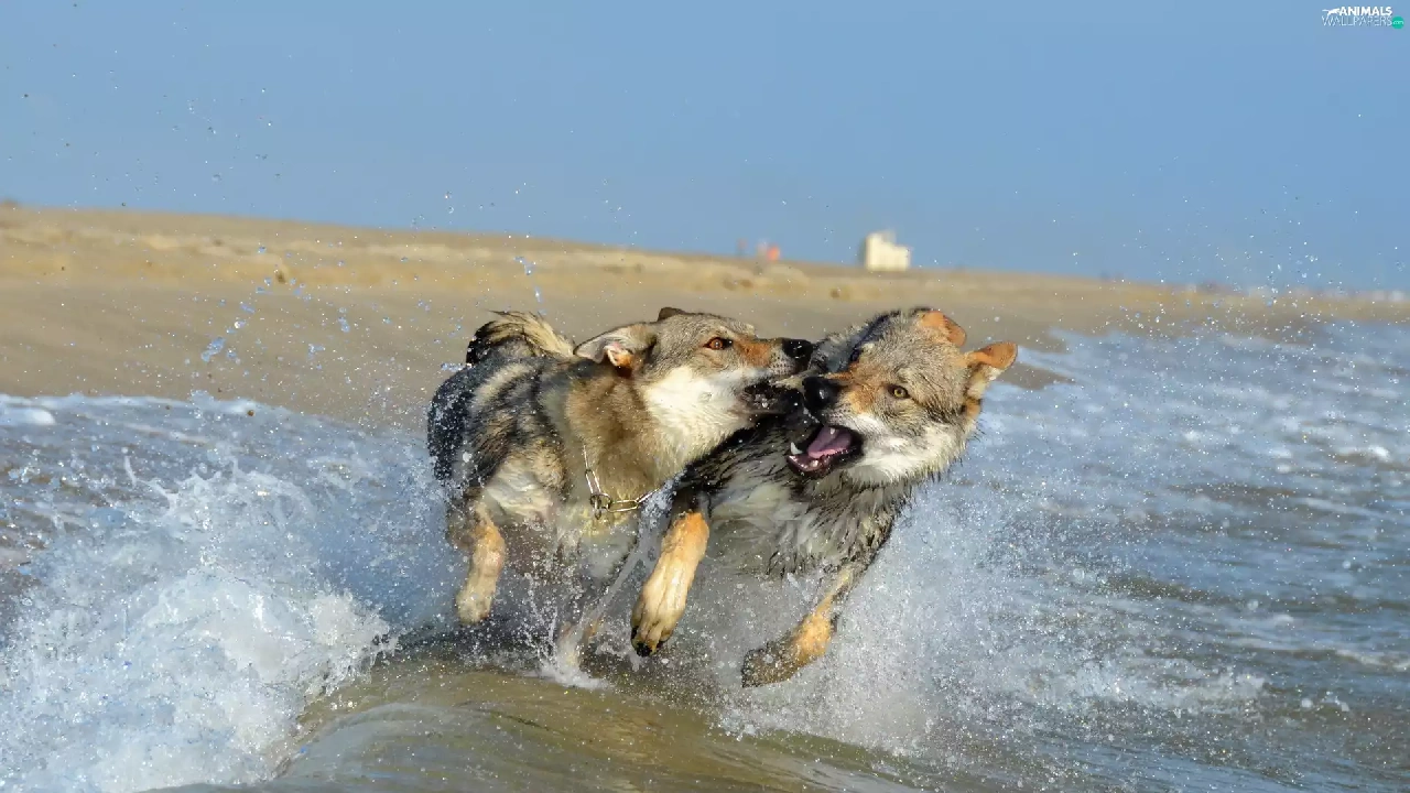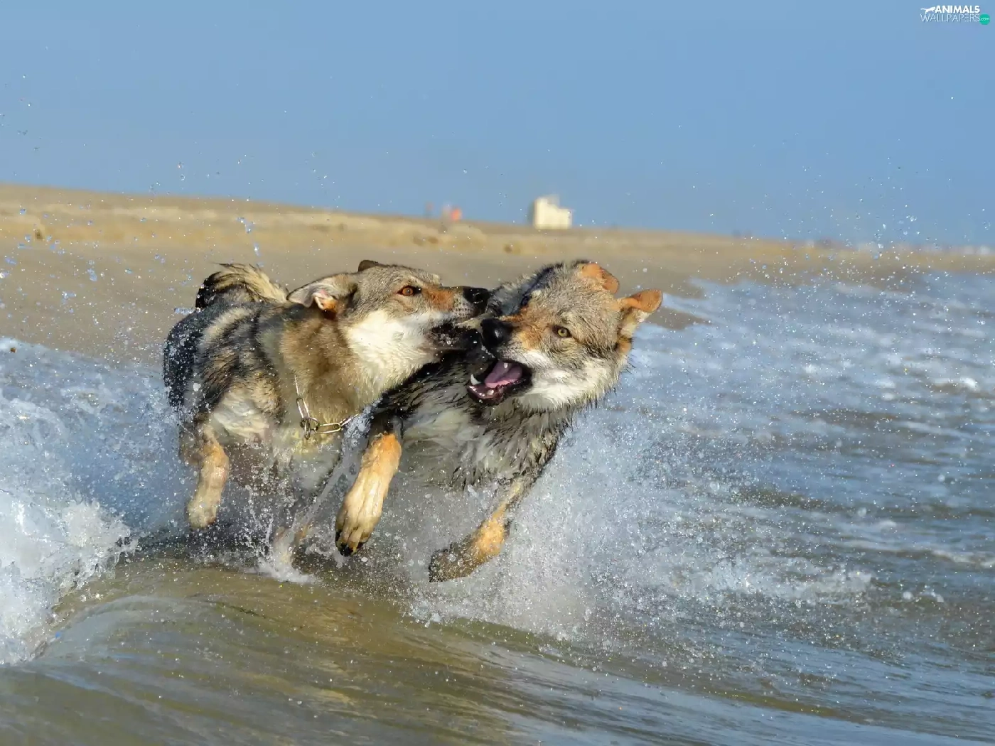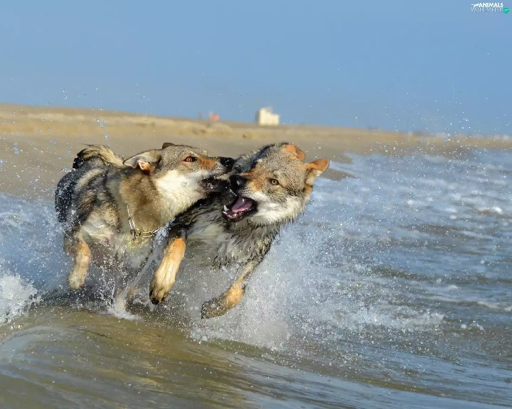 Two cars, play, water, Dogs