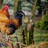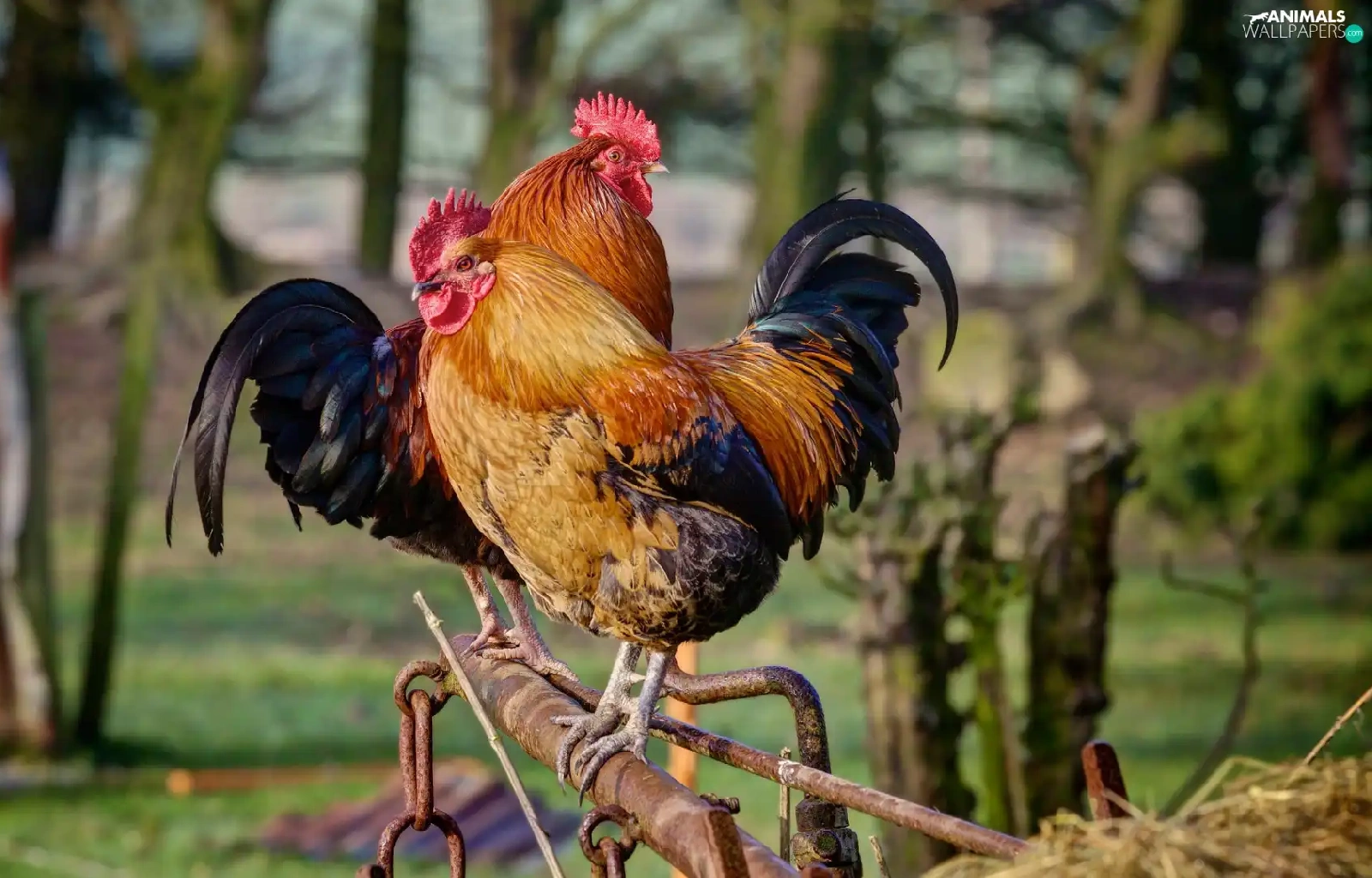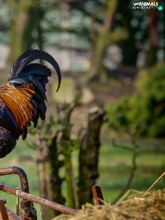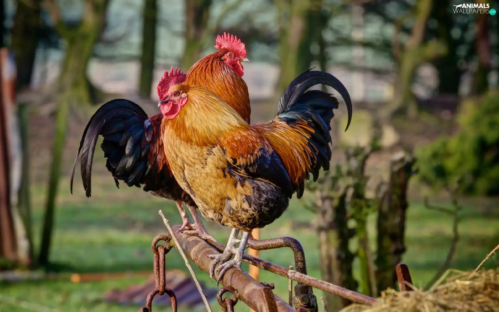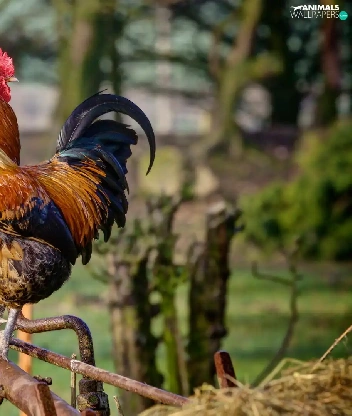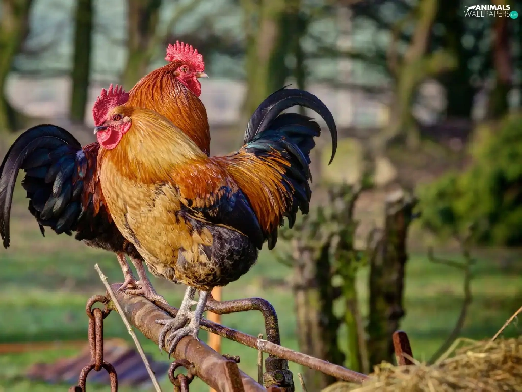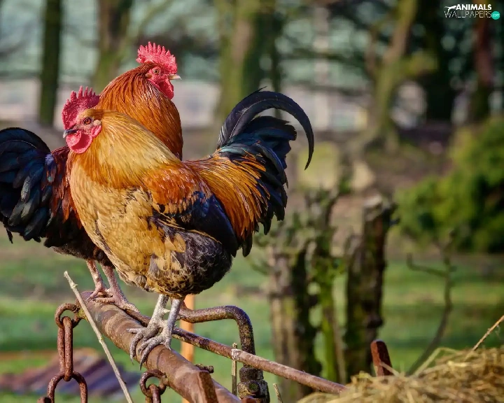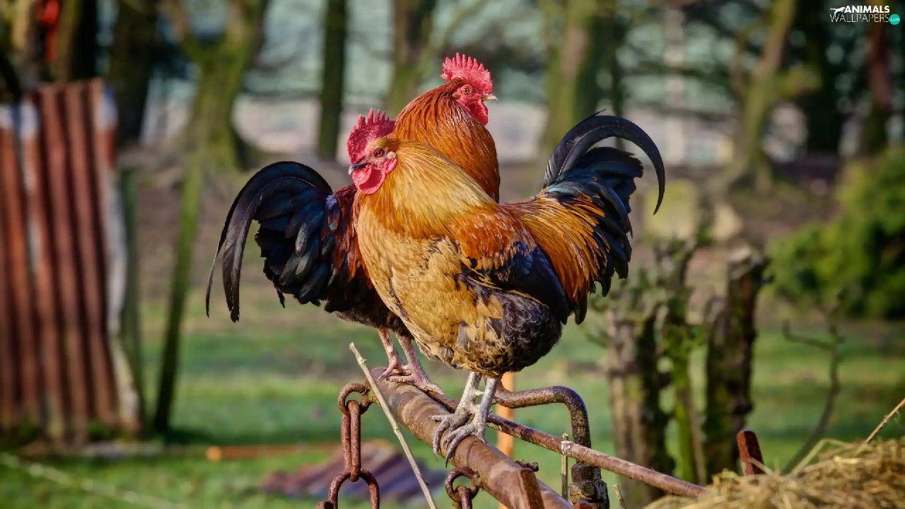 roosters, birds, Two cars