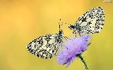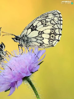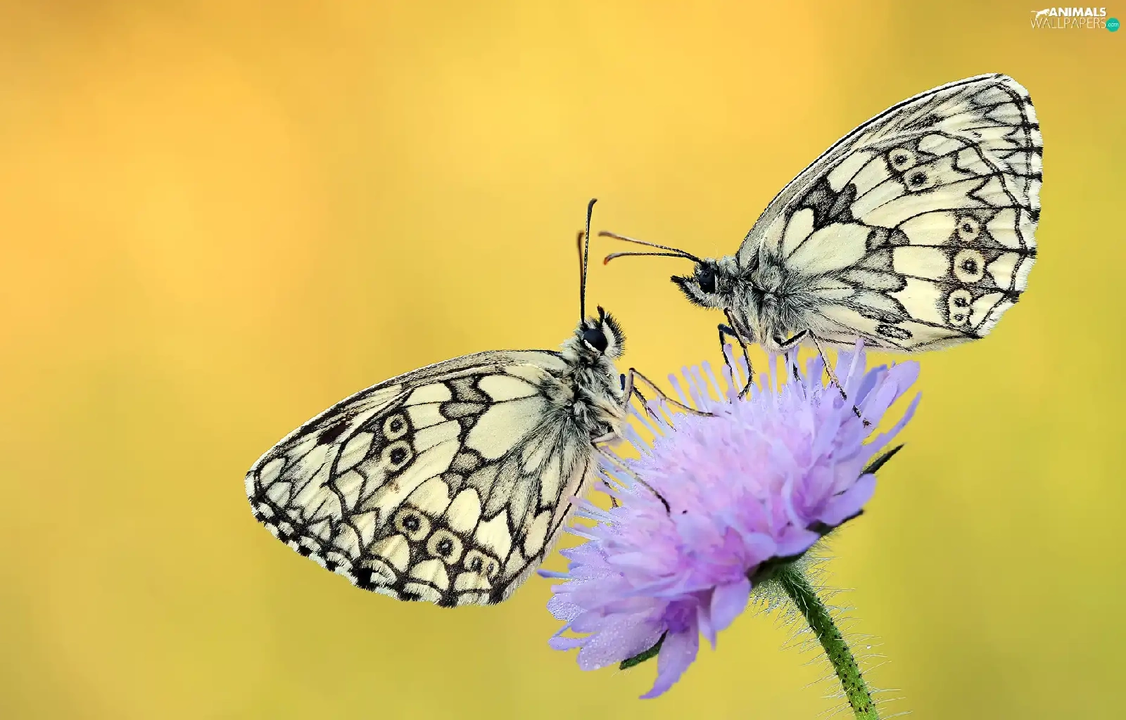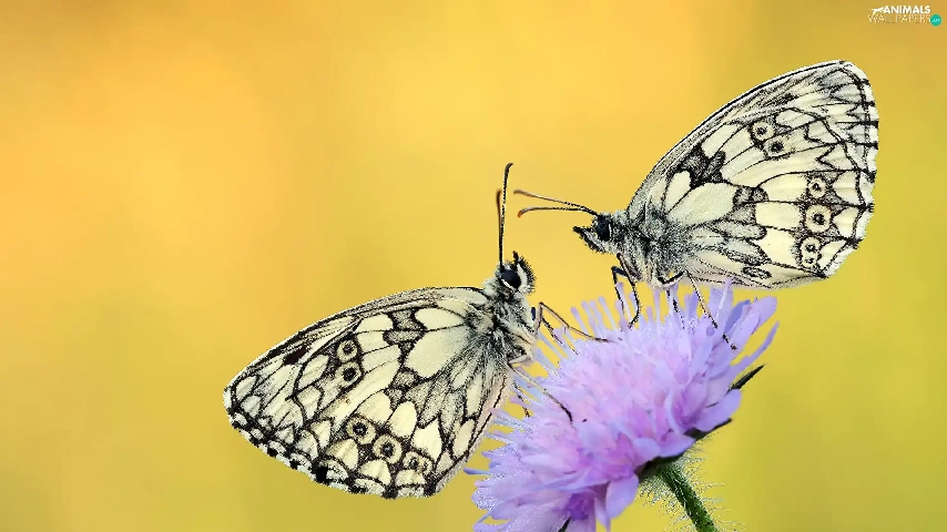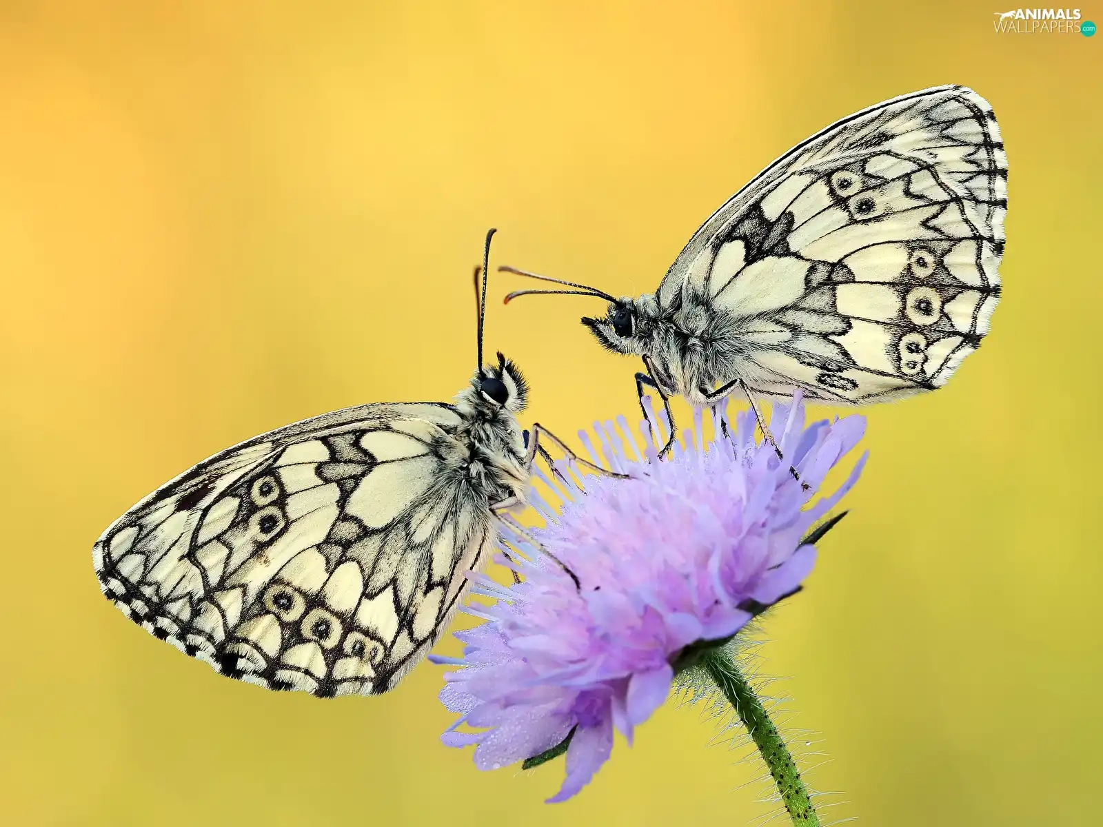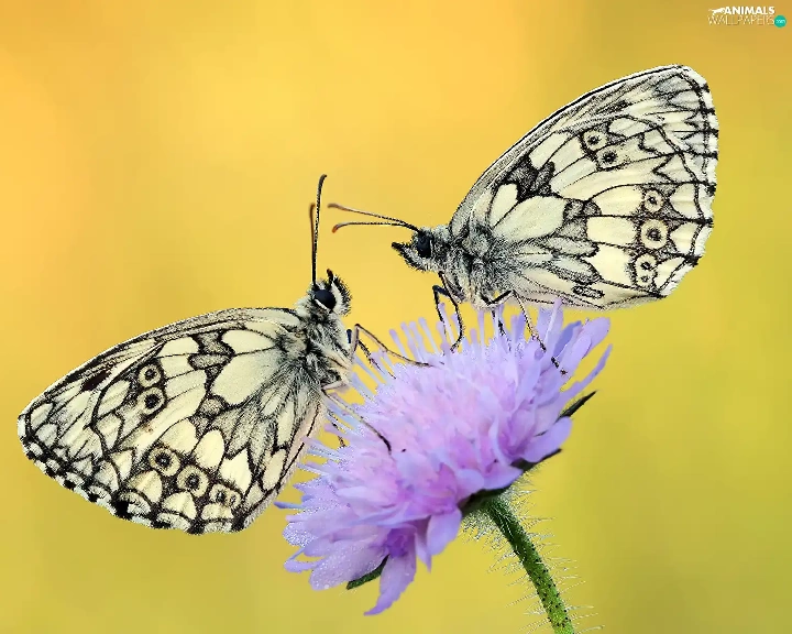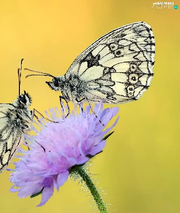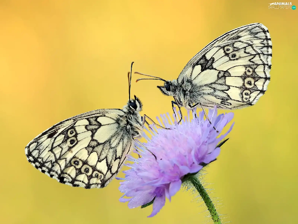 Colourfull Flowers, stalk, butterflies, marbled chessboard, Two cars