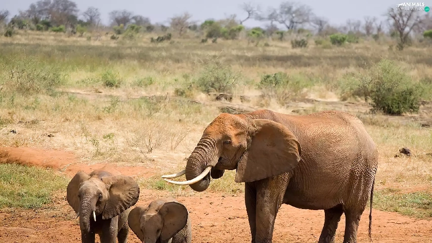 land, grass, Two cars, little doggies, Elephant