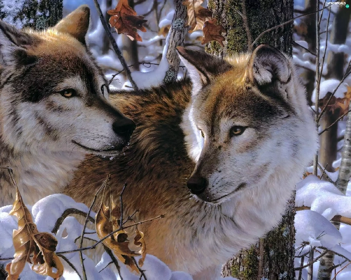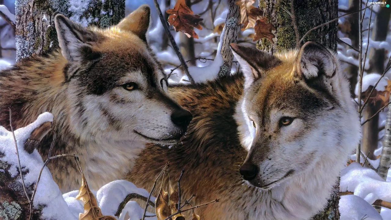 Two cars, winter, forest, wolves