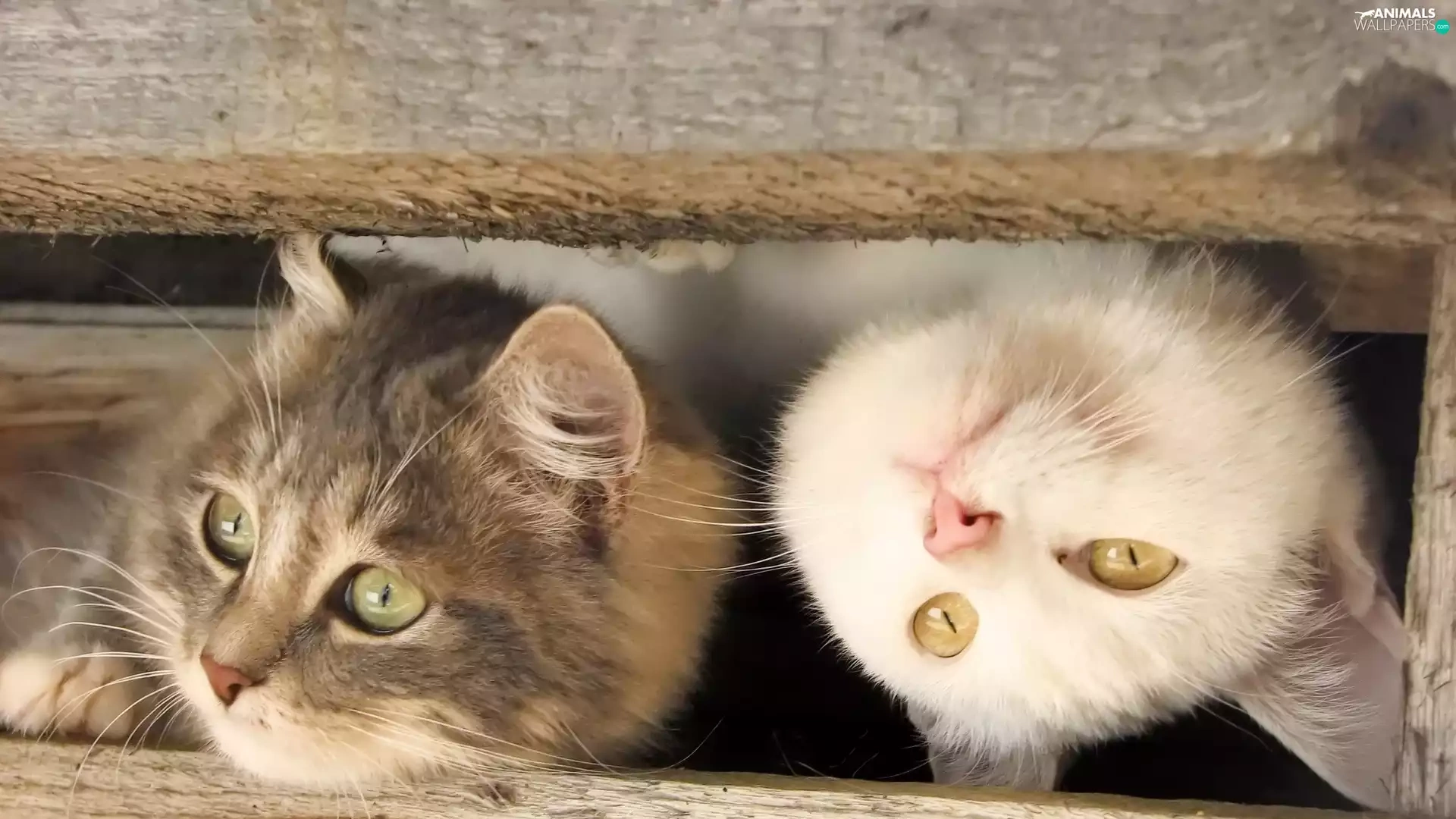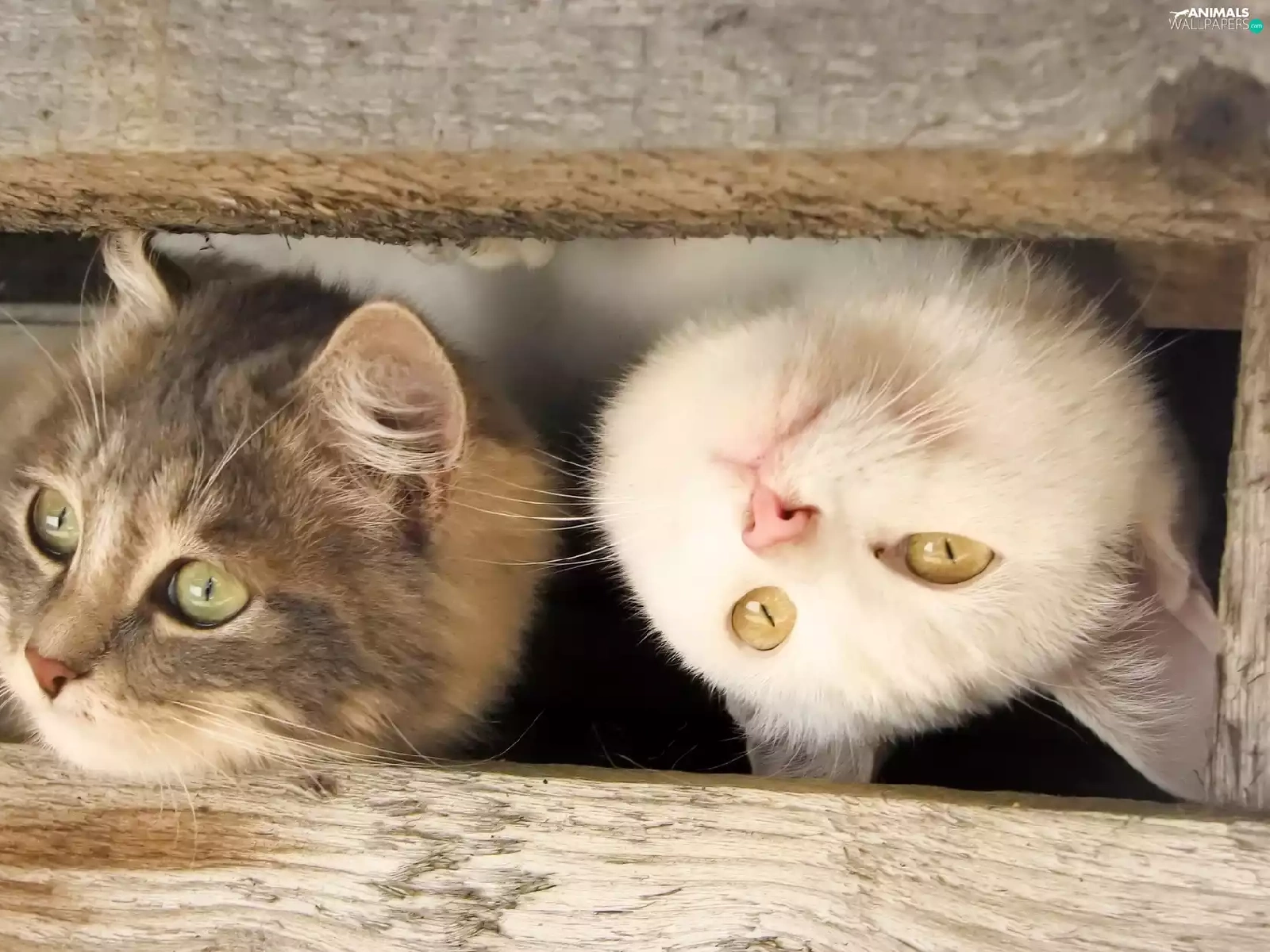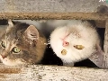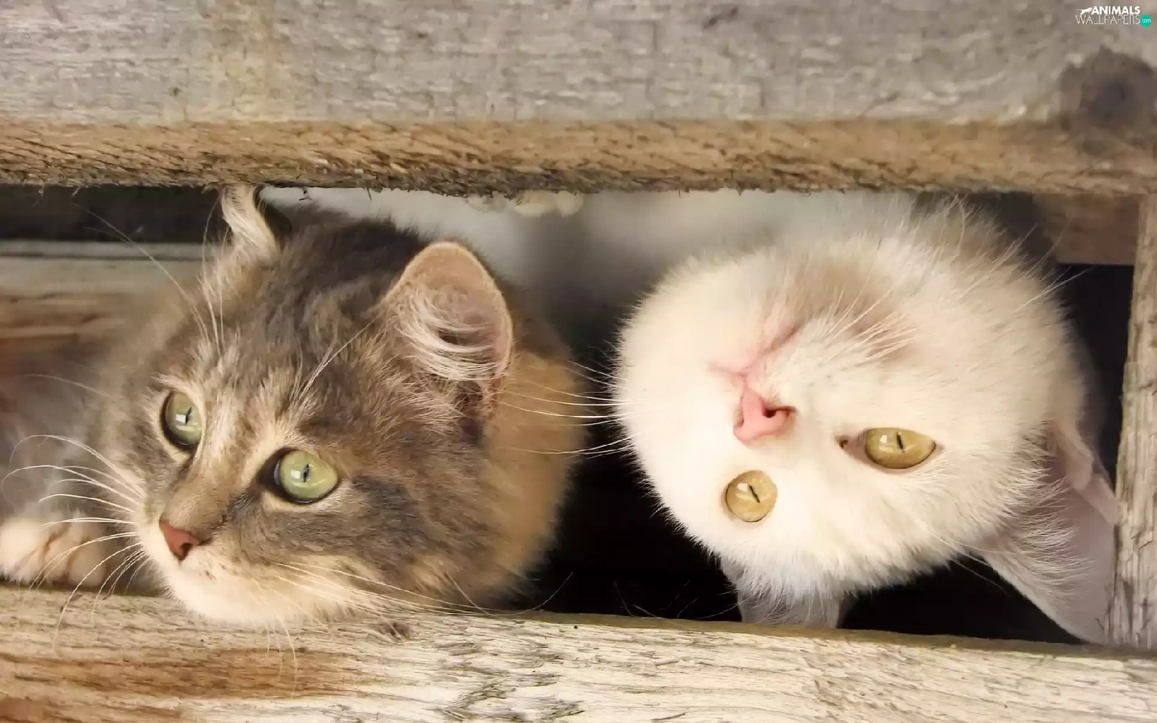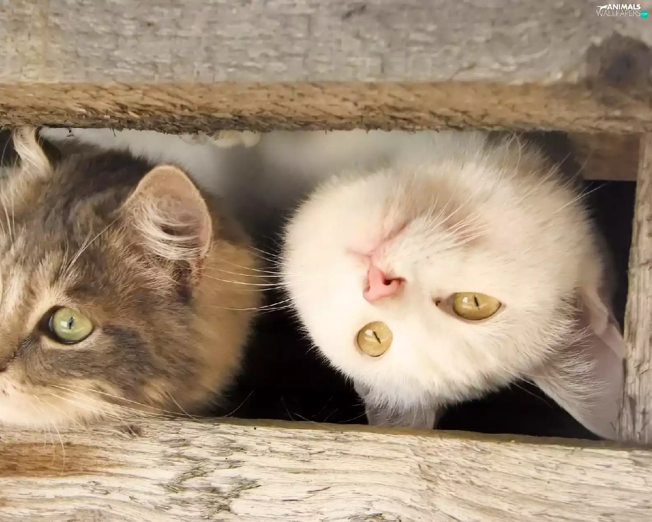 Two cars, wood, fence, cats