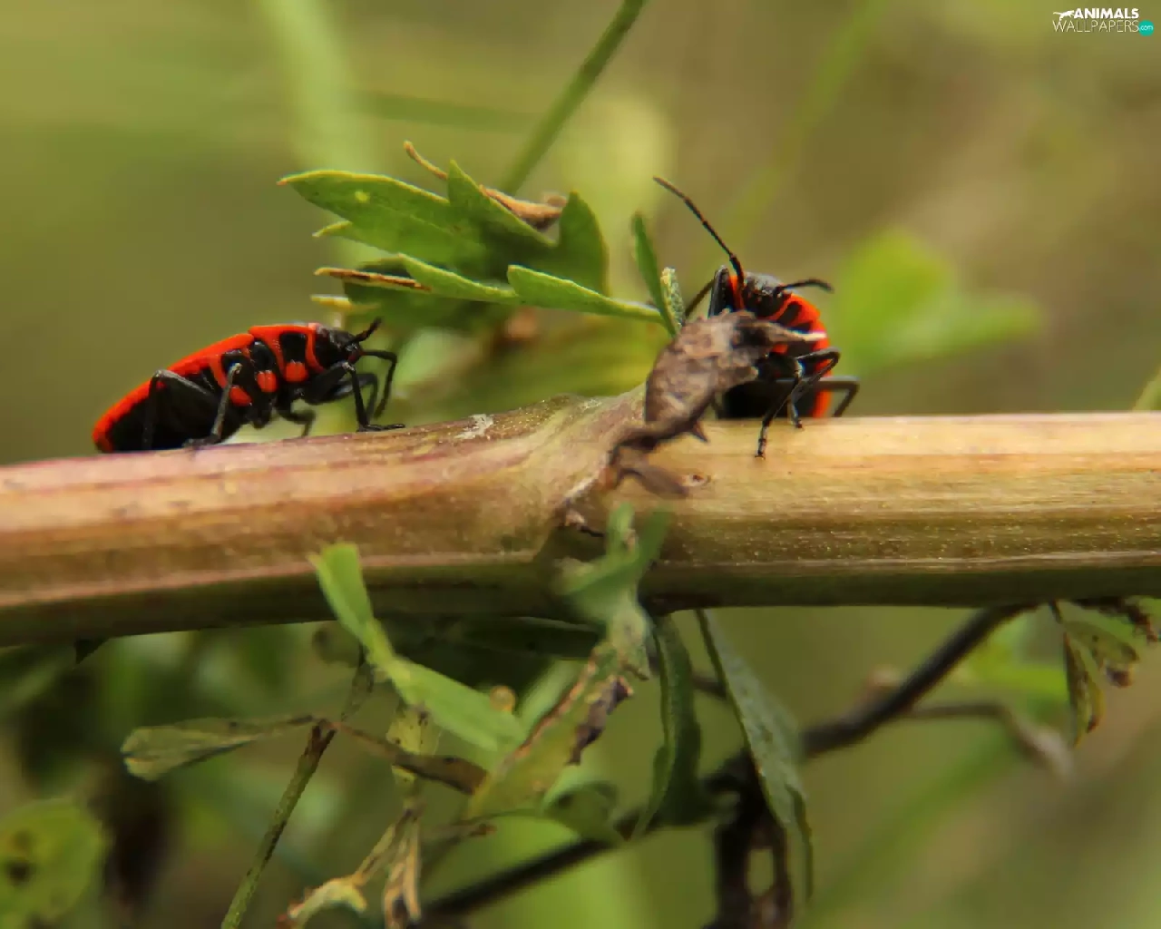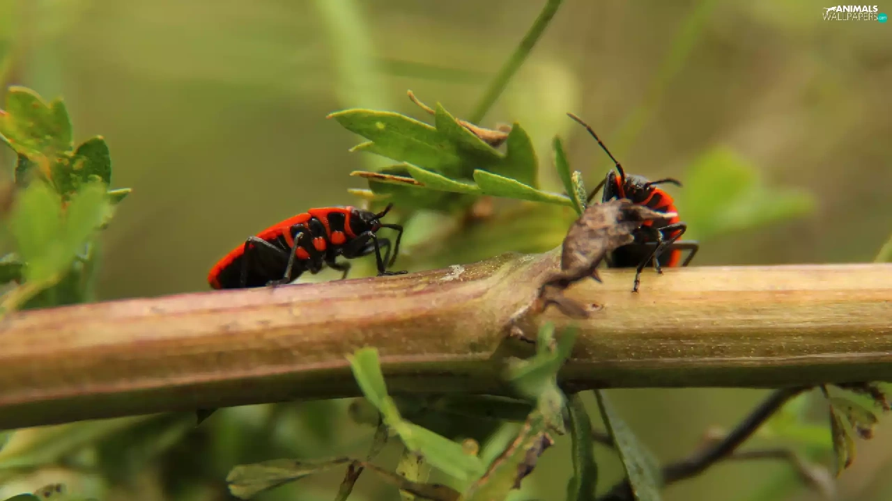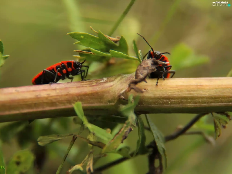 Two cars, worms, twig, Red
