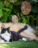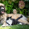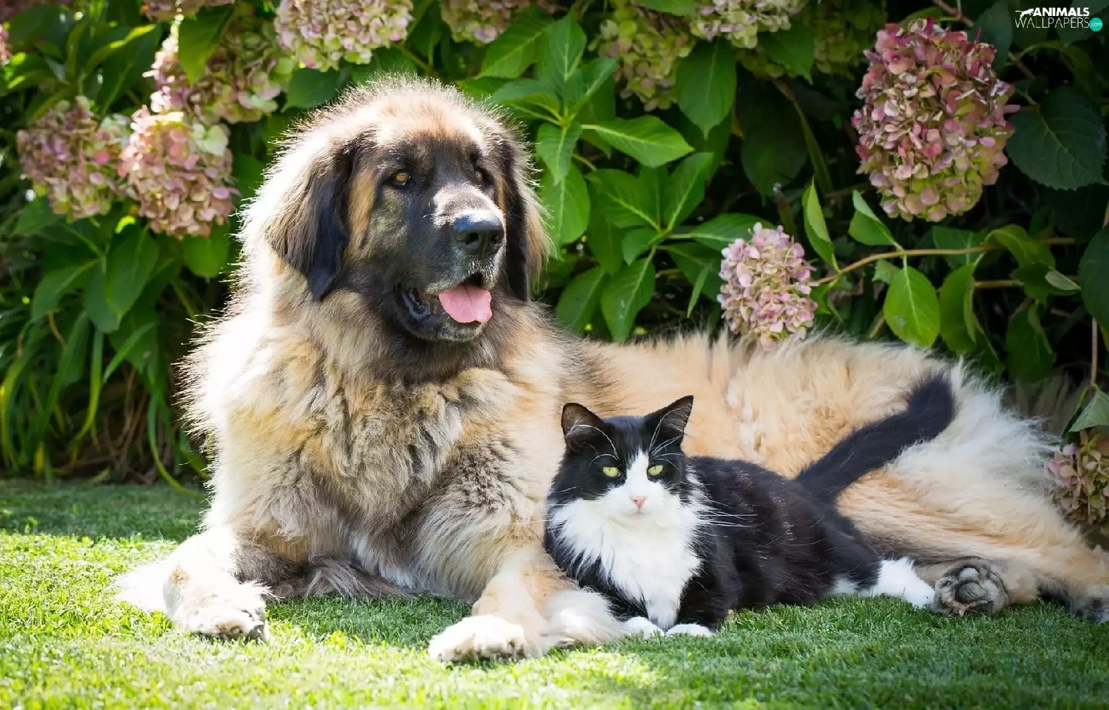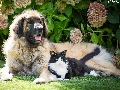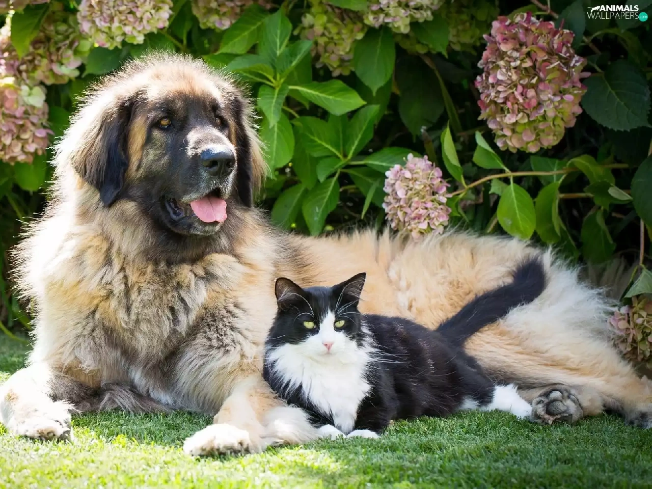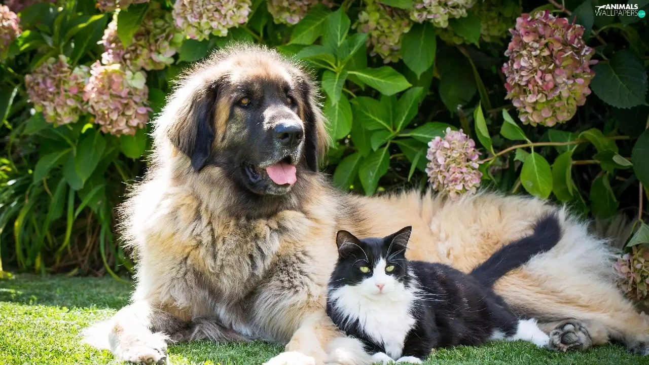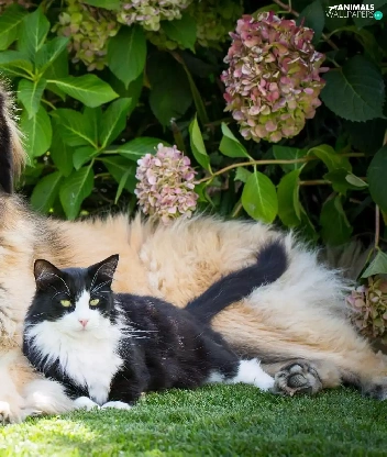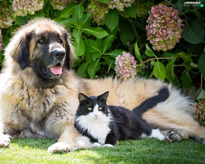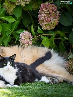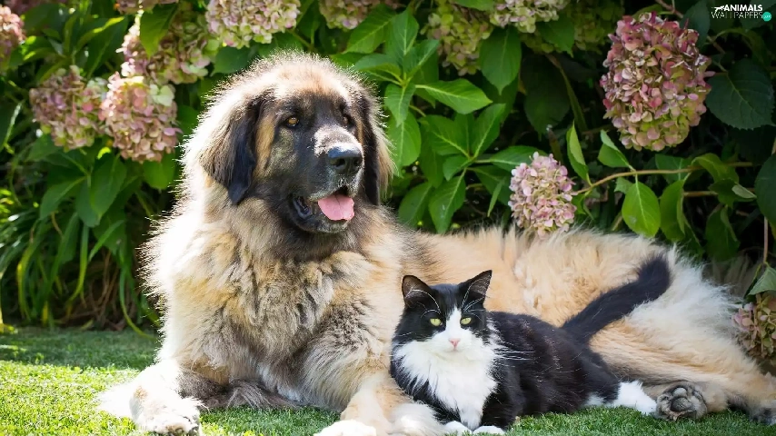 dog, Flowers, hydrangea, cat