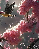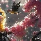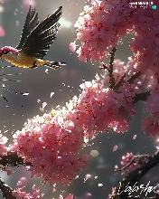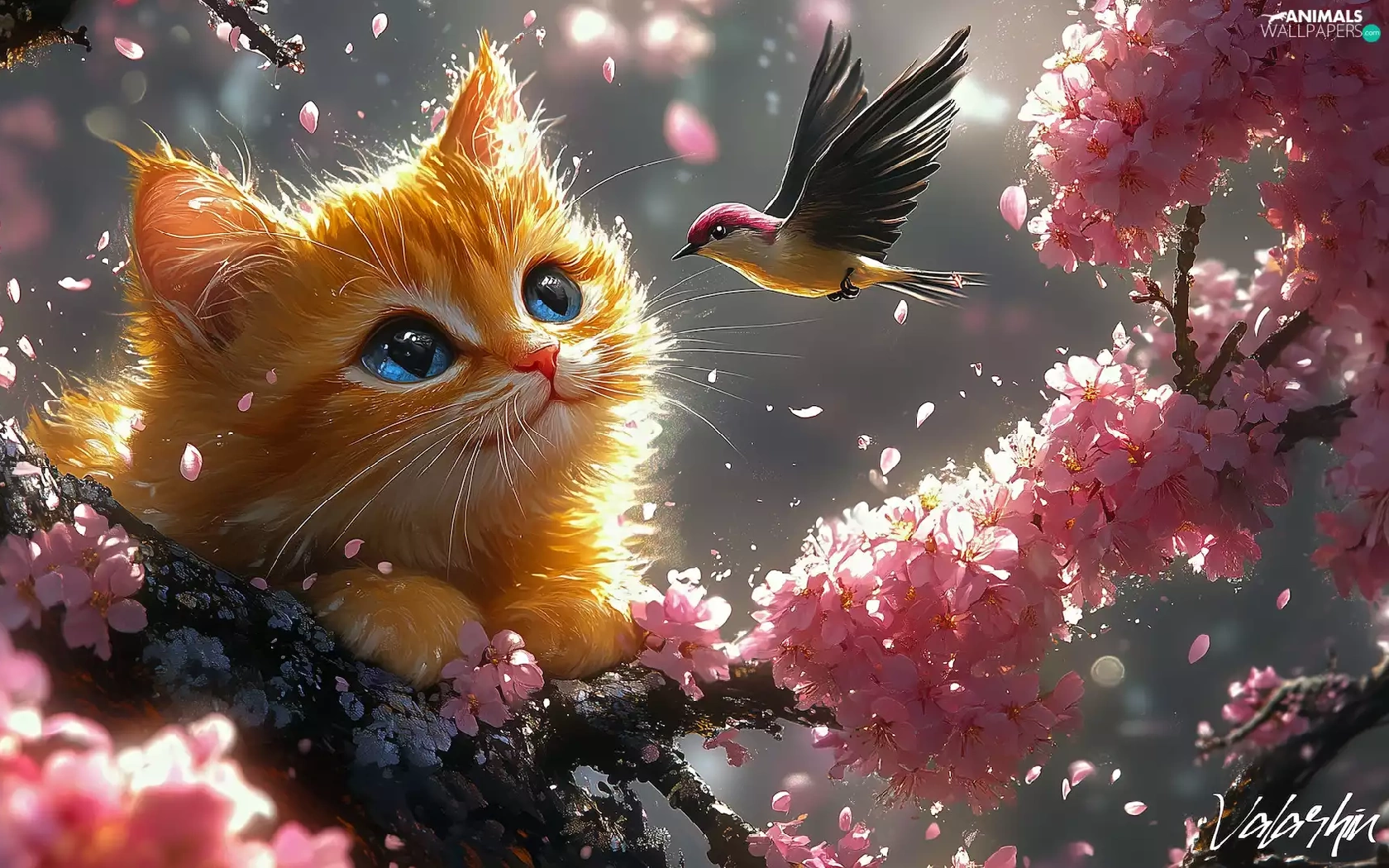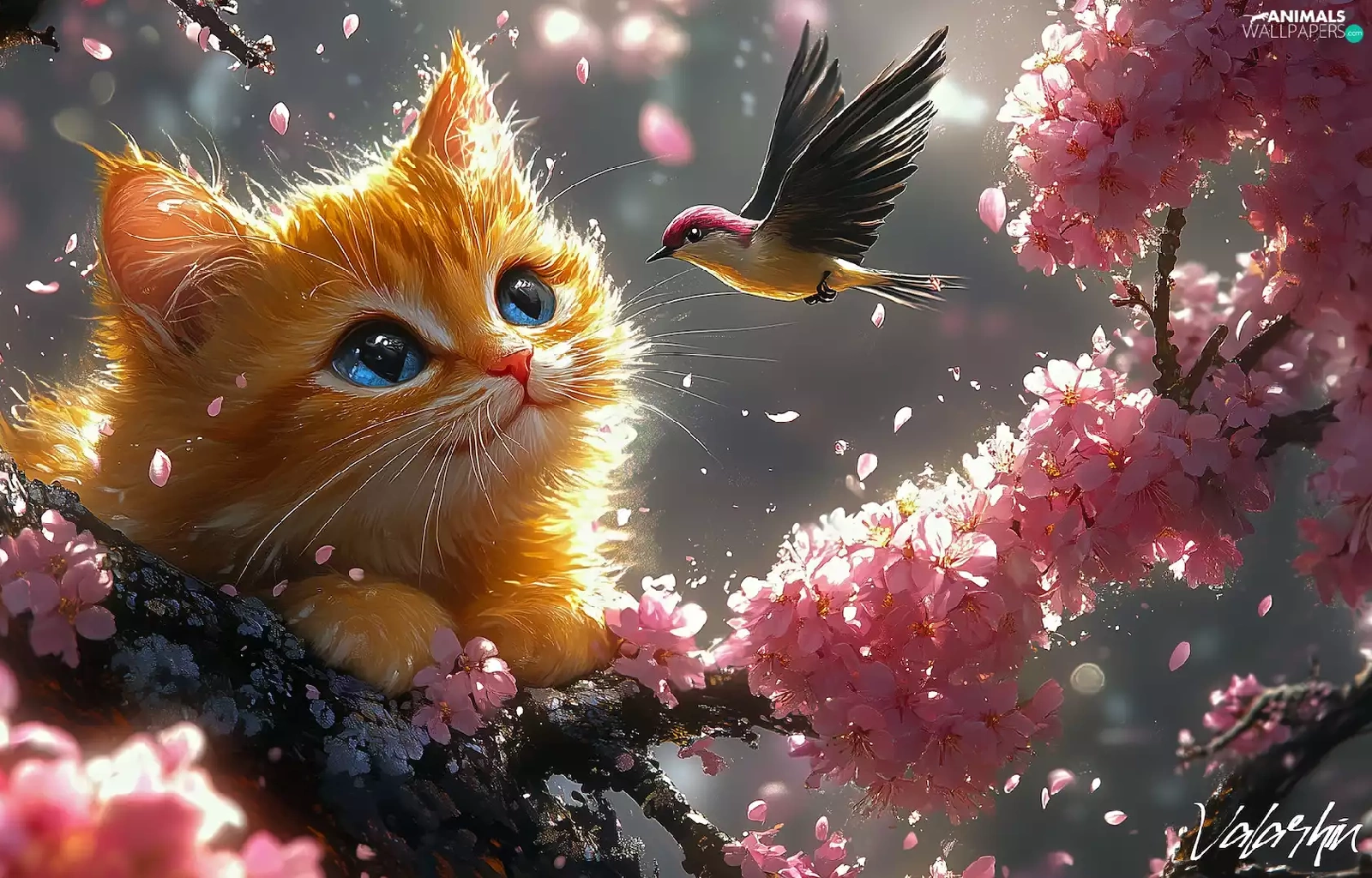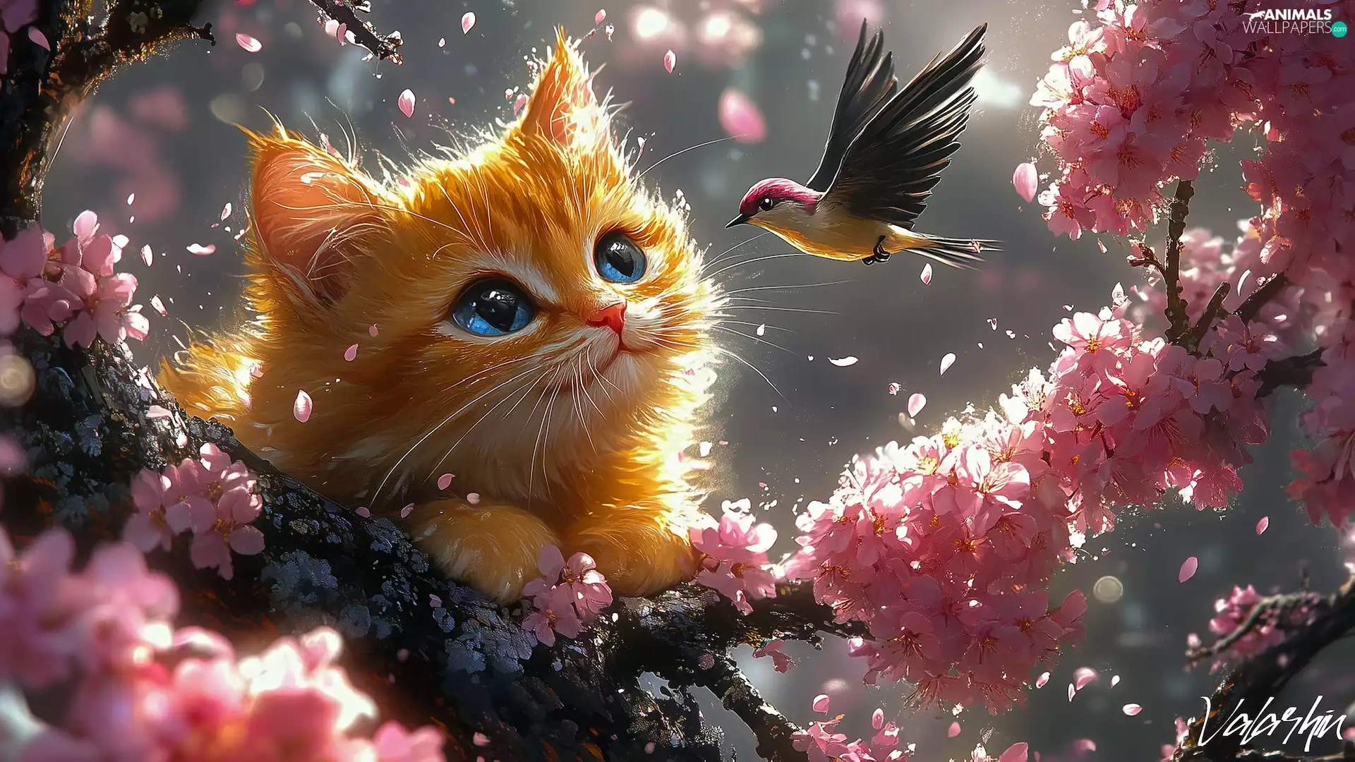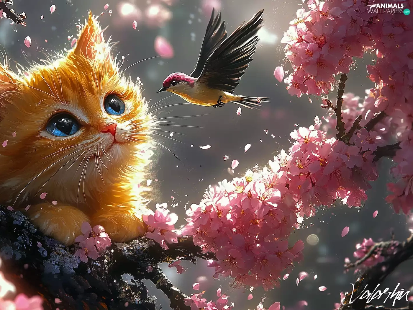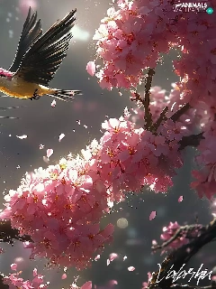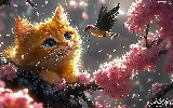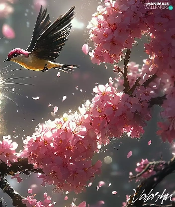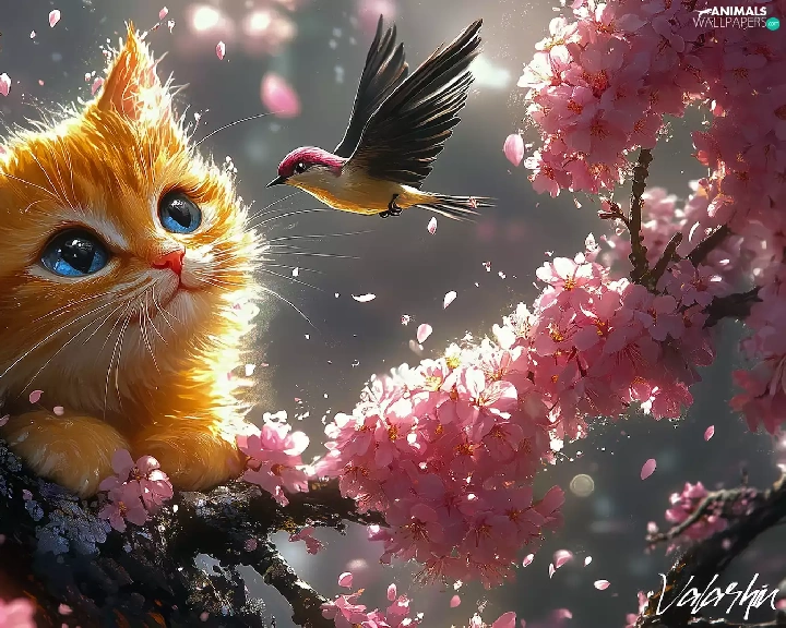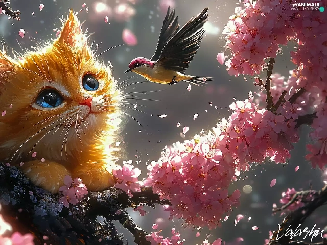 Bird, ginger, Flowers, cat, graphics, twig, Pink