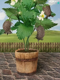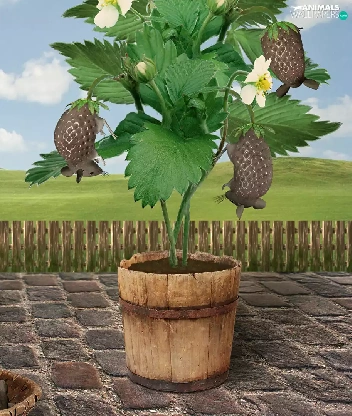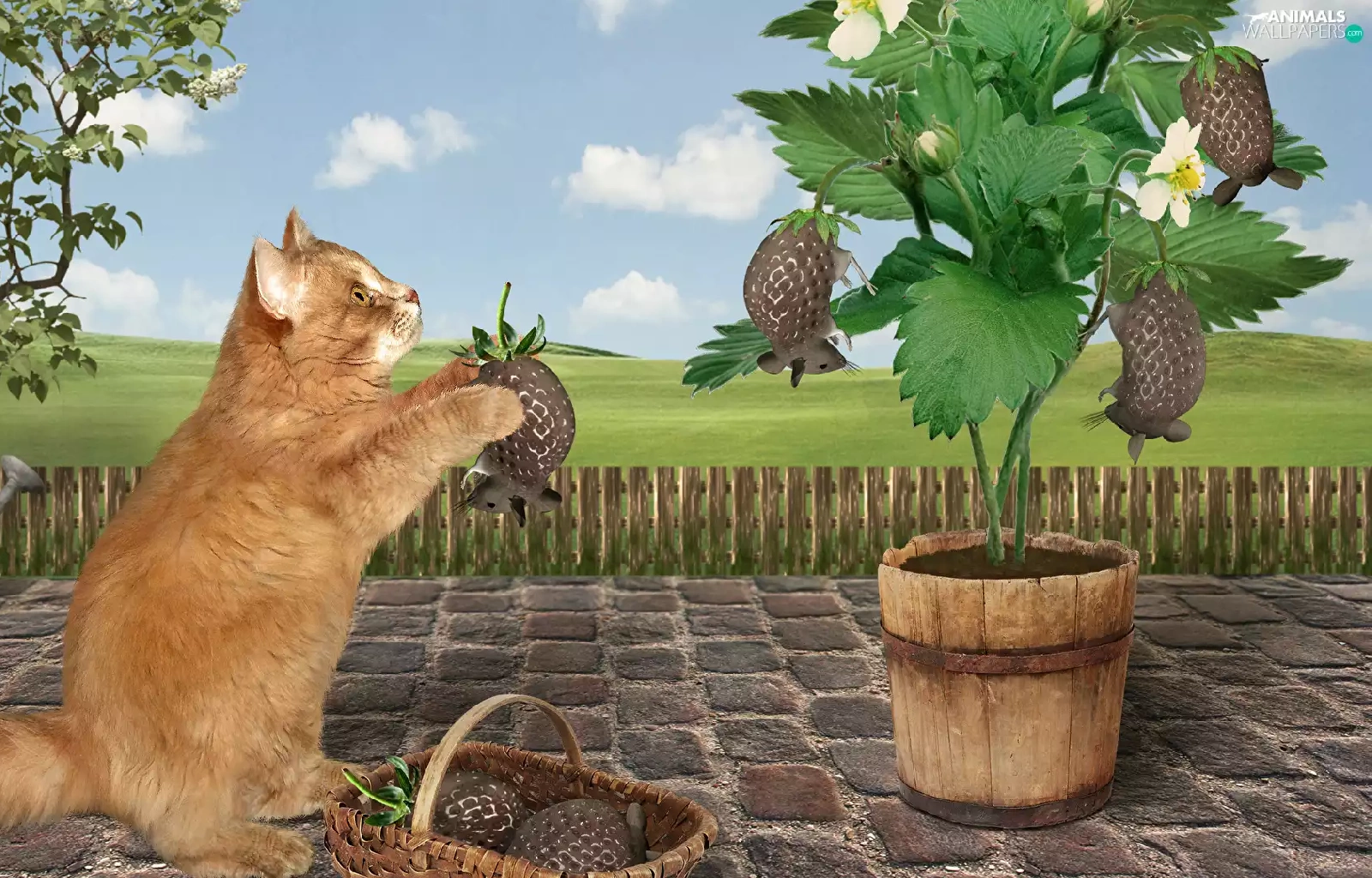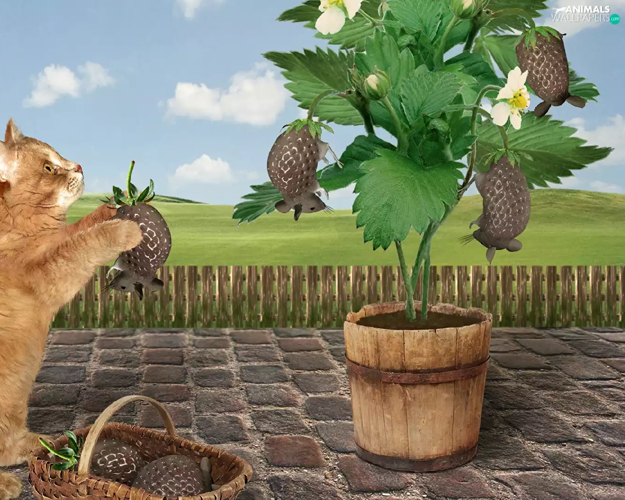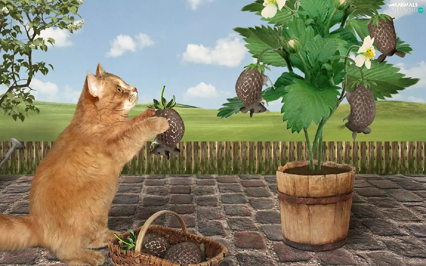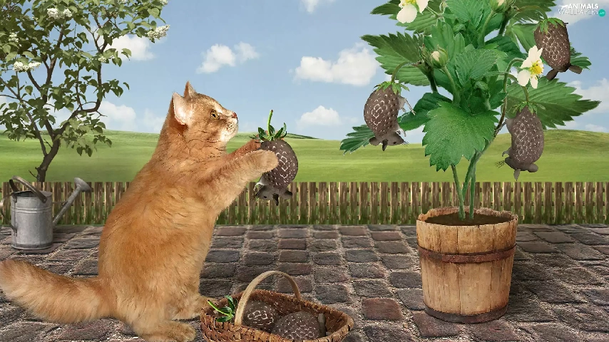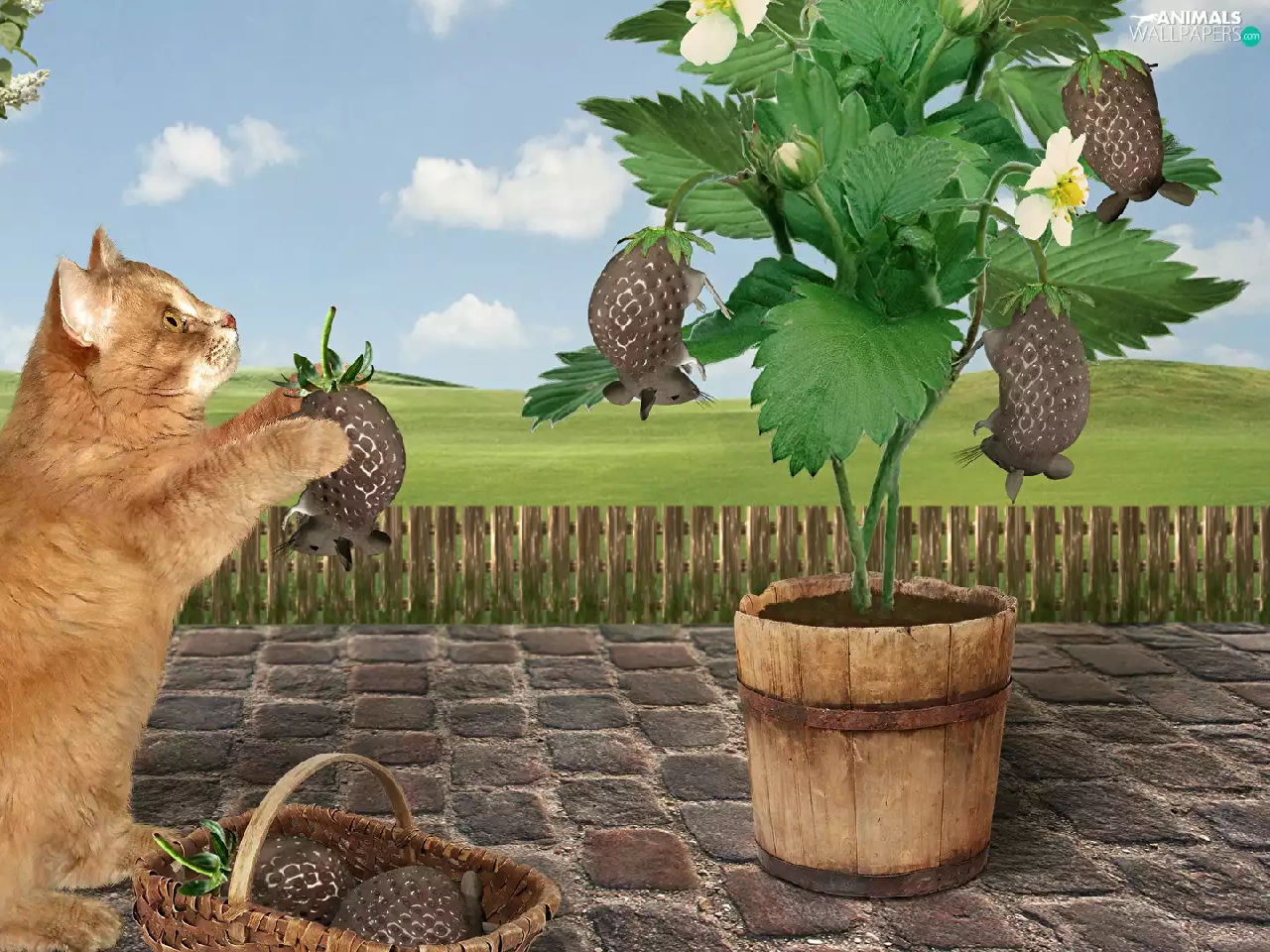 watering can, bowl, mouse, grass, Strawberry, cat, Fruits, 2D, fence, basket