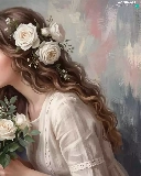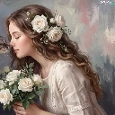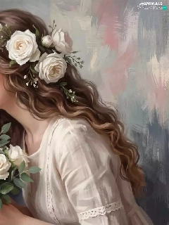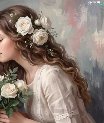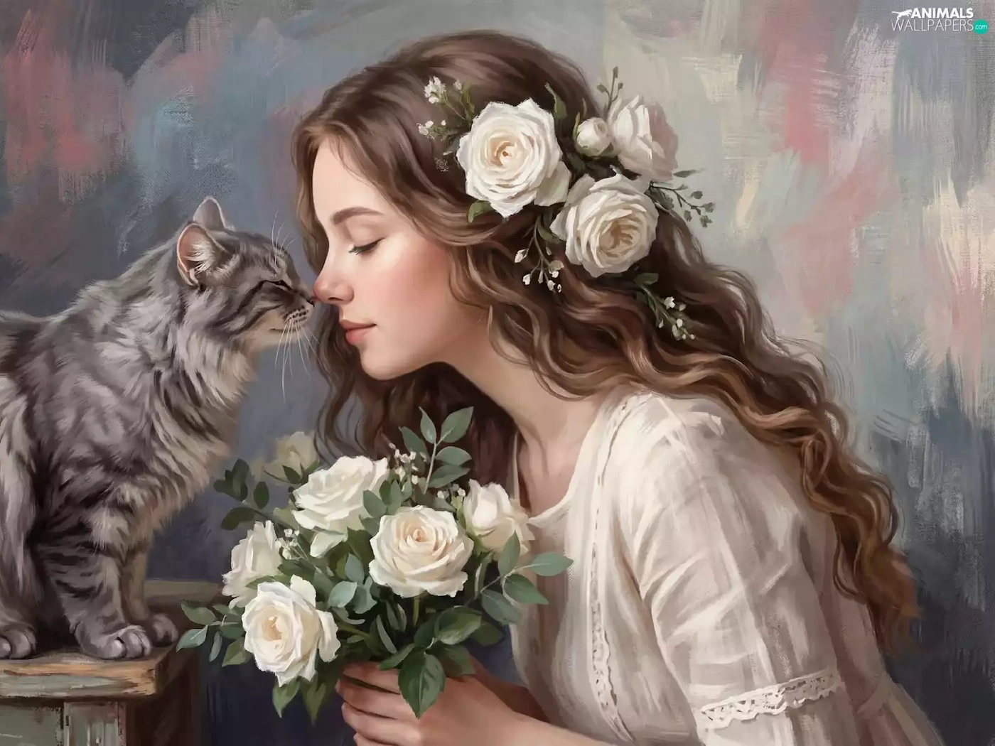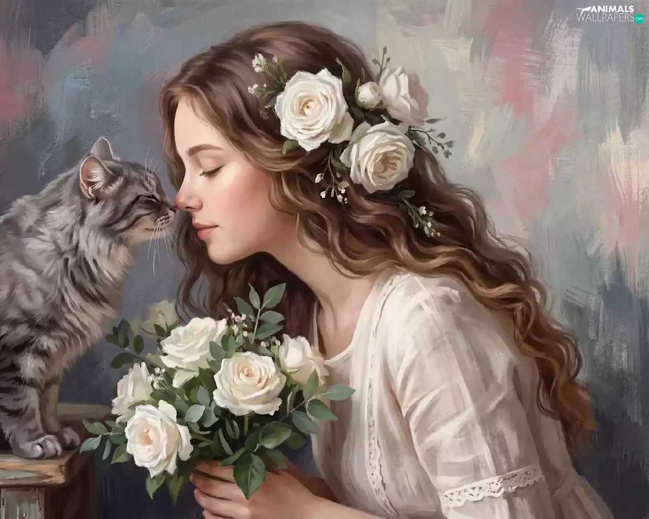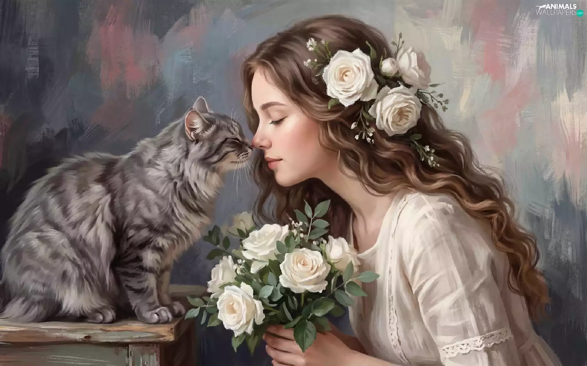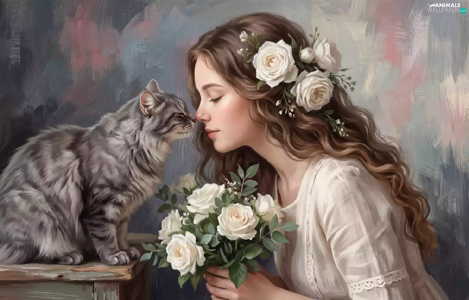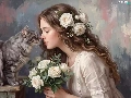 roses, cat, girl, longhaired, graphics