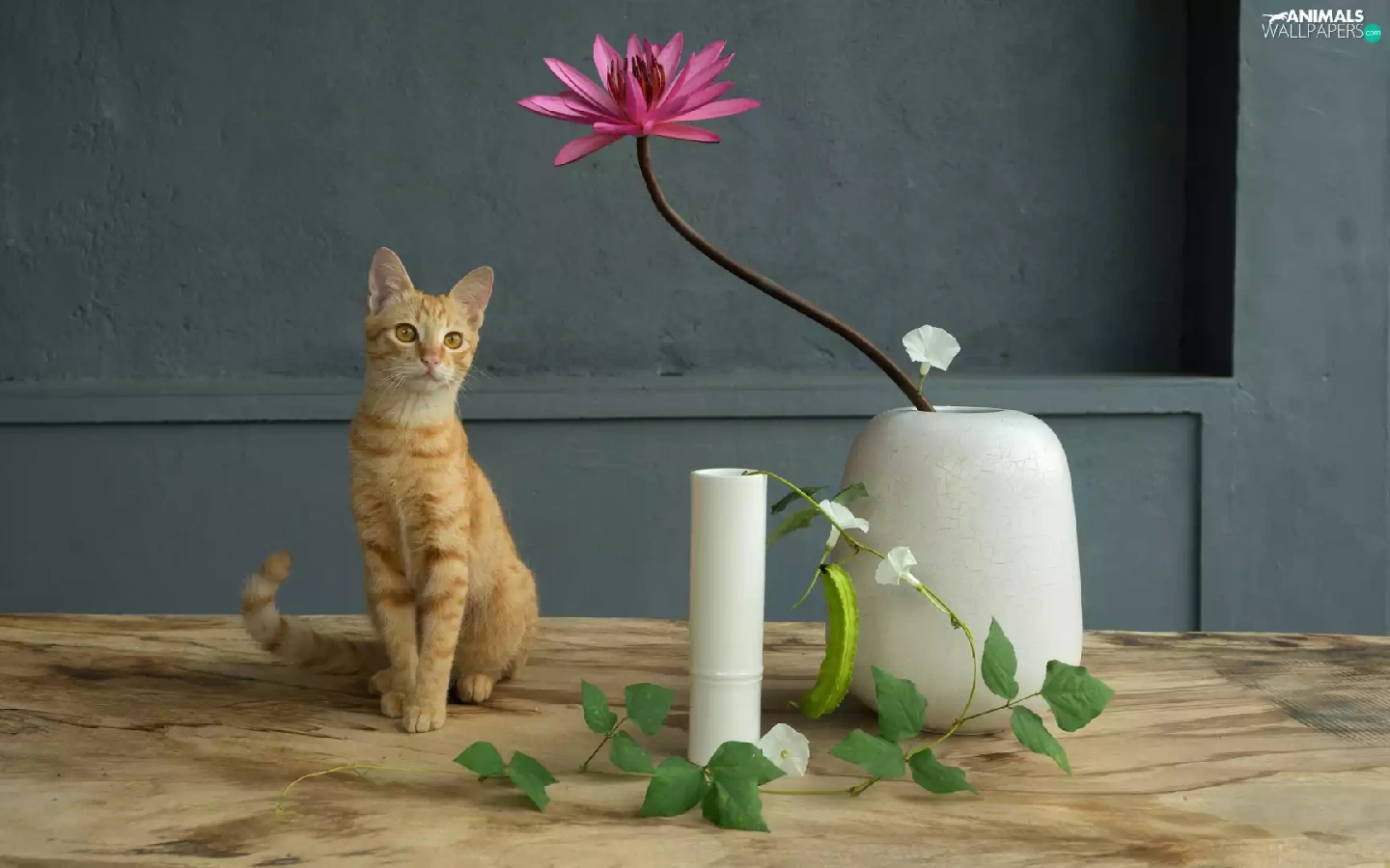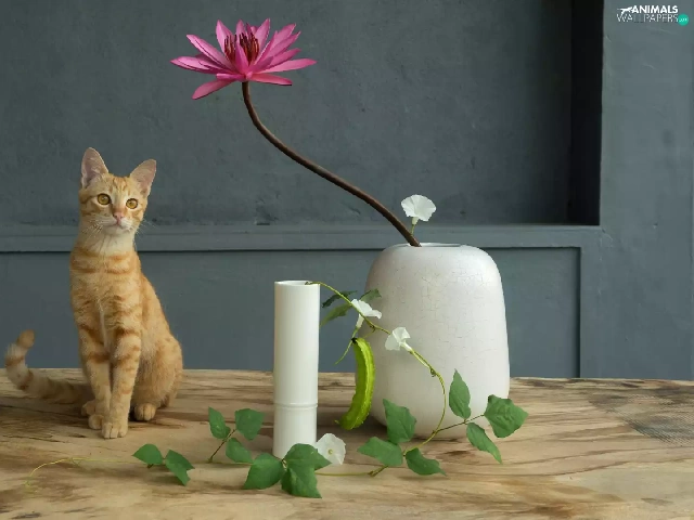 water-lily, bindweed, cat, Vase, sitter