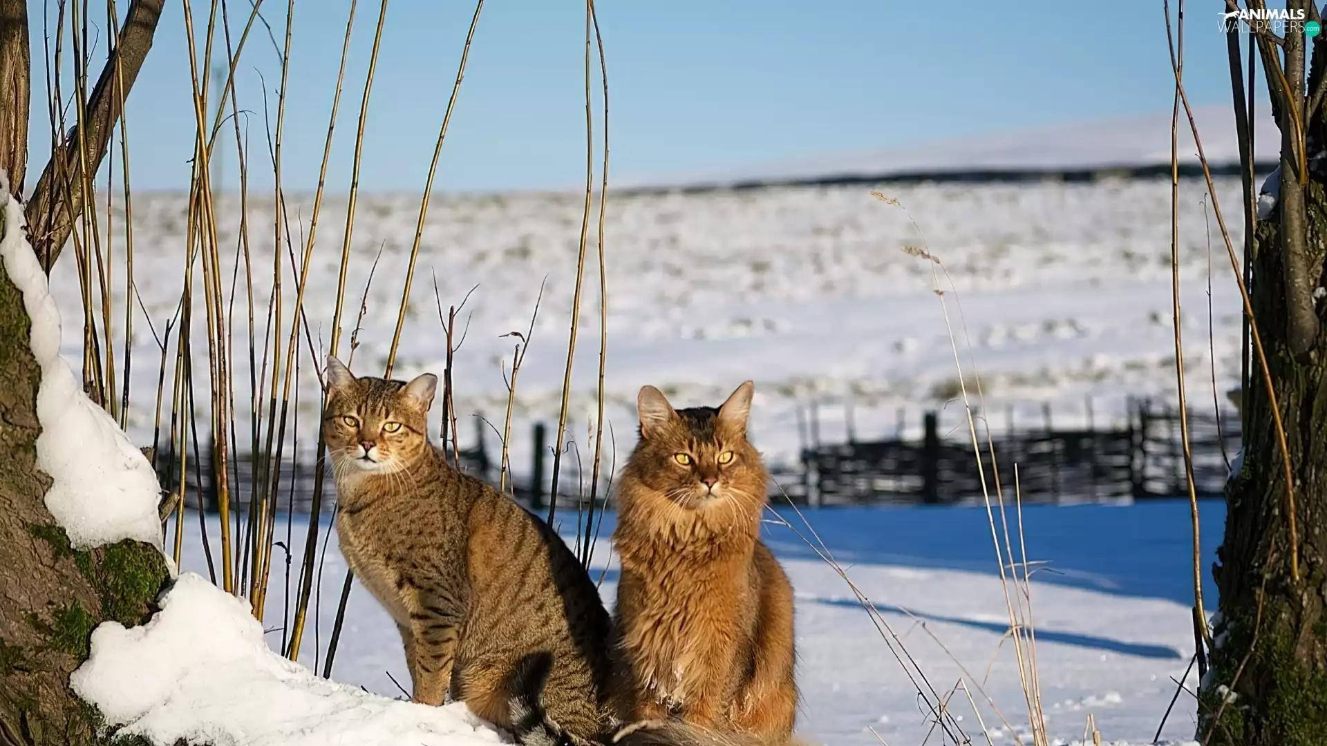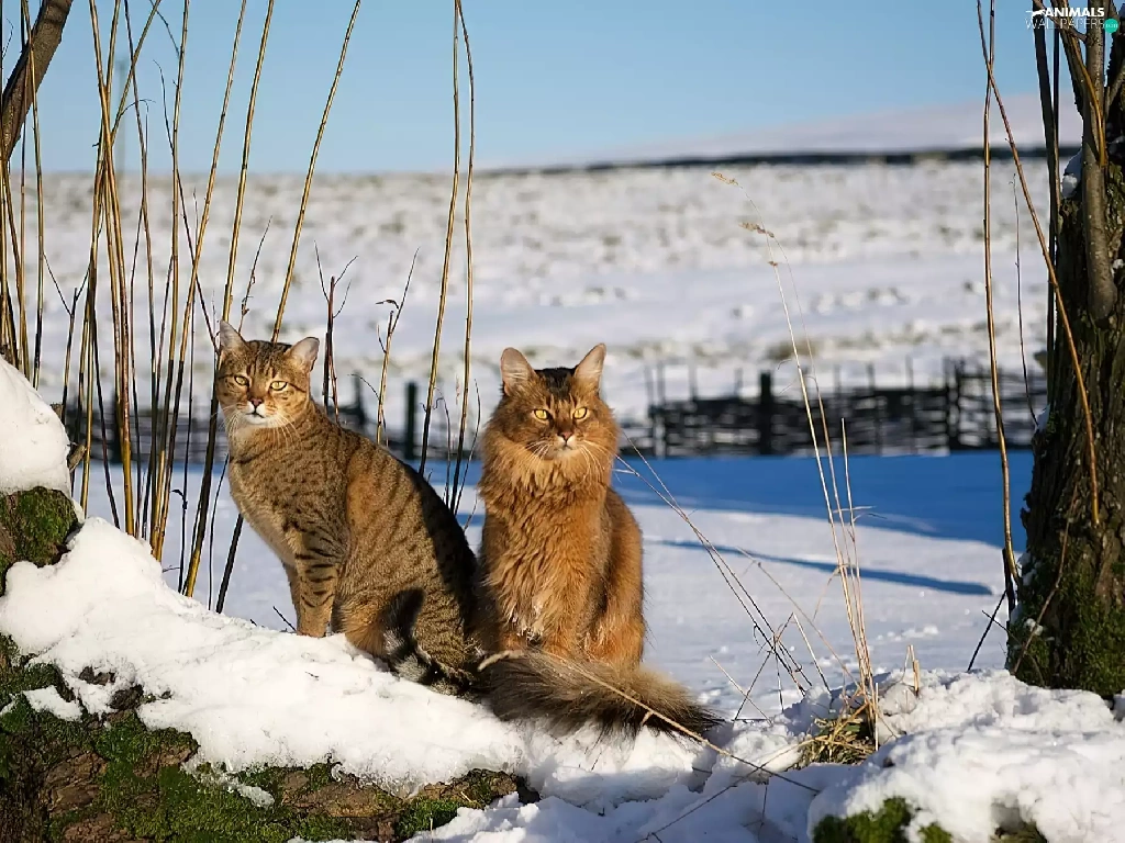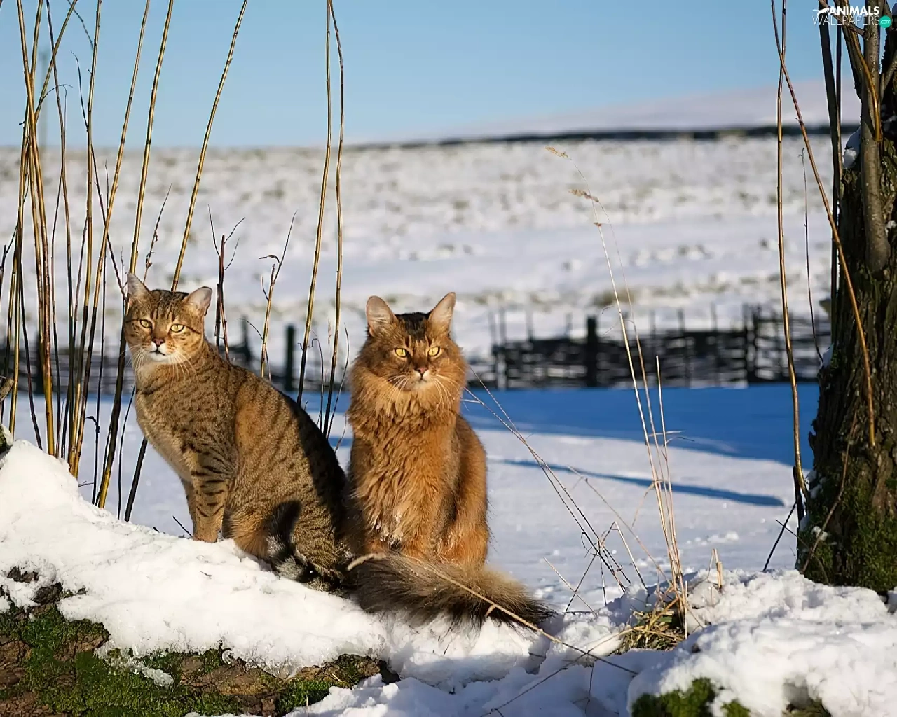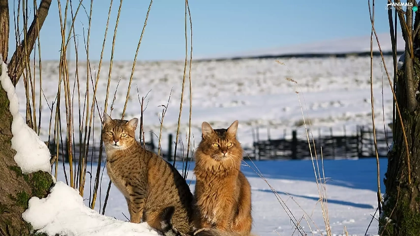 snow, Two cars, cats