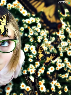 look, girl, butterflies, chamomile, Glasses, face
