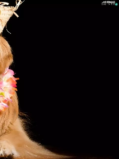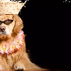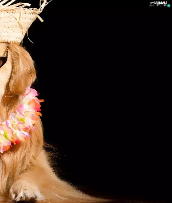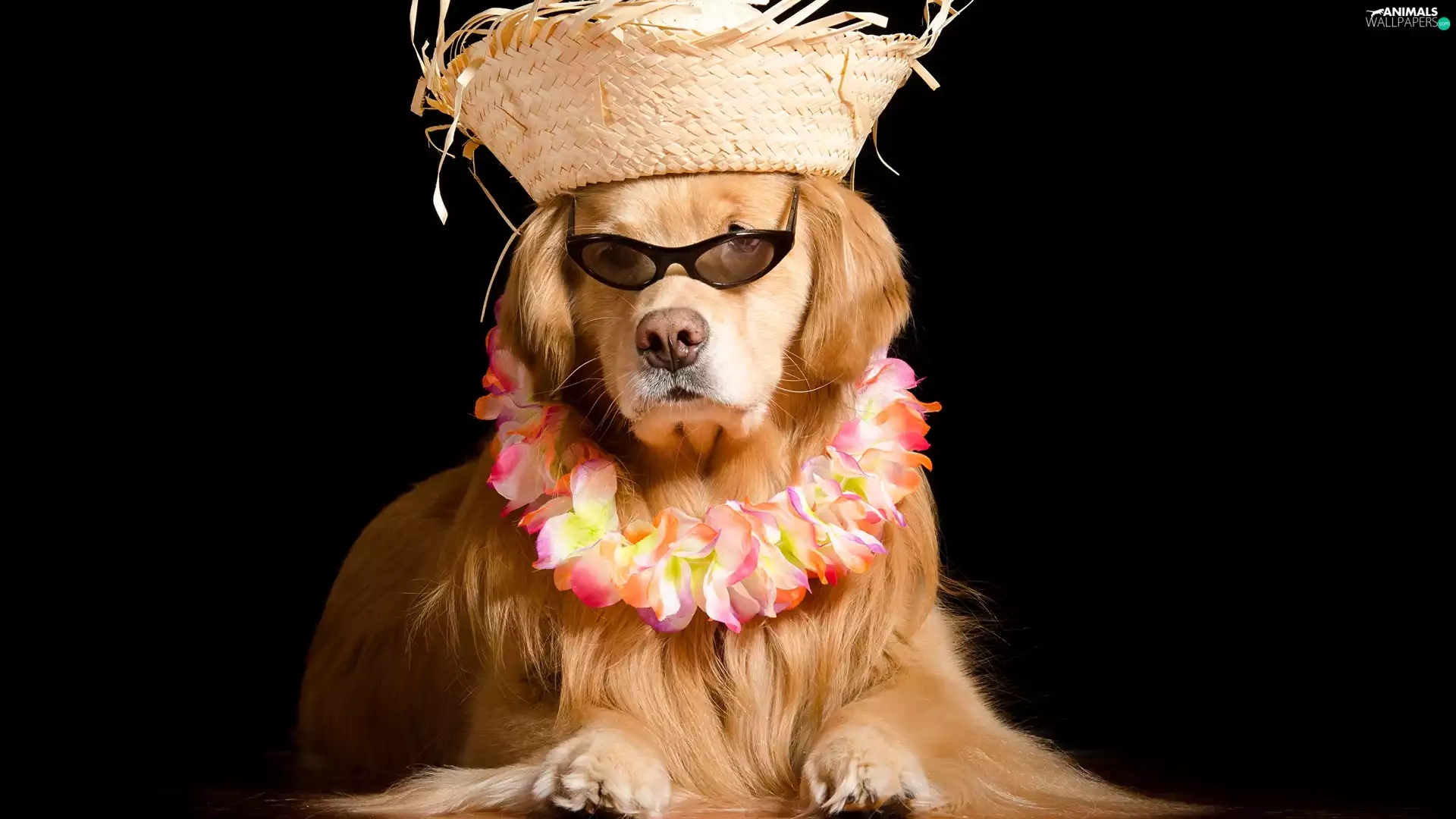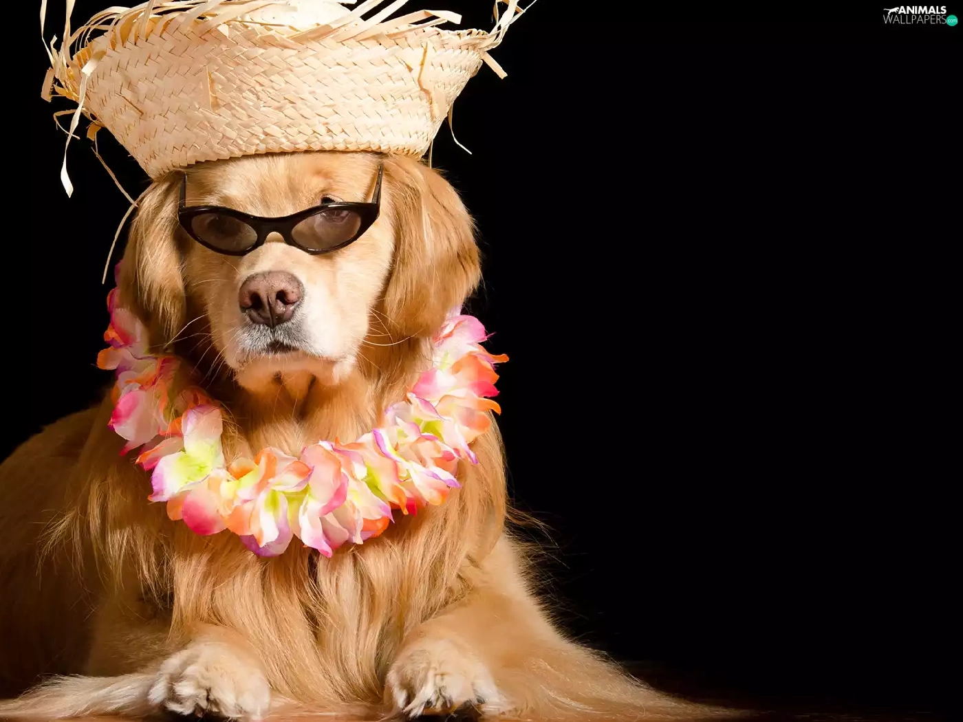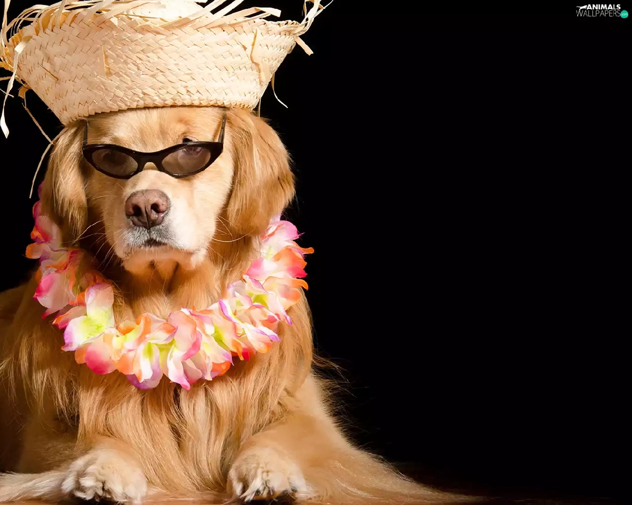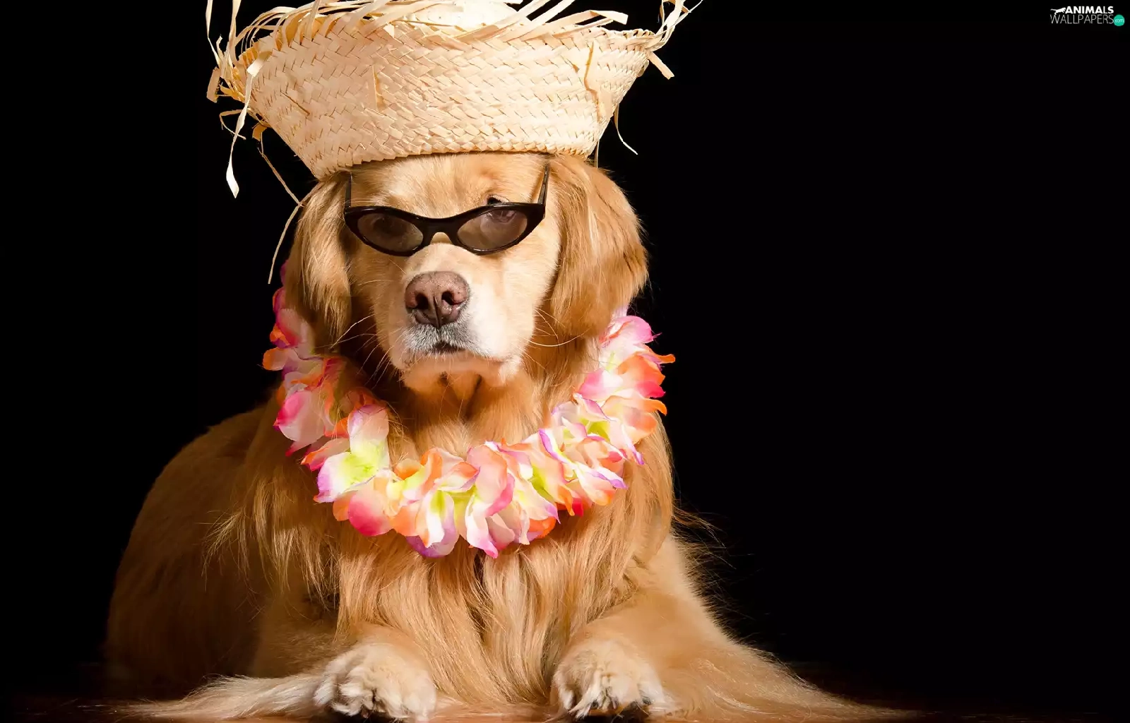Hat, dog, Flowers, chaplet, Glasses, Golden Retriever