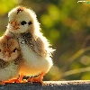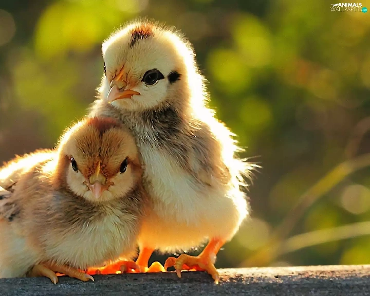 trees, Two cars, chickens