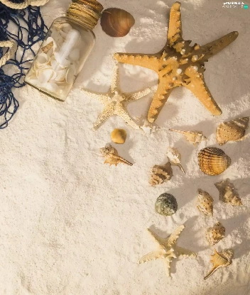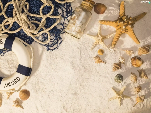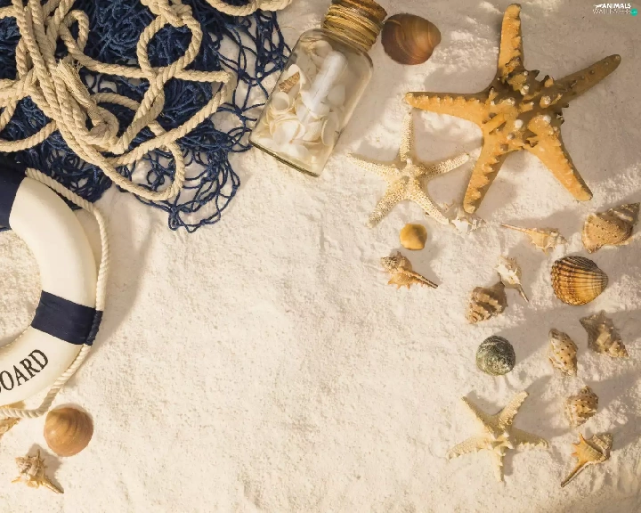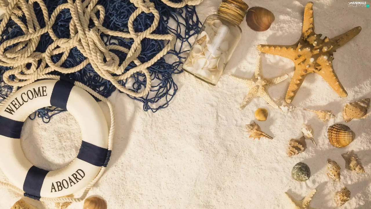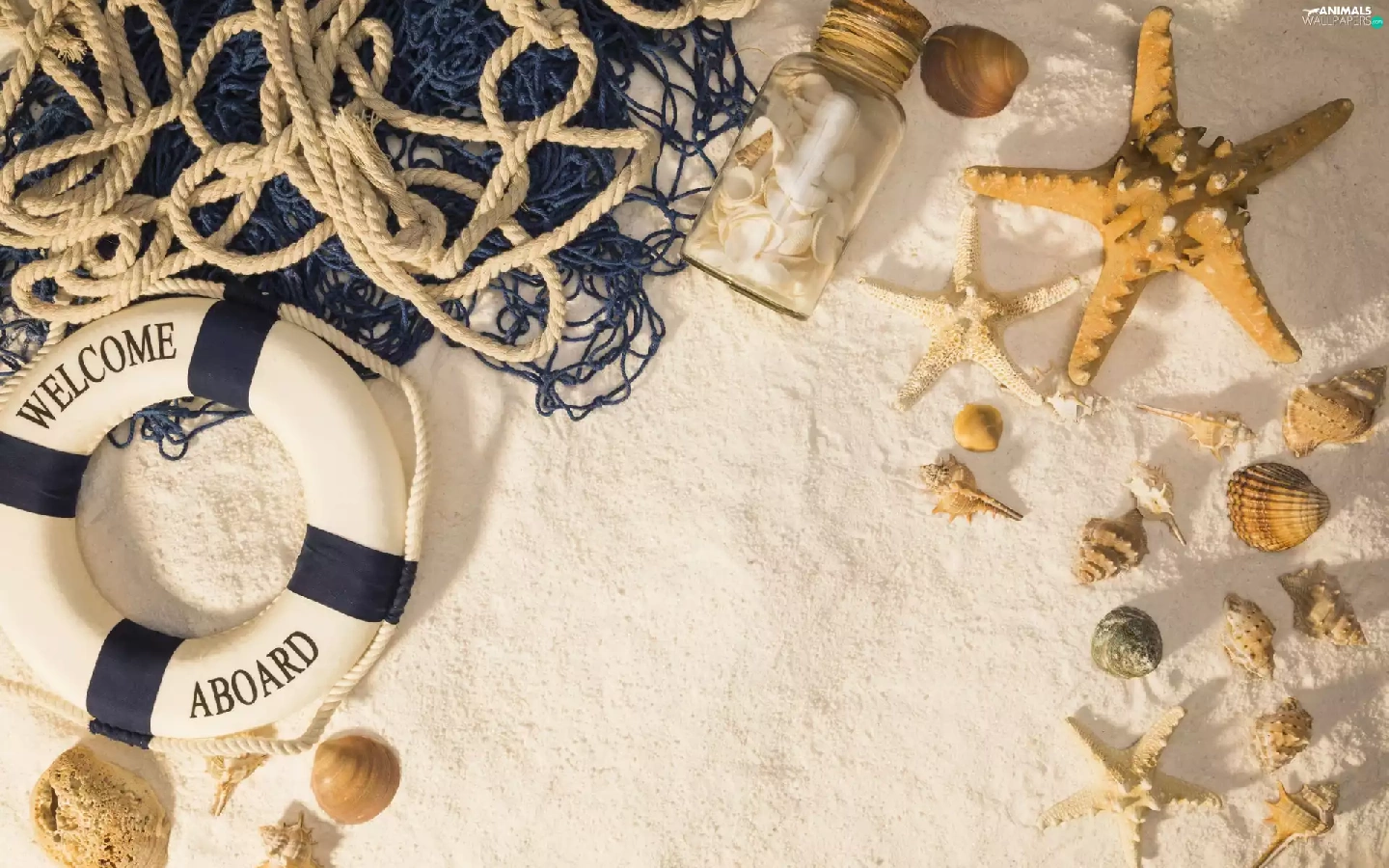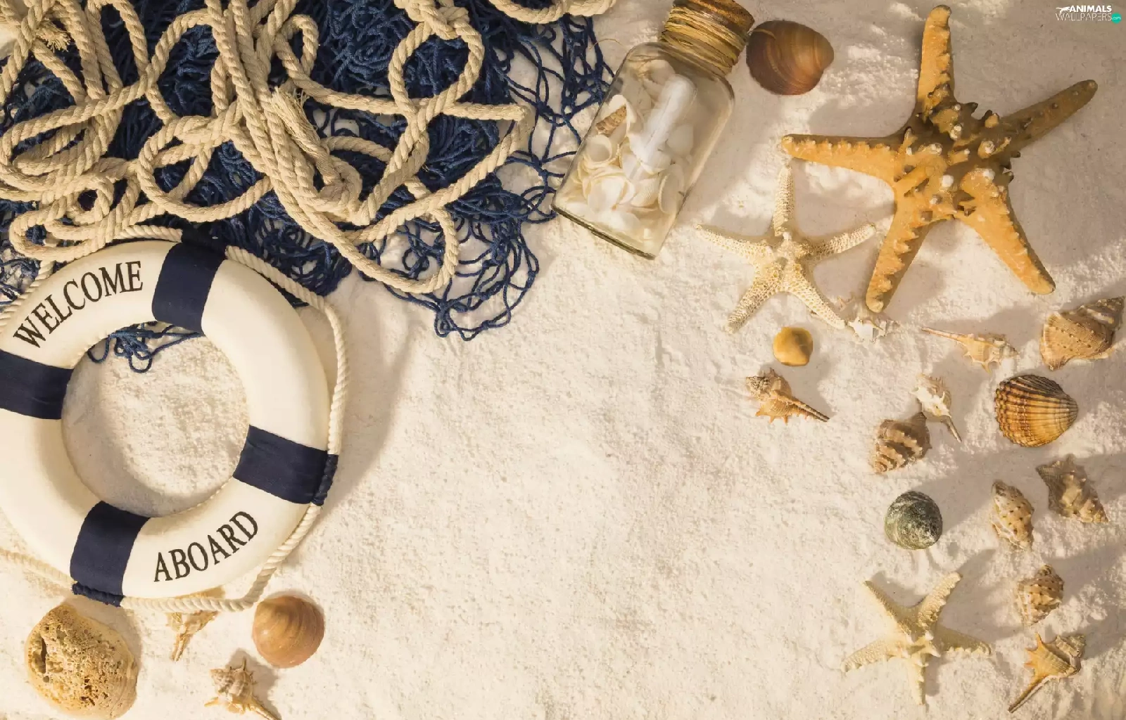 circle, Sand, rescue, ropes, Shells, composition, Bottle, starfish, net