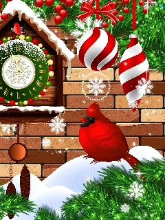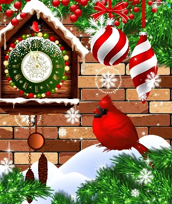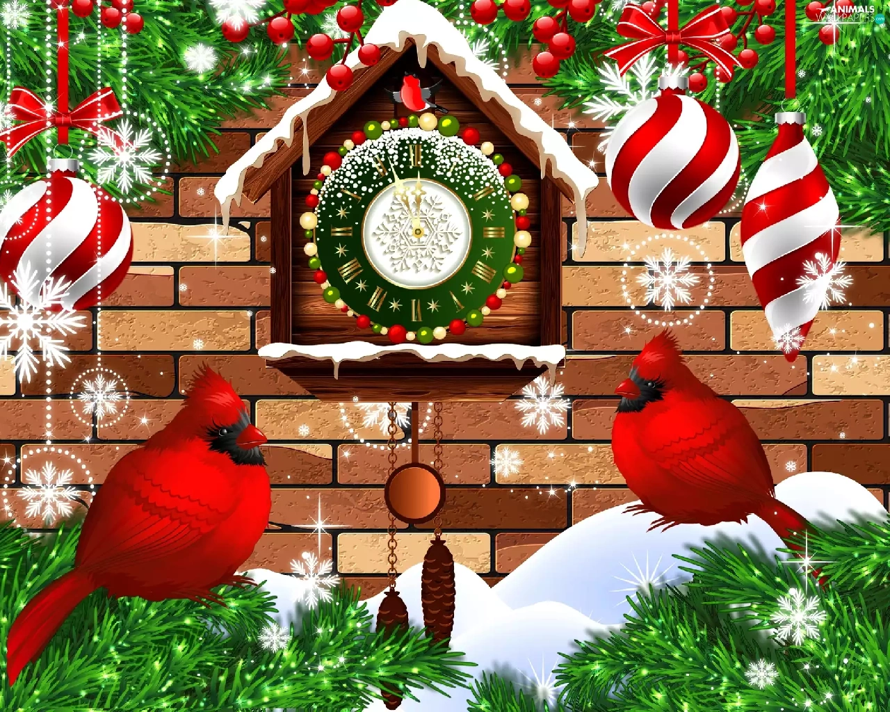 birds, Northern Cardinal, Clock, baubles, 2D Graphics