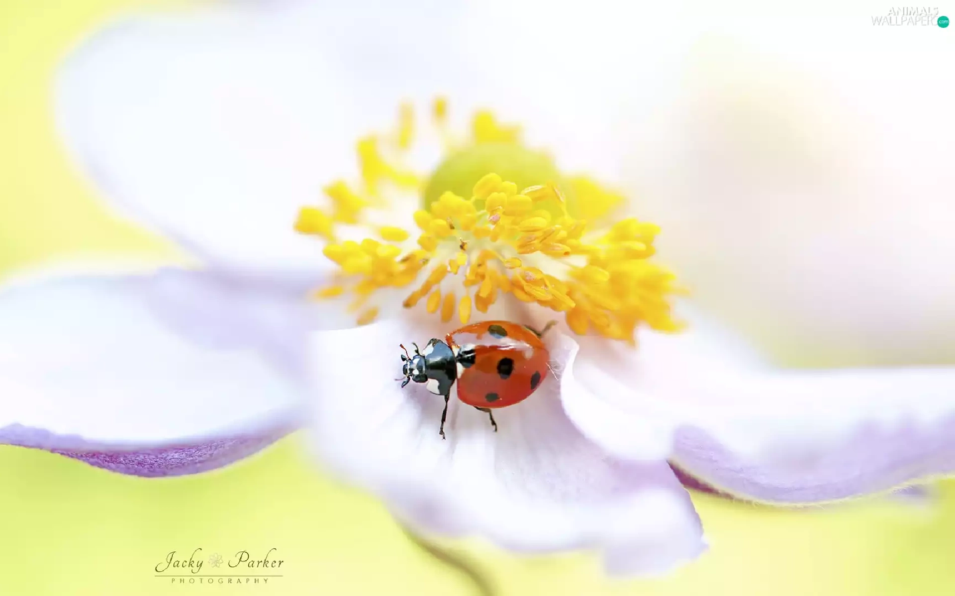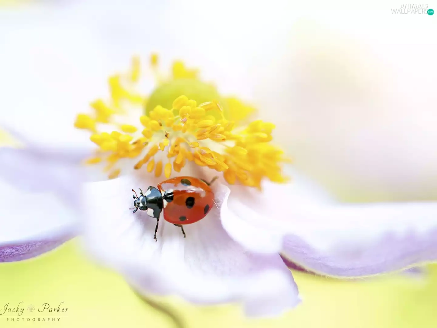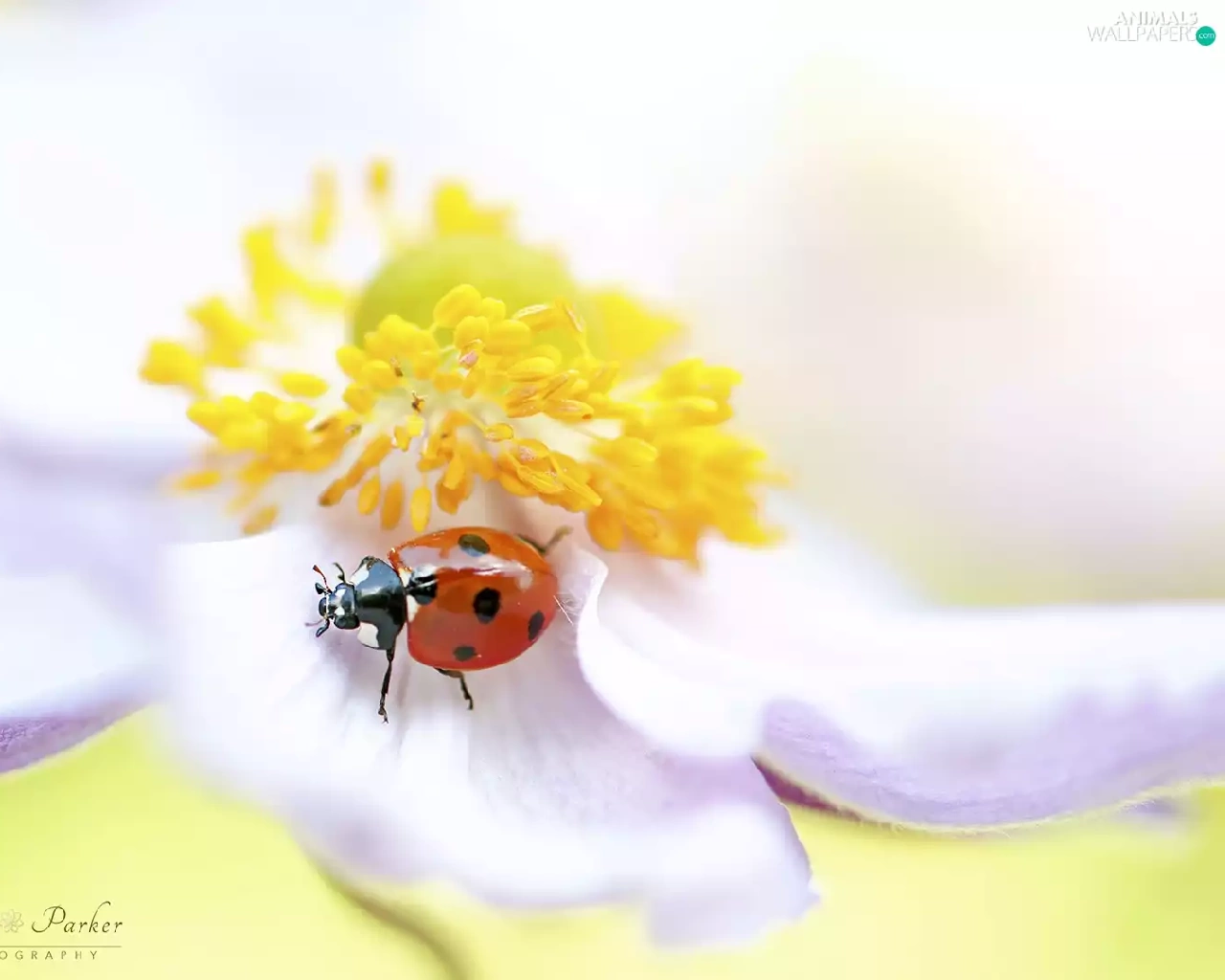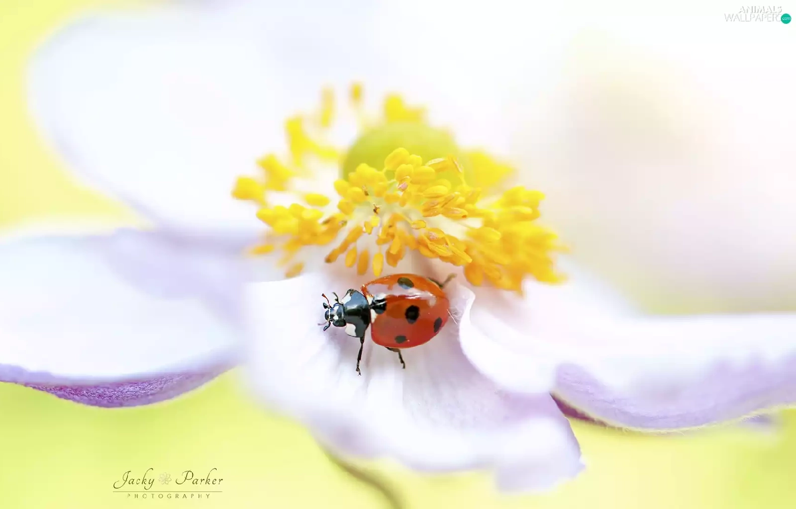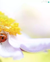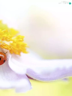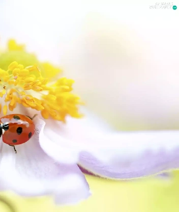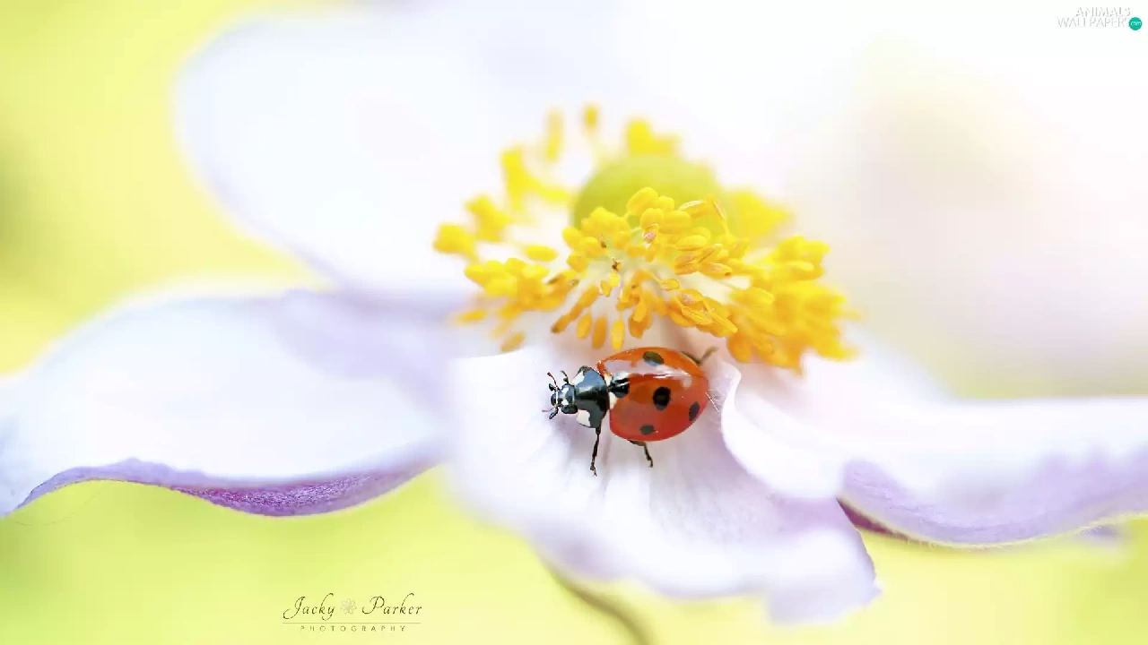 Yellow, White, ladybird, anemone, Colourfull Flowers, rods, Close